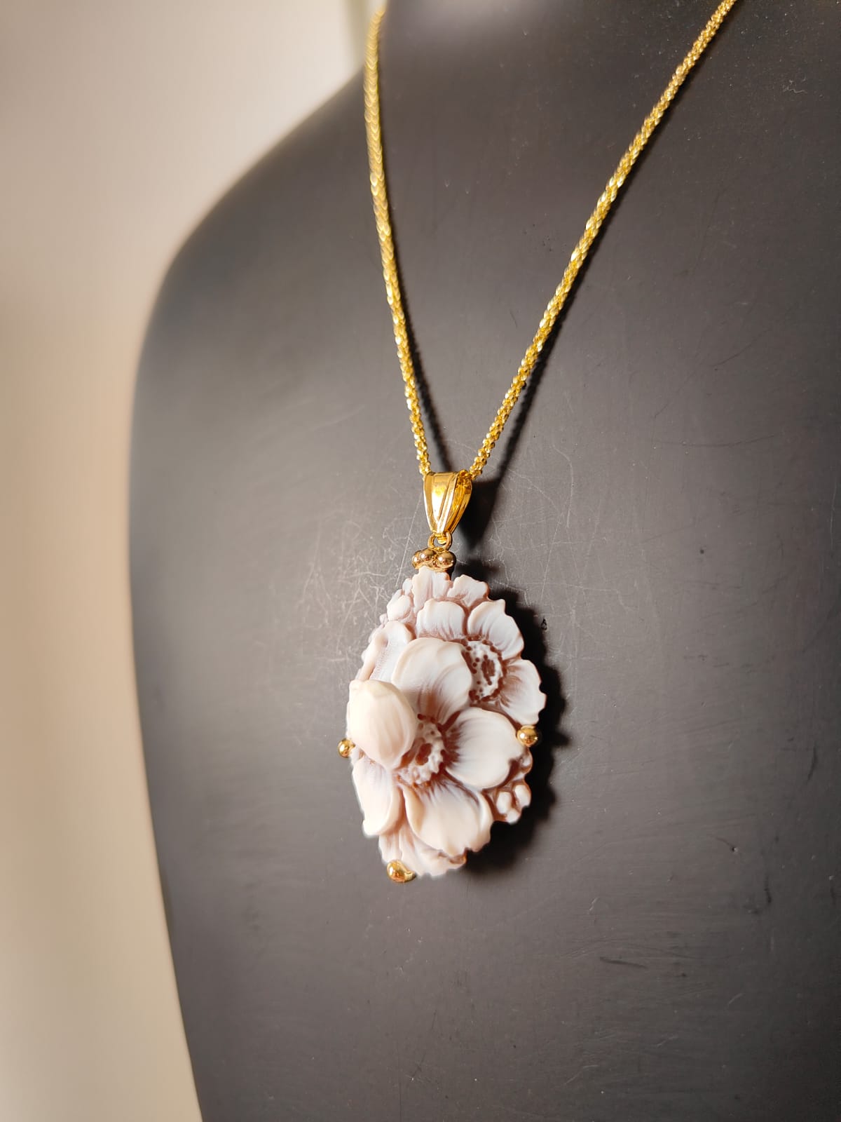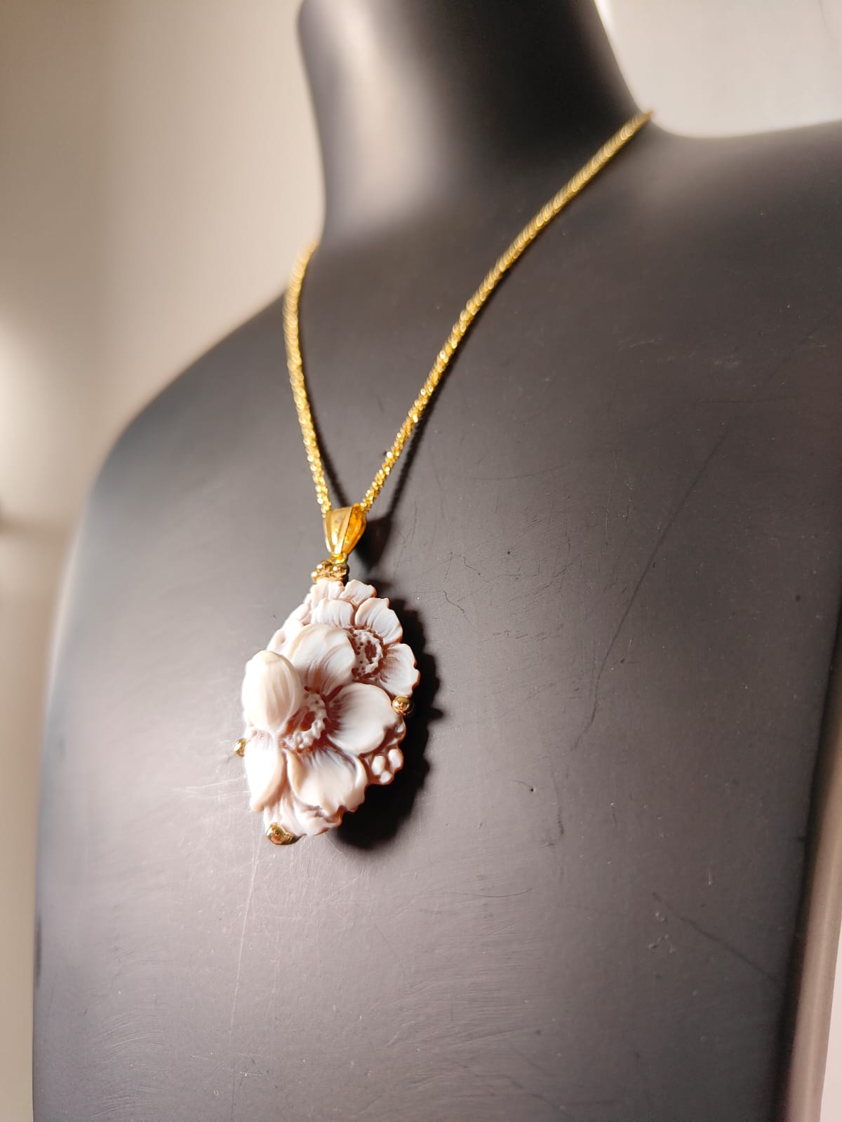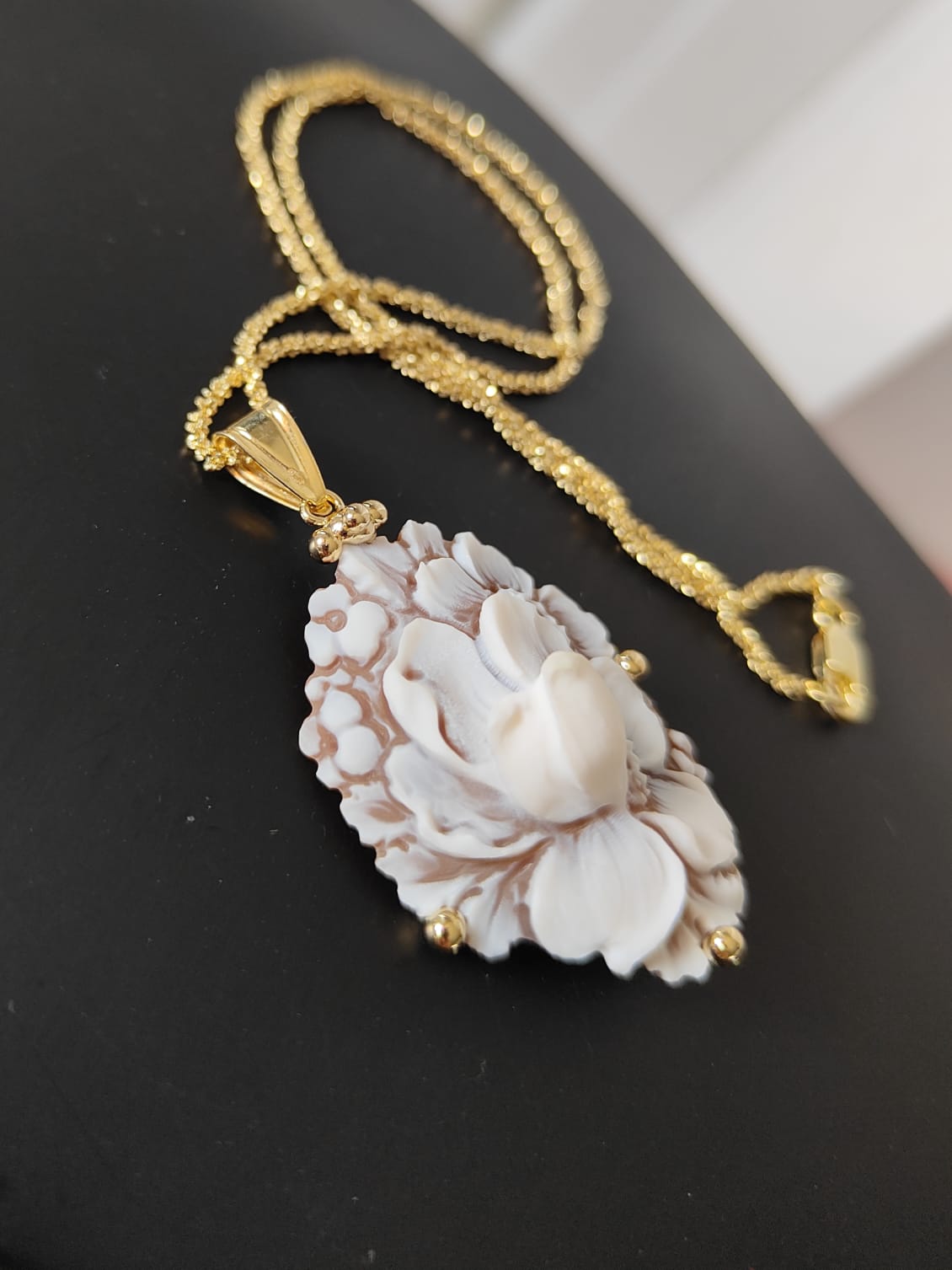 La collana riprende la delicatezza degli orecchini: il cammeo fiore sfioccato incorniciato dall’argento placcato oro diventa un punto luce delicato ma ricco di personalità. La catena sottile permette al ciondolo di essere protagonista senza risultare pesante, armonizzandosi con ogni tipo di outfit, da quello quotidiano a quello più elegante.