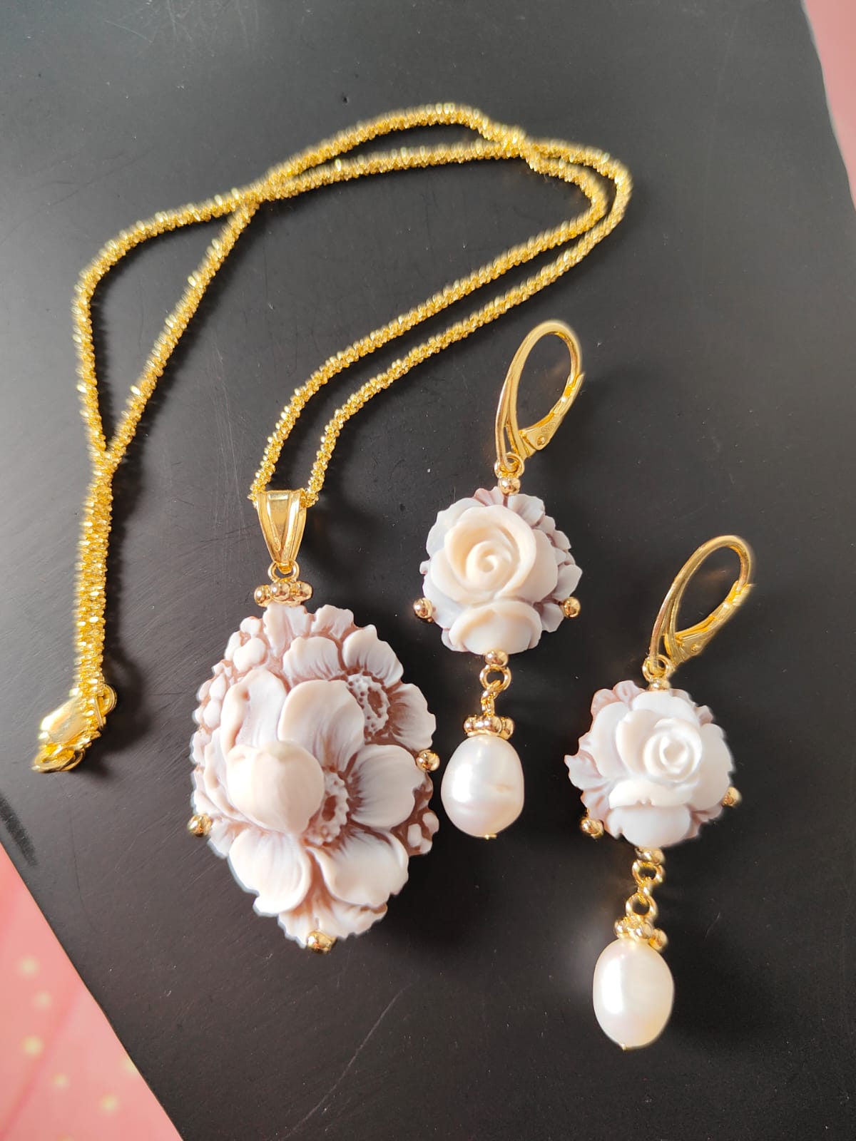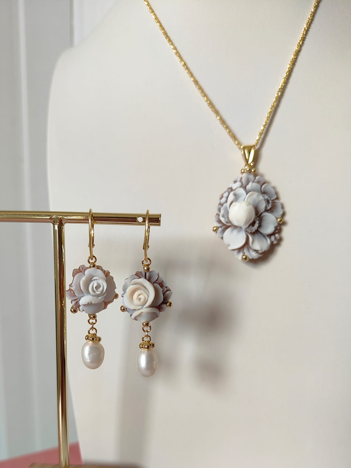 Materiali: cammei incisi a mano su conchiglia, argento 925 placcato oro, perle naturali.