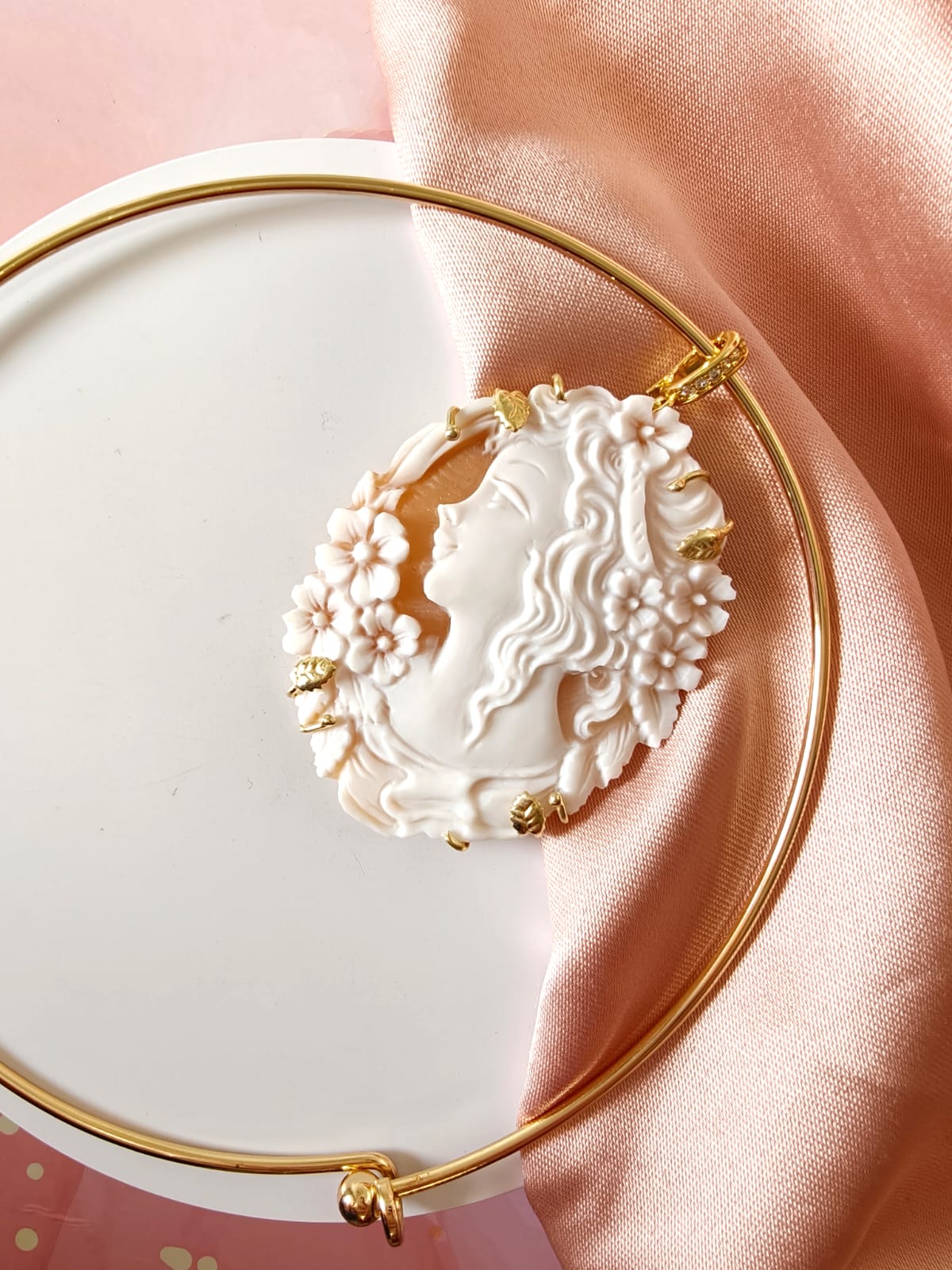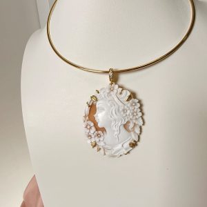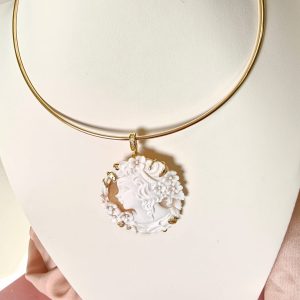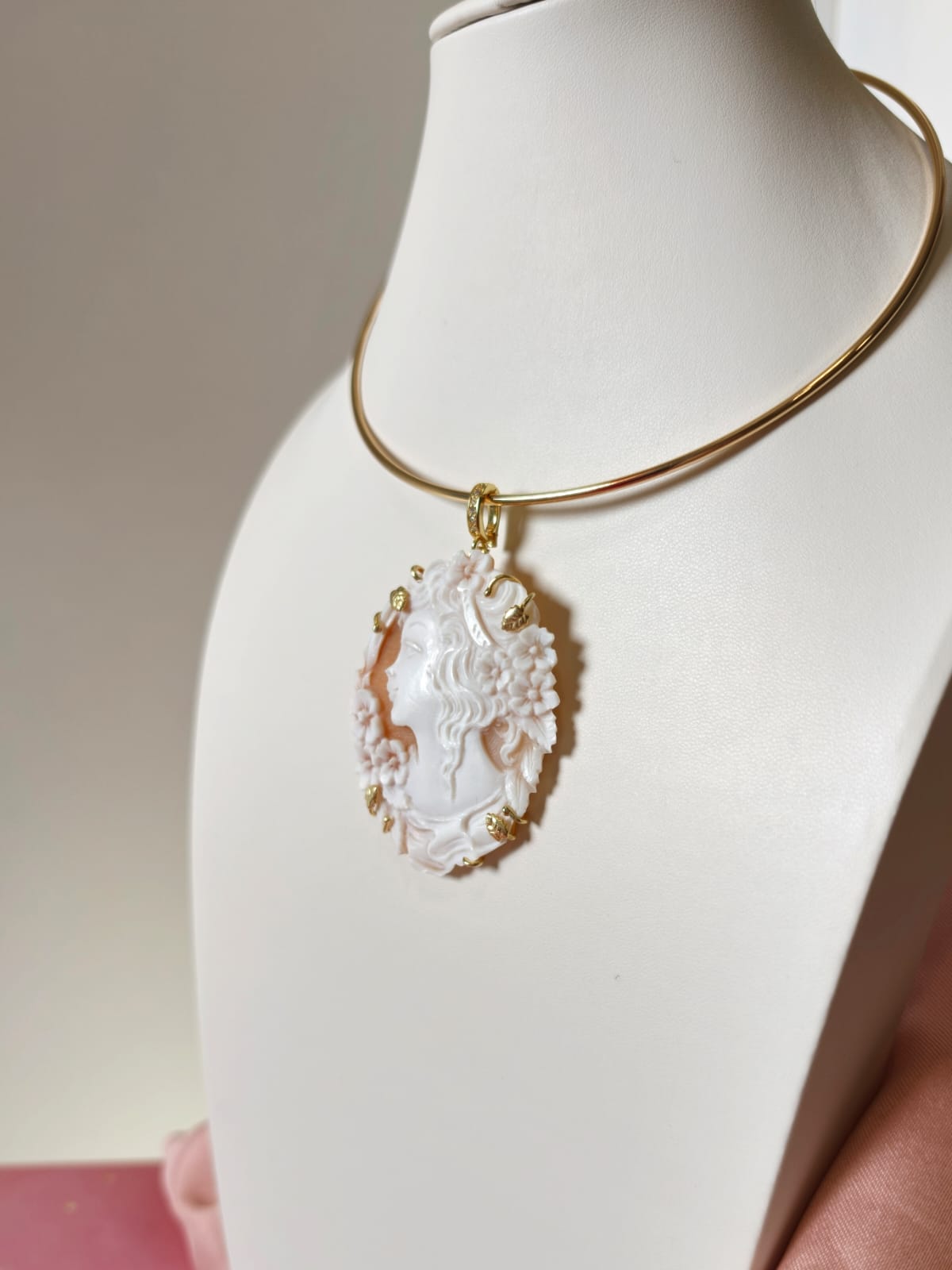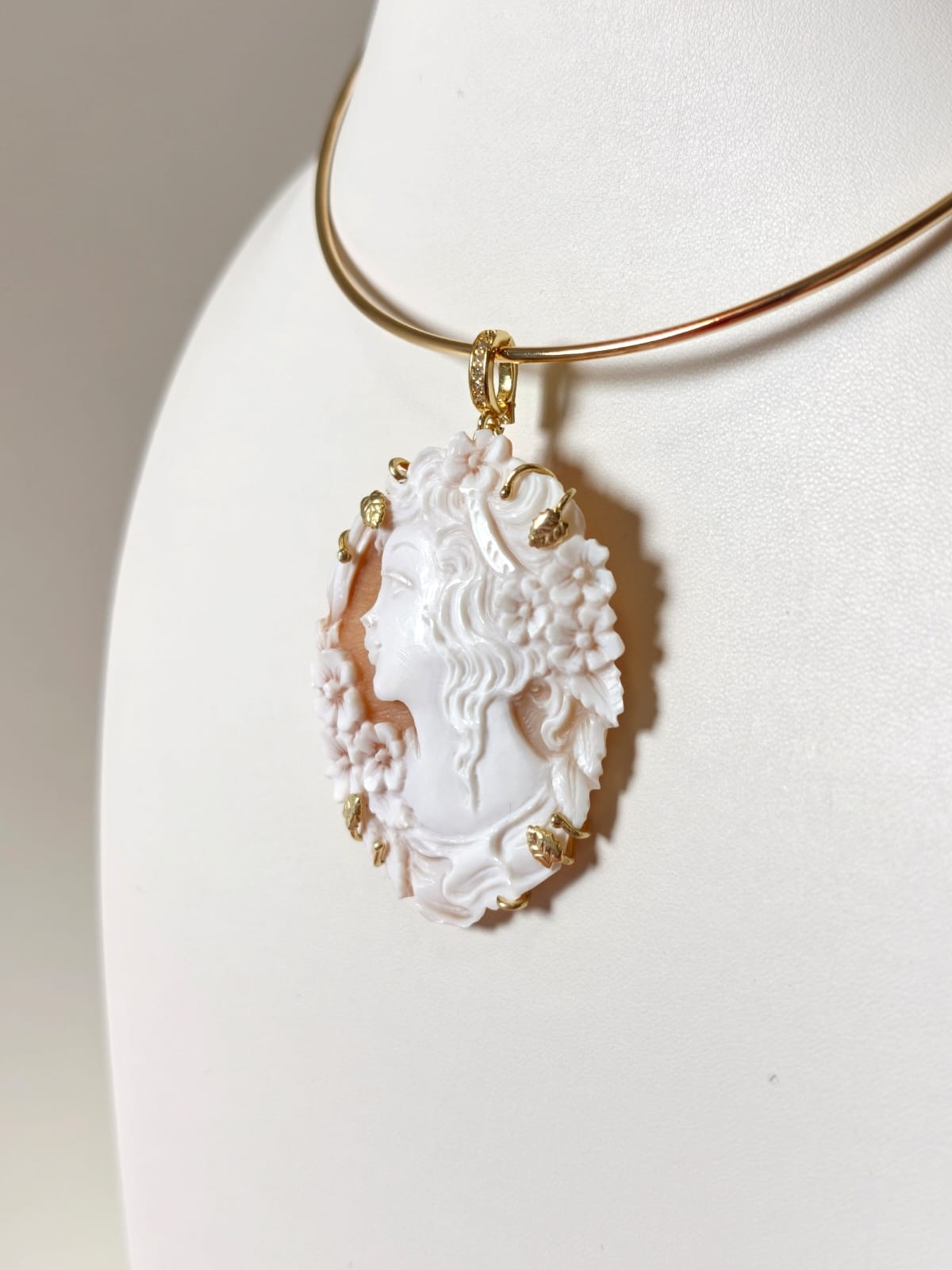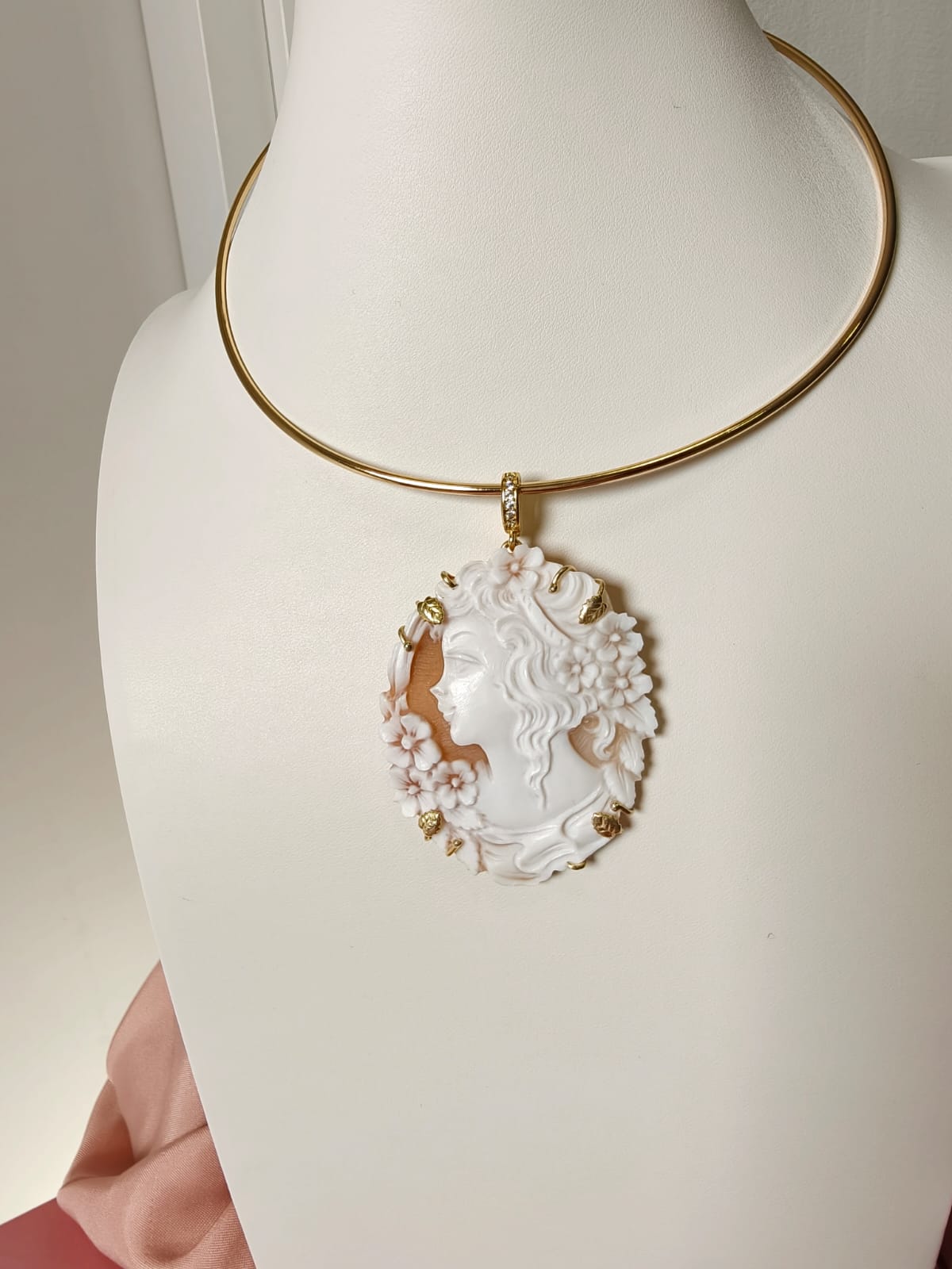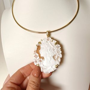 Il ciondolo raffigura un profilo femminile classico, circondato da elementi floreali scolpiti con grande precisione. Ogni dettaglio nasce da un’incisione manuale attenta, eseguita secondo le tecniche storiche tramandate nel tempo. Per questo motivo, ogni cammeo racconta una storia diversa, fatta di gesti lenti e sapienti.