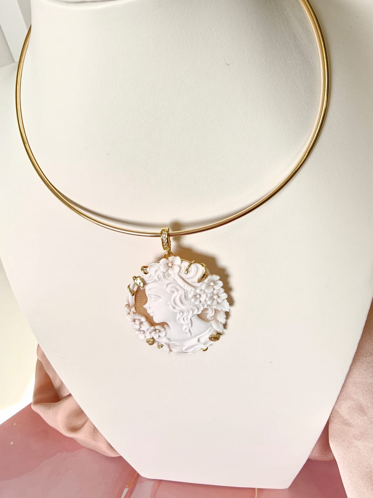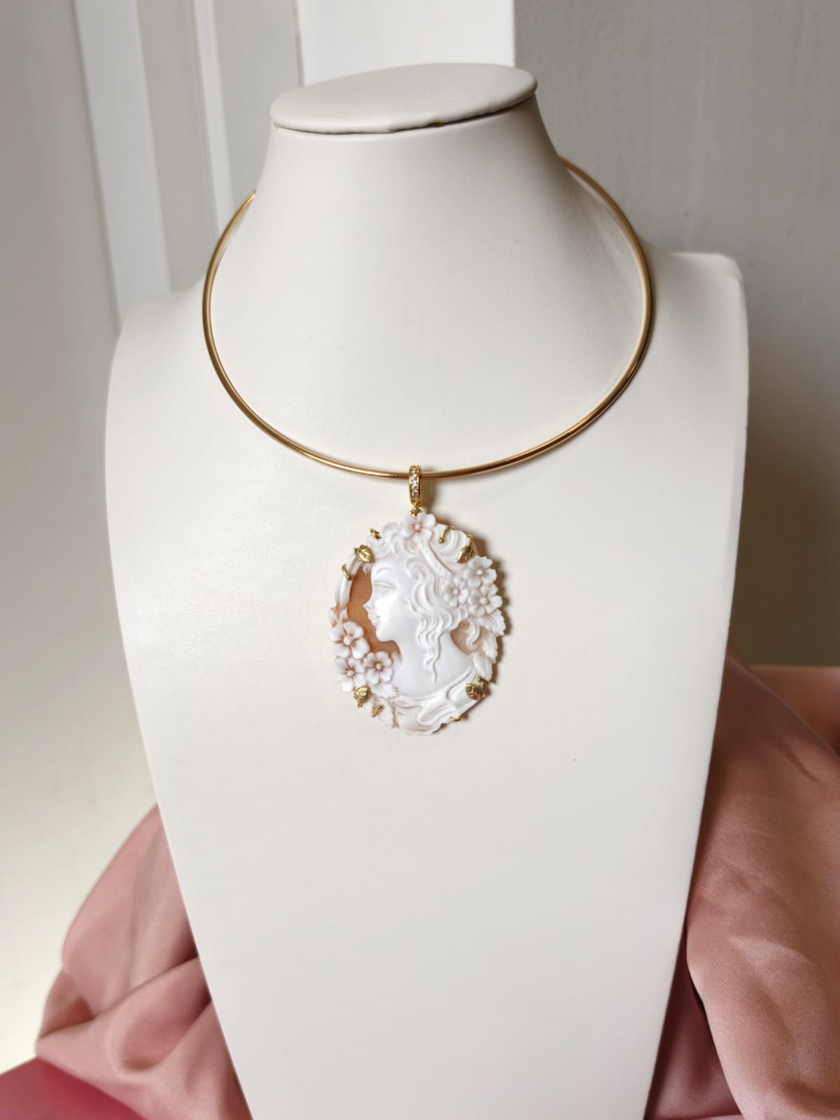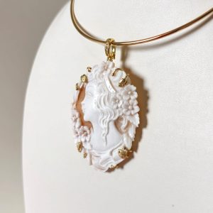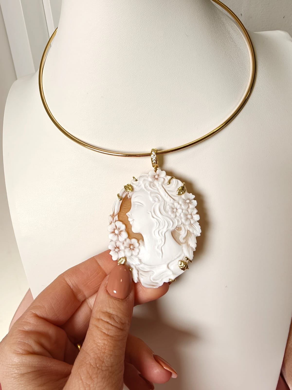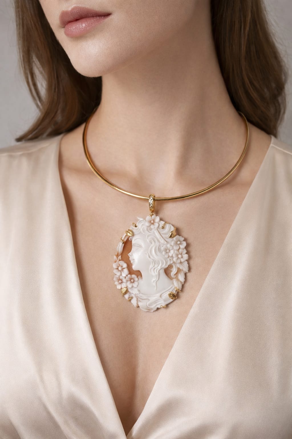 Il ciondolo raffigura un profilo femminile classico, circondato da elementi floreali scolpiti con grande precisione. Ogni dettaglio nasce da un’incisione manuale attenta, eseguita secondo le tecniche storiche tramandate nel tempo. Per questo motivo, ogni cammeo racconta una storia diversa, fatta di gesti lenti e sapienti.
