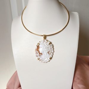 Il cammeo Torre del Greco è il cuore di questa collana dal fascino senza tempo, una creazione che unisce tradizione, raffinatezza e lavorazione artigianale italiana. Fin dal primo sguardo, il ciondolo cattura l’attenzione grazie alla delicatezza delle incisioni e alla luminosità naturale della conchiglia.