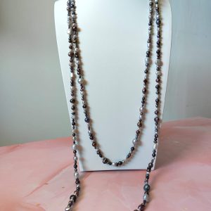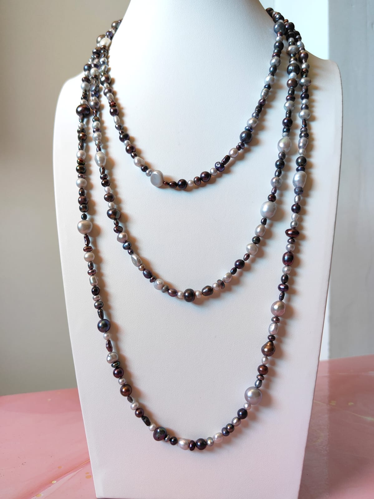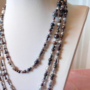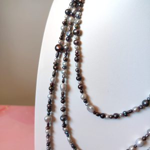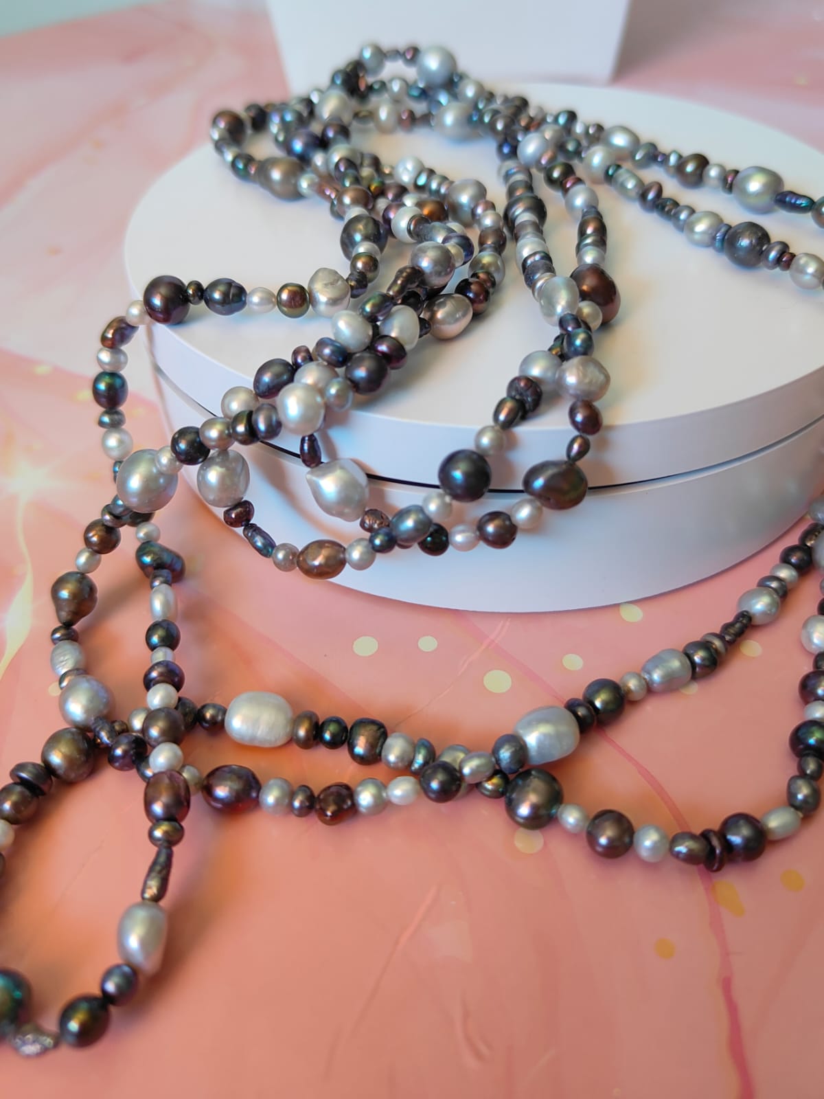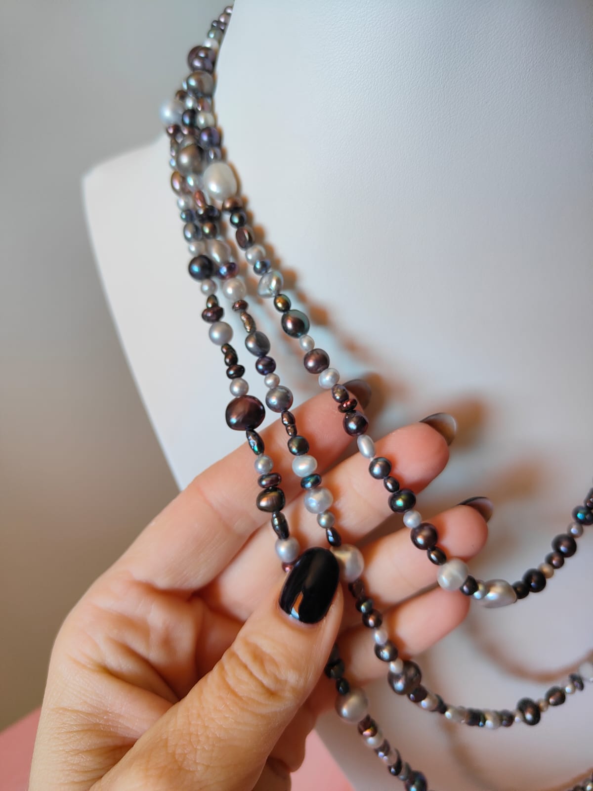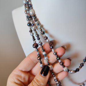 Questa collana charleston perle grigie e nere è pensata per chi ama uno stile elegante ma contemporaneo. Misura 180 cm e non presenta chiusura, quindi può essere indossata in modi diversi. Puoi portarla lunga, avvolta a più giri oppure annodata per un punto luce centrale. Inoltre, grazie alla sua struttura fluida, risulta comoda e leggera.