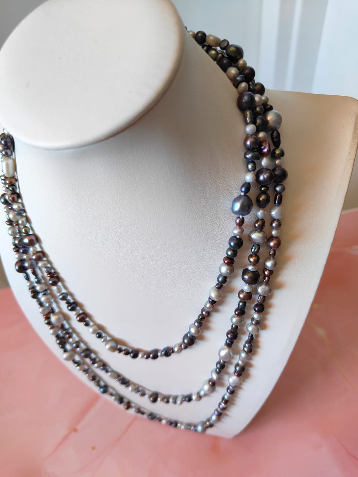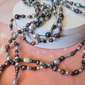 Le perle naturali hanno forme barocche irregolari e superfici luminose. I toni spaziano dal grigio perla all’antracite scuro. Presentano anche riflessi cromatici nero lucente e accenti bronzo. Inoltre, alcune perle più chiare creano contrasto e aggiungono equilibrio alla composizione.