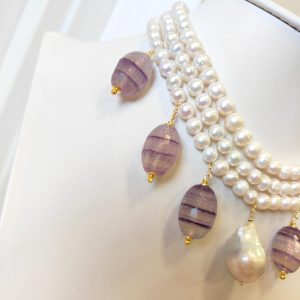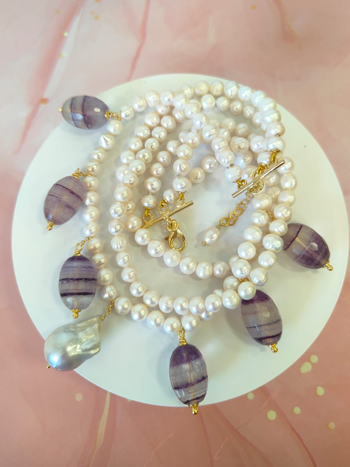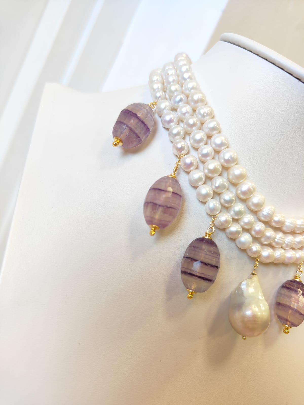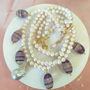 Materiali: perle naturali, fluorite naturale, perla barocca naturale
