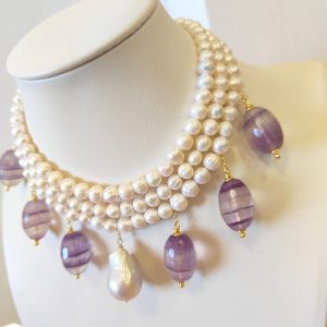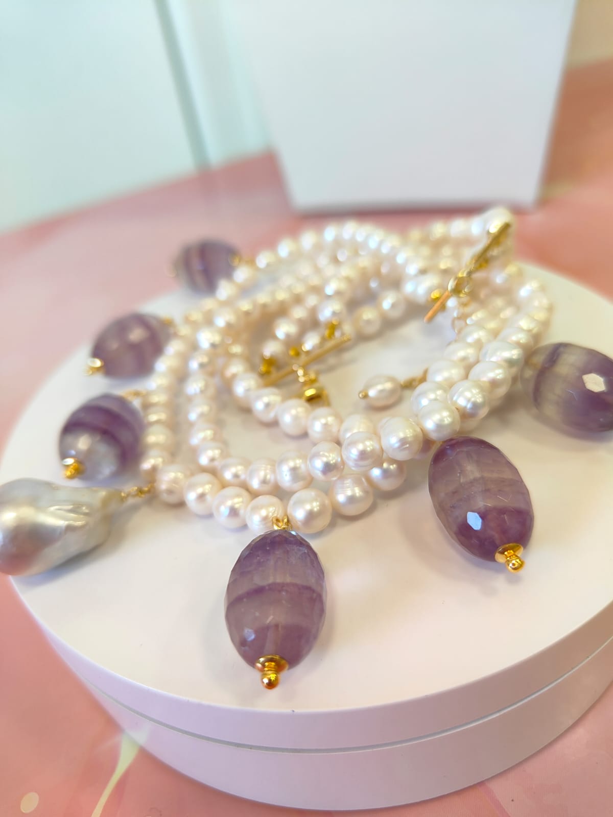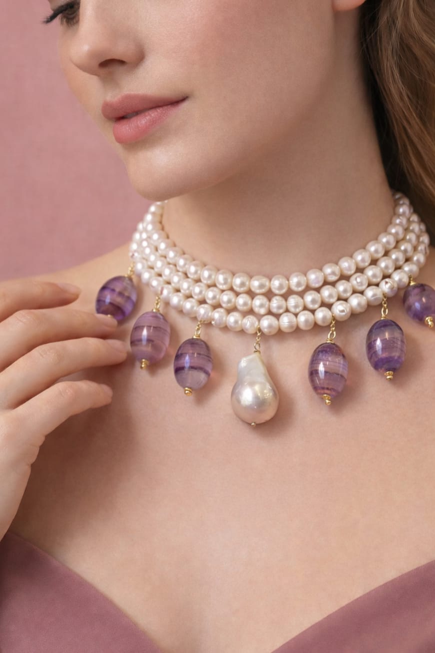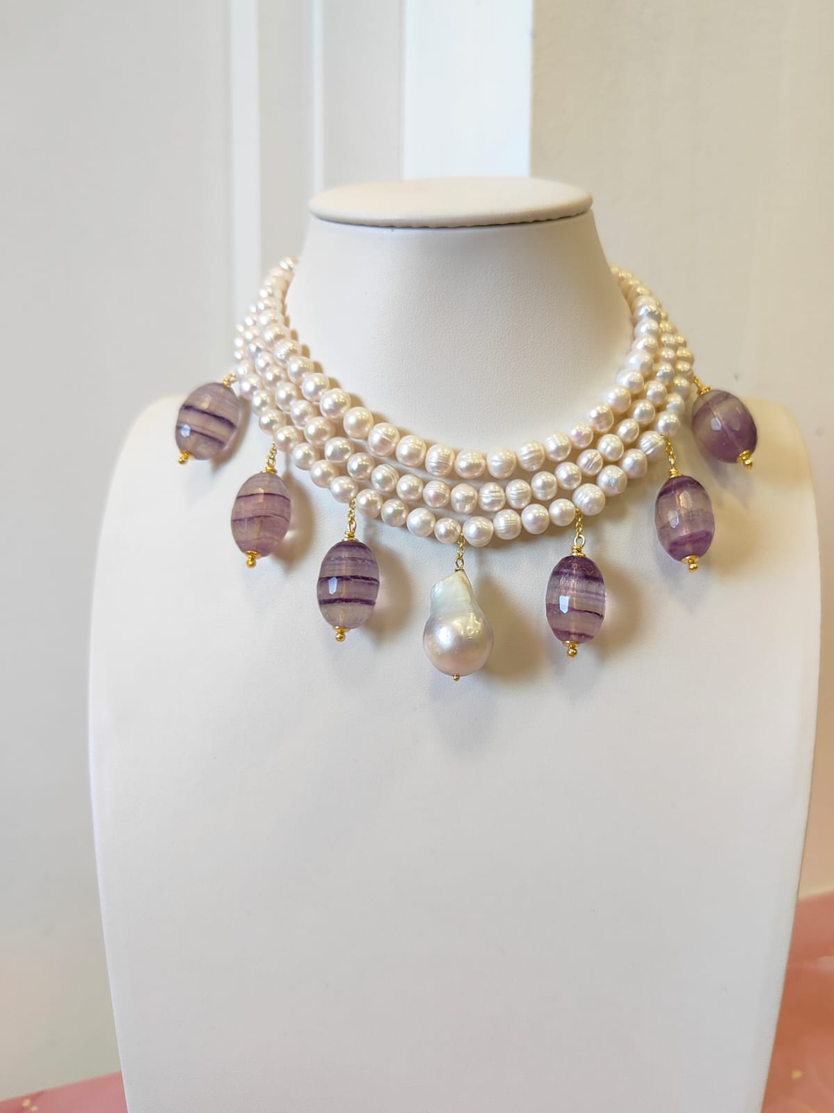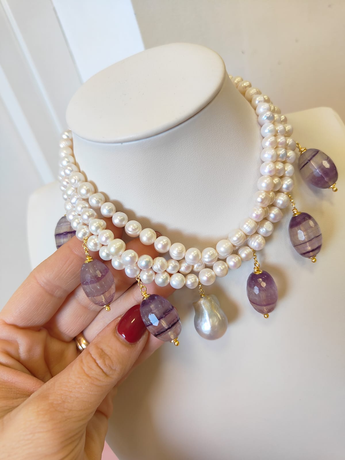 A impreziosire il design, una serie di pendenti in fluorite viola sfaccettata, scelti per le loro naturali sfumature che variano dal lilla tenue al viola più intenso. Ogni elemento in fluorite è diverso dall’altro, rendendo il ritmo visivo del gioiello dinamico e raffinato. Al centro, una perla barocca naturale pendente diventa il fulcro della composizione: la sua forma organica e la lucentezza setosa aggiungono un tocco scultoreo e distintivo.