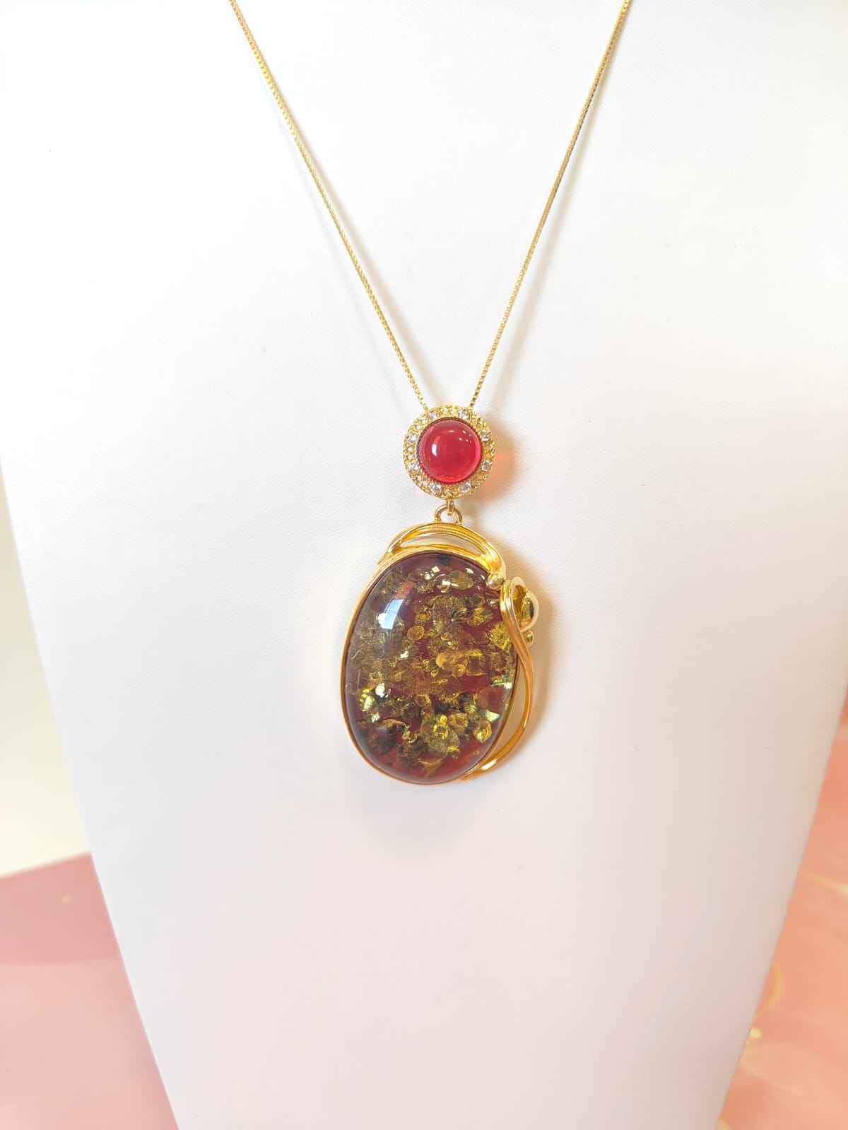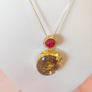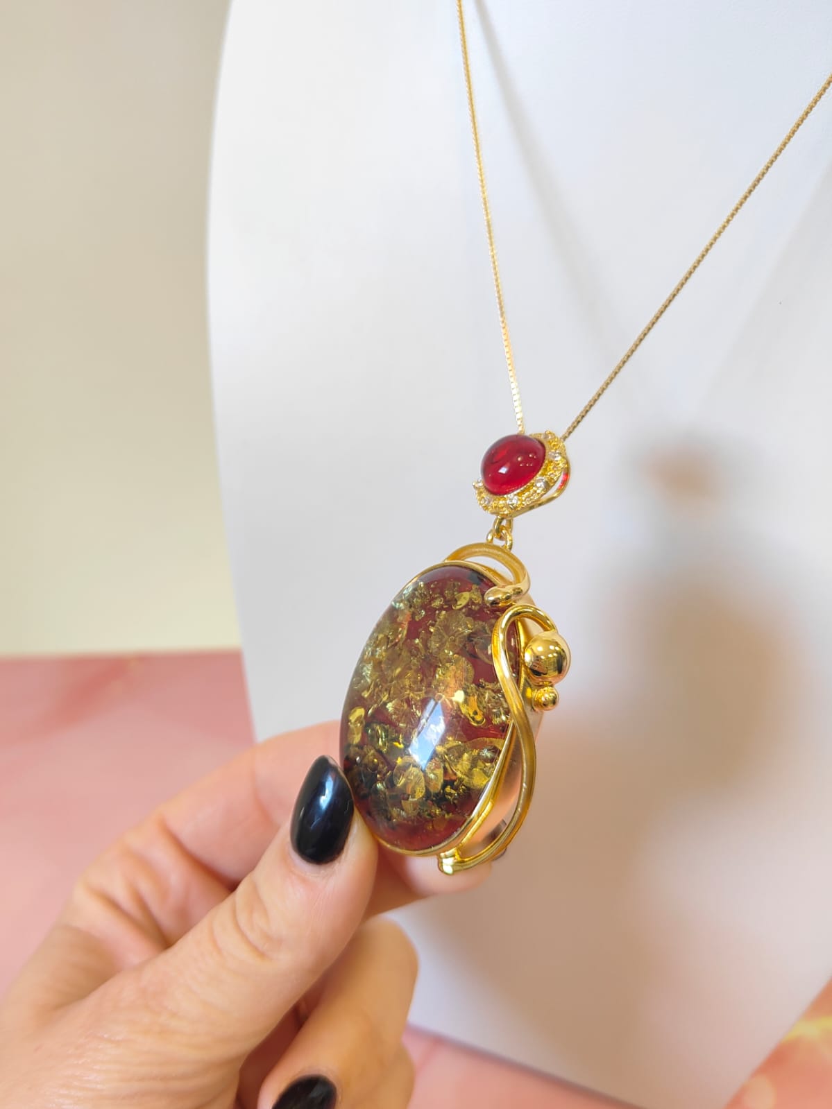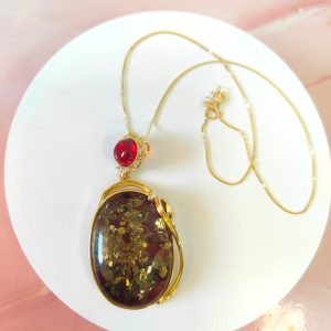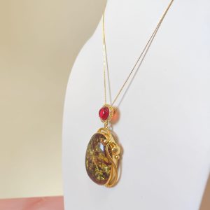 Materiali: ambra baltica naturale, cristalli, elemento rosso cabochon