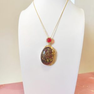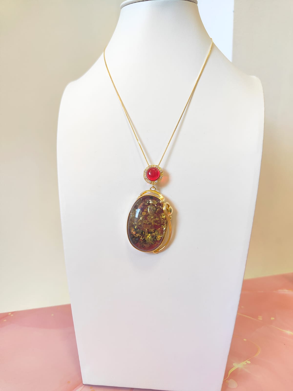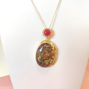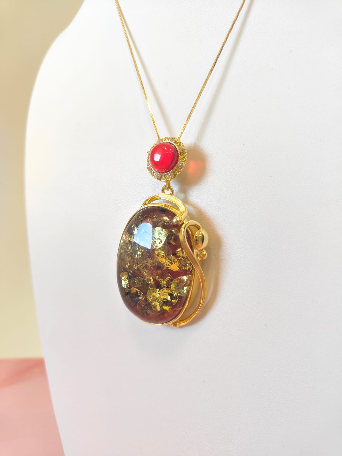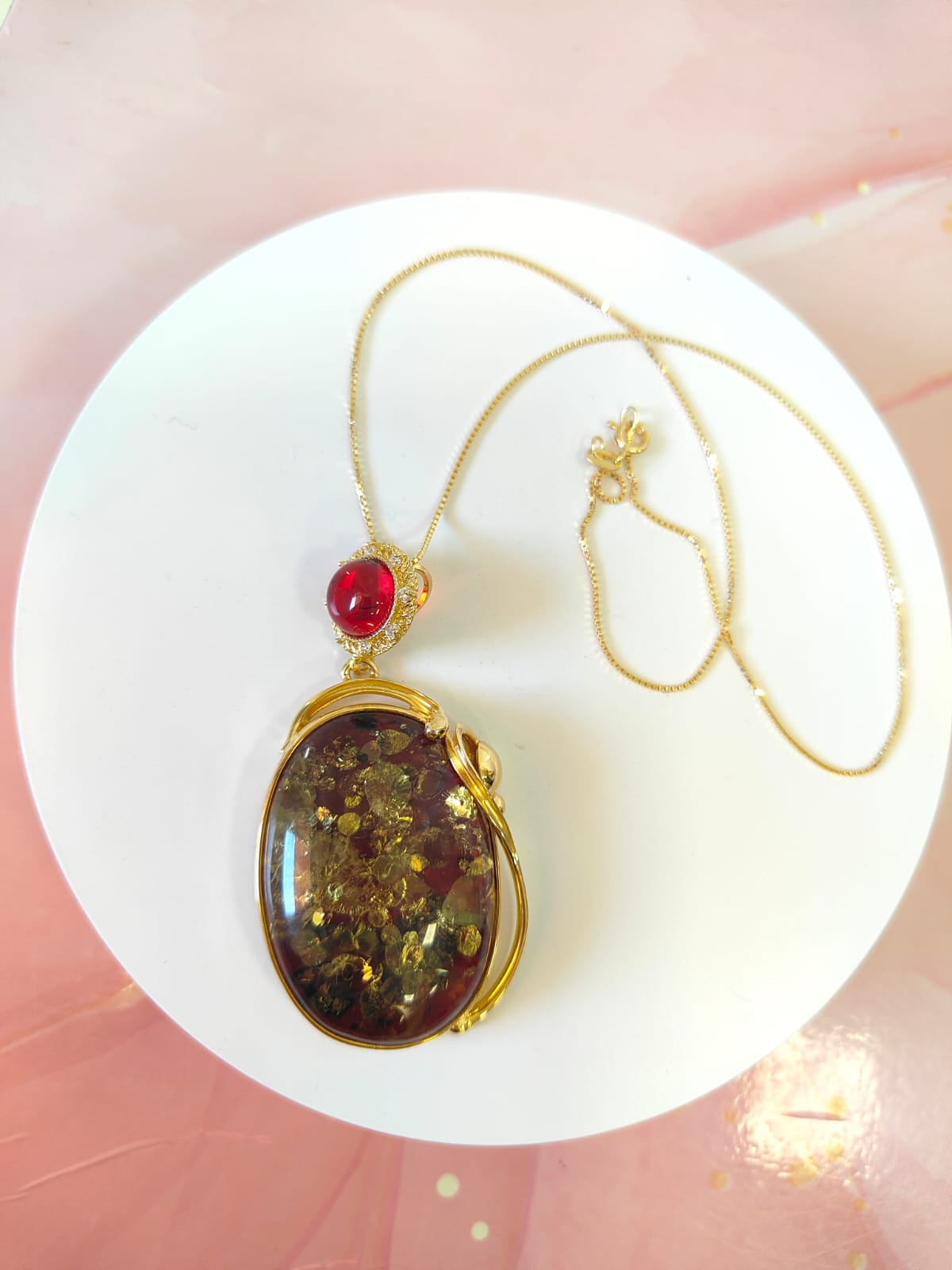 Materiali: ambra baltica naturale, cristalli, elemento rosso cabochon
