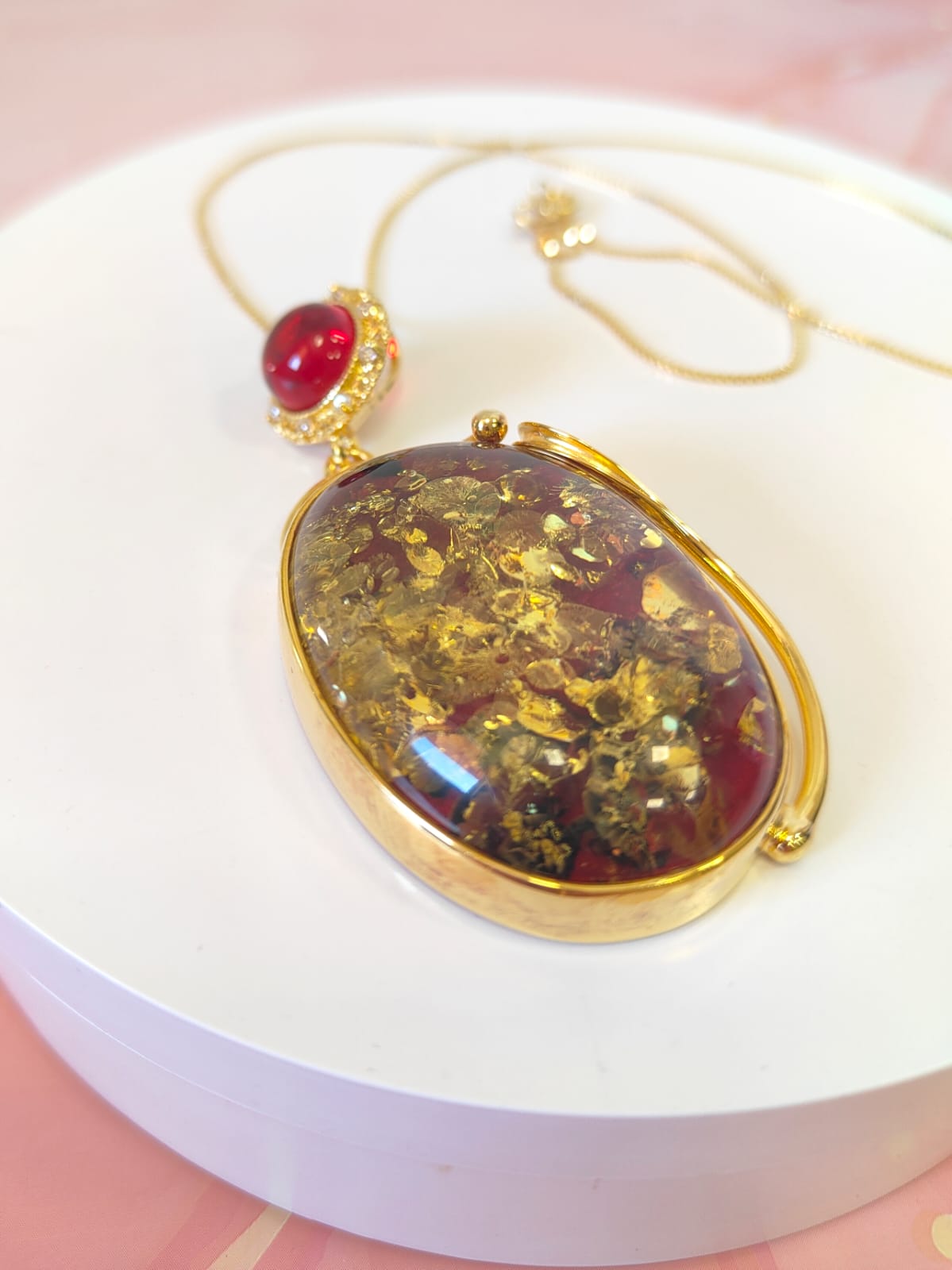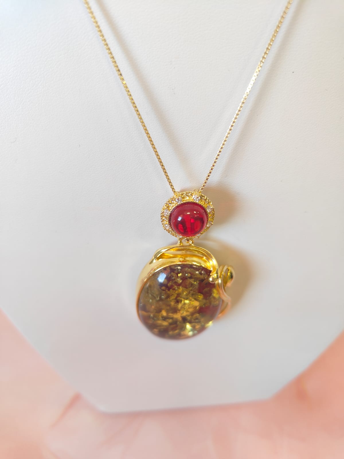 Il Ciondolo Ambra Baltica Su Collana In Argento Dorato è una creazione luminosa e raffinata, pensata per chi desidera un gioiello importante, ma allo stesso tempo versatile. Il pendente ovale in ambra baltica naturale presenta sfumature calde che spaziano dal miele al cognac, illuminate da riflessi interni irregolari che catturano la luce ad ogni movimento. La montatura in argento 925 placcato oro abbraccia la pietra con linee morbide e sinuose, creando un contrasto elegante con il dettaglio superiore rosso, incorniciato da piccoli cristalli luminosi.