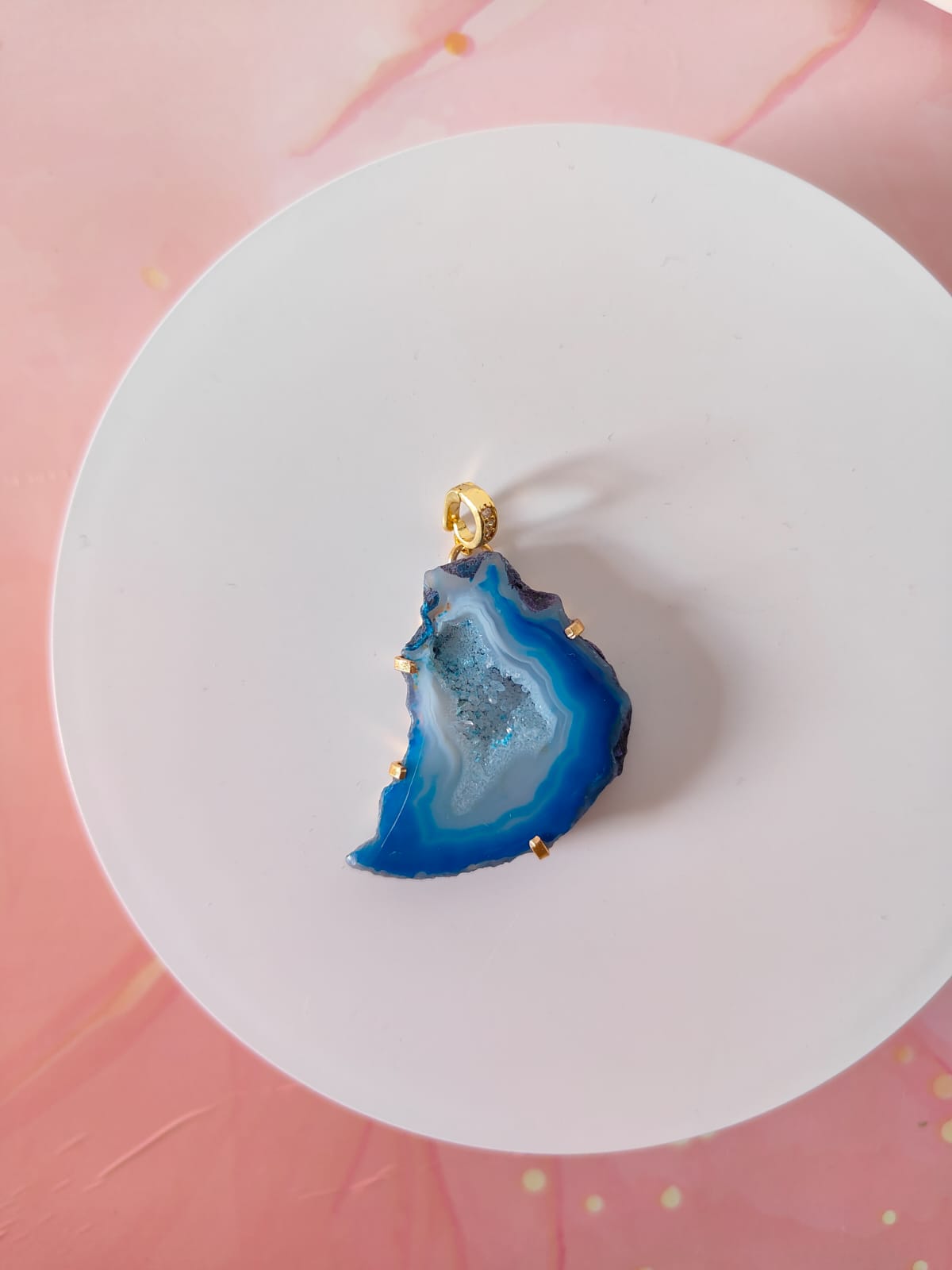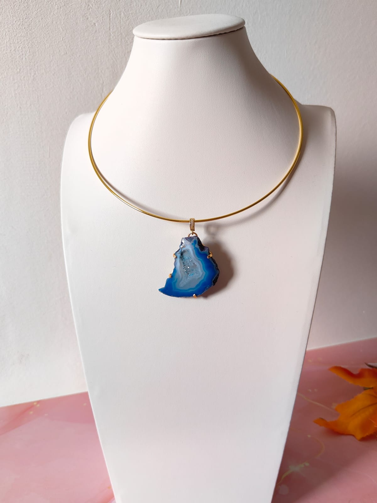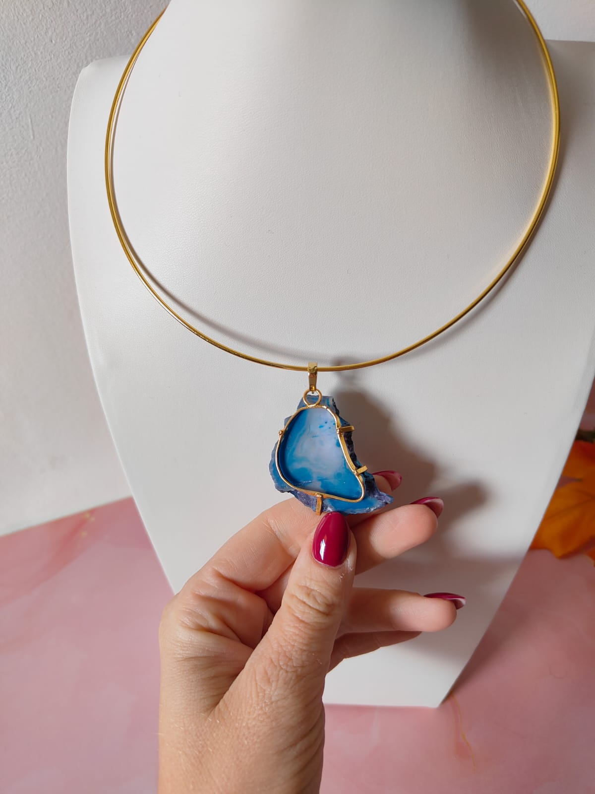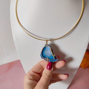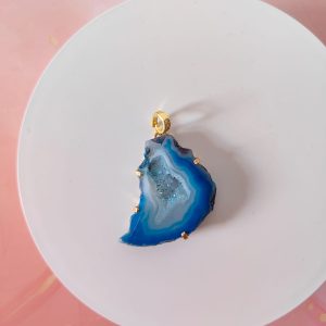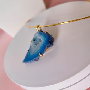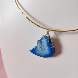 Il ciondolo drusa blu è una creazione che celebra la bellezza della natura in chiave contemporanea. La pietra, tagliata e incastonata a mano, presenta sfumature che vanno dall’azzurro cielo al blu profondo, con un cuore di cristalli scintillanti che cattura la luce in modo unico. Ogni riflesso sembra raccontare una storia, rendendo questo gioiello magnetico e raffinato.