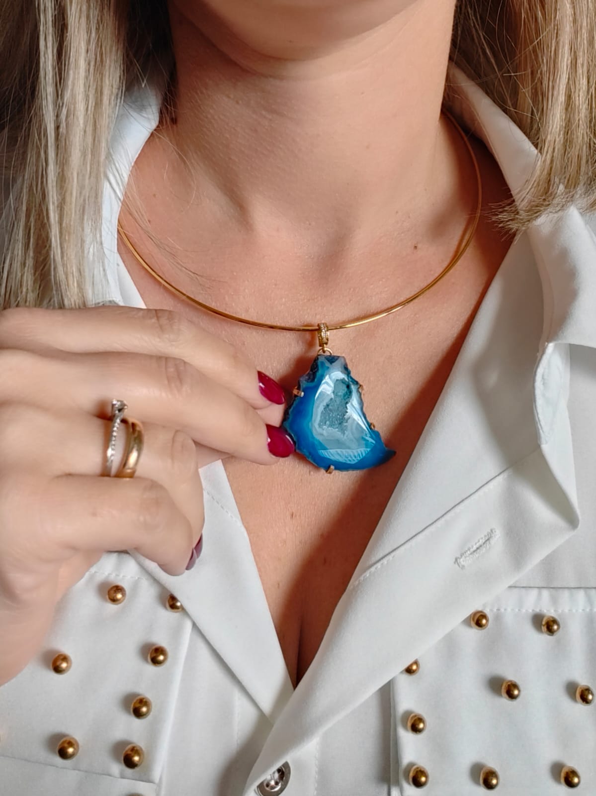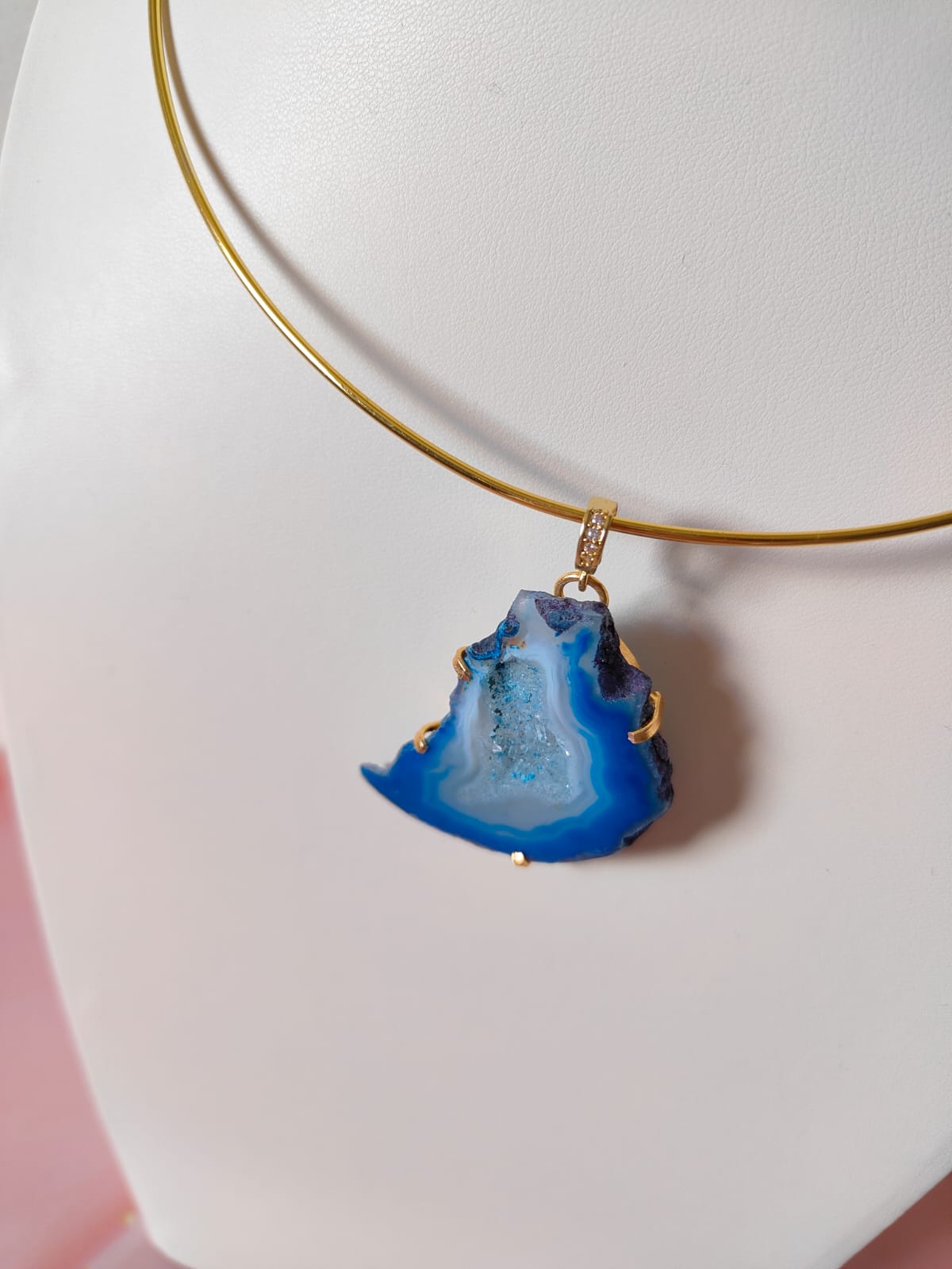 La drusa è incastonata in una montatura dorata aperta, che lascia intravedere i bordi naturali della pietra. Questo dettaglio mette in risalto la sua forma irregolare e ne preserva l’autenticità. Il gancio dorato, decorato da zirconi luminosi, aggiunge brillantezza e armonia al design complessivo.