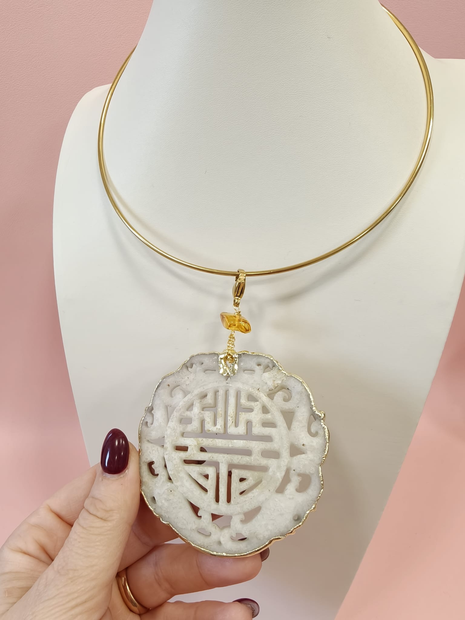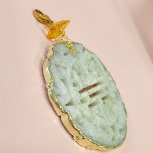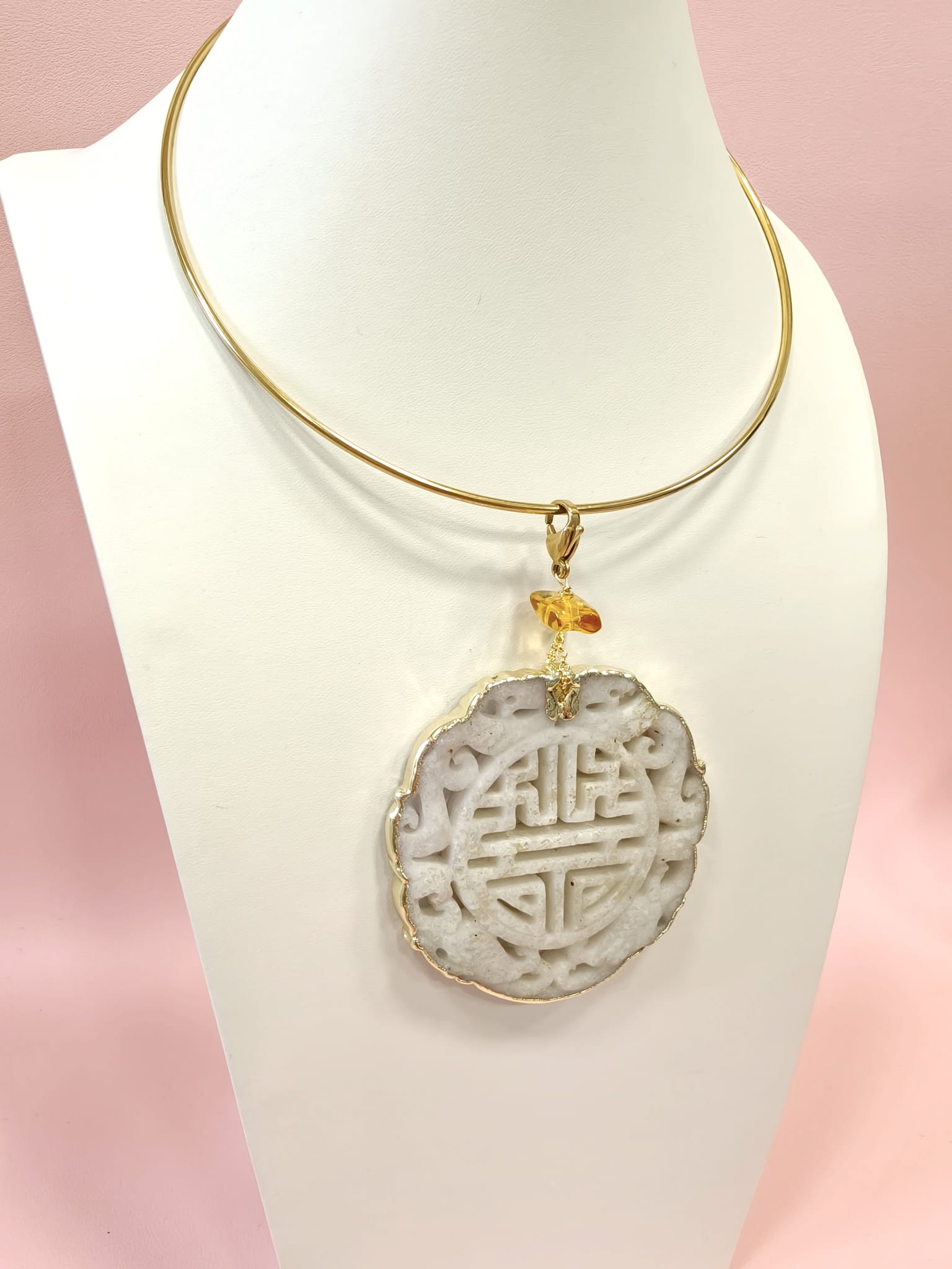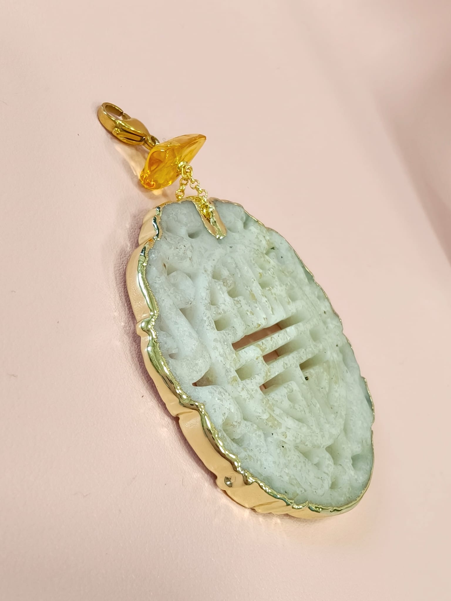 Il ciondolo mandala giada con ambra è un gioiello di forte valore simbolico ed estetico, pensato per chi desidera indossare un segno di armonia e protezione. Il grande mandala traforato in giada antica, rifinito con bordo oro, esprime equilibrio e continuità: il cerchio rappresenta l’unità, mentre il disegno interno richiama l’ordine dell’universo e la ricerca di stabilità interiore.