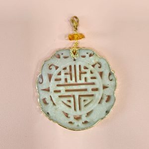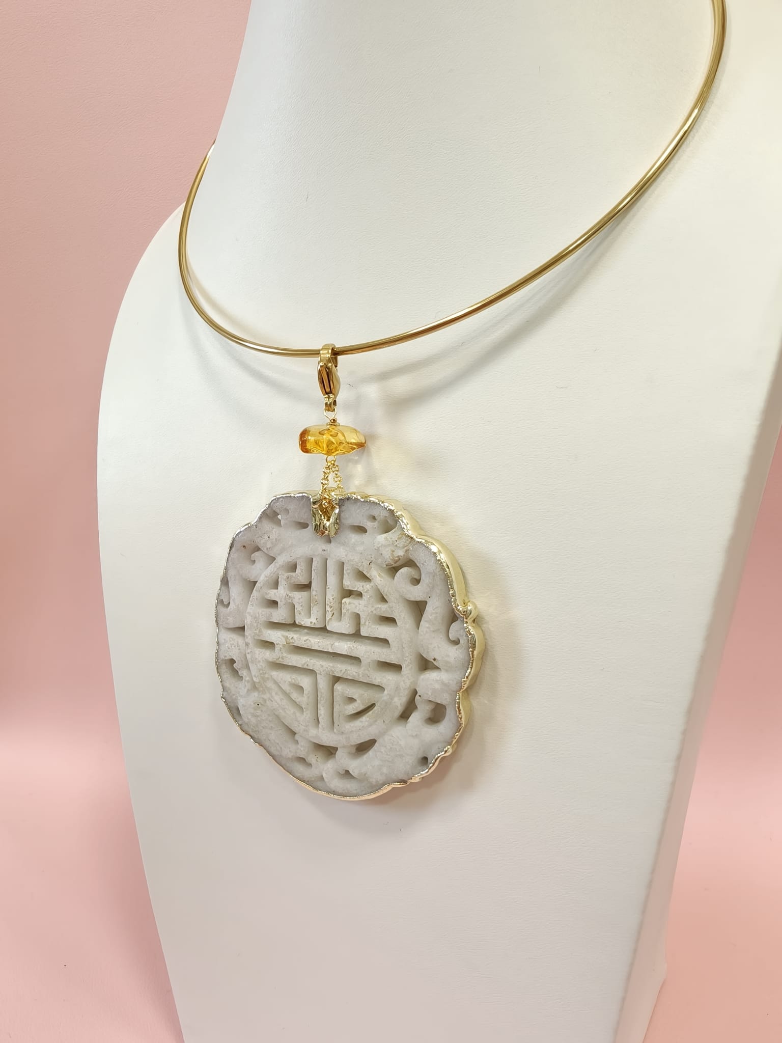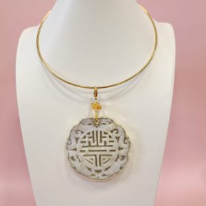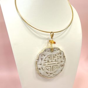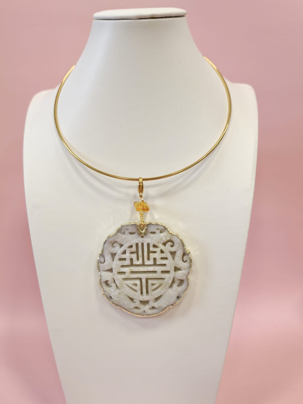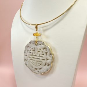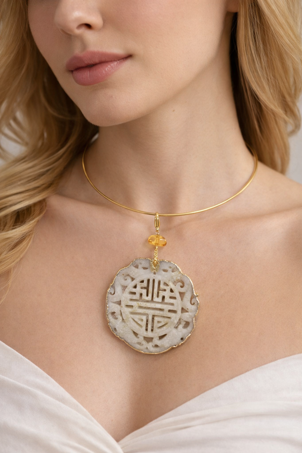 Il ciondolo mandala giada con ambra è un gioiello di forte valore simbolico ed estetico, pensato per chi desidera indossare un segno di armonia e protezione. Il grande mandala traforato in giada antica, rifinito con bordo oro, esprime equilibrio e continuità: il cerchio rappresenta l’unità, mentre il disegno interno richiama l’ordine dell’universo e la ricerca di stabilità interiore.