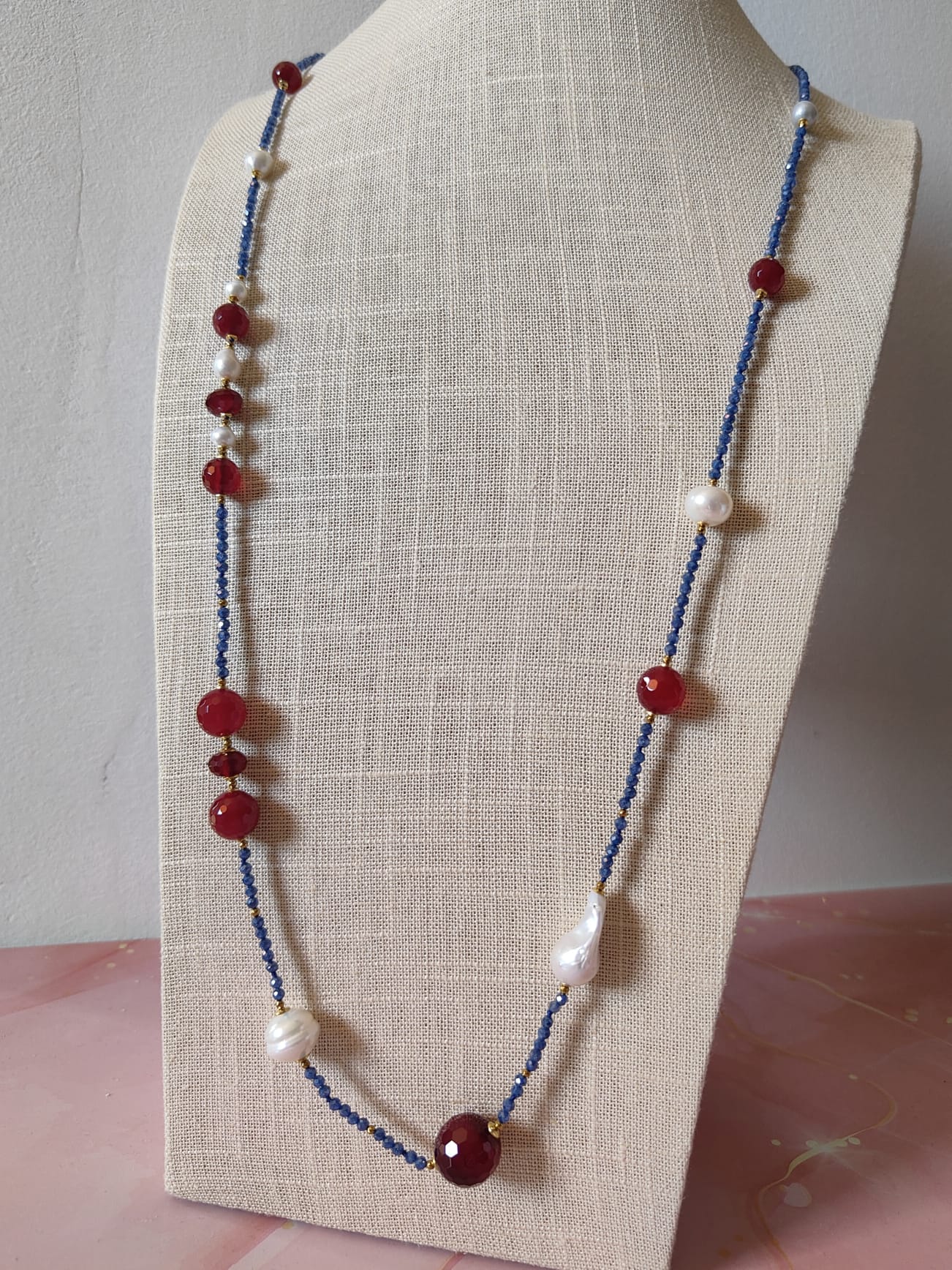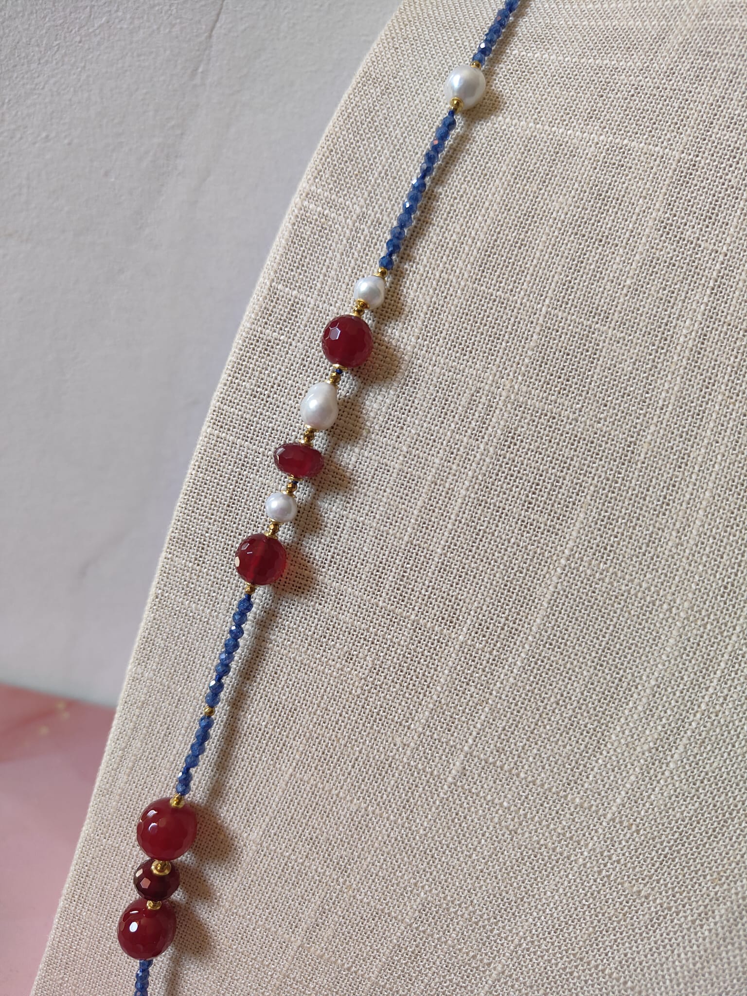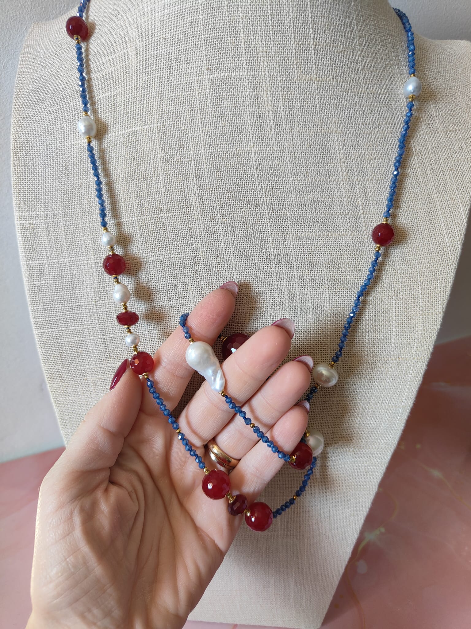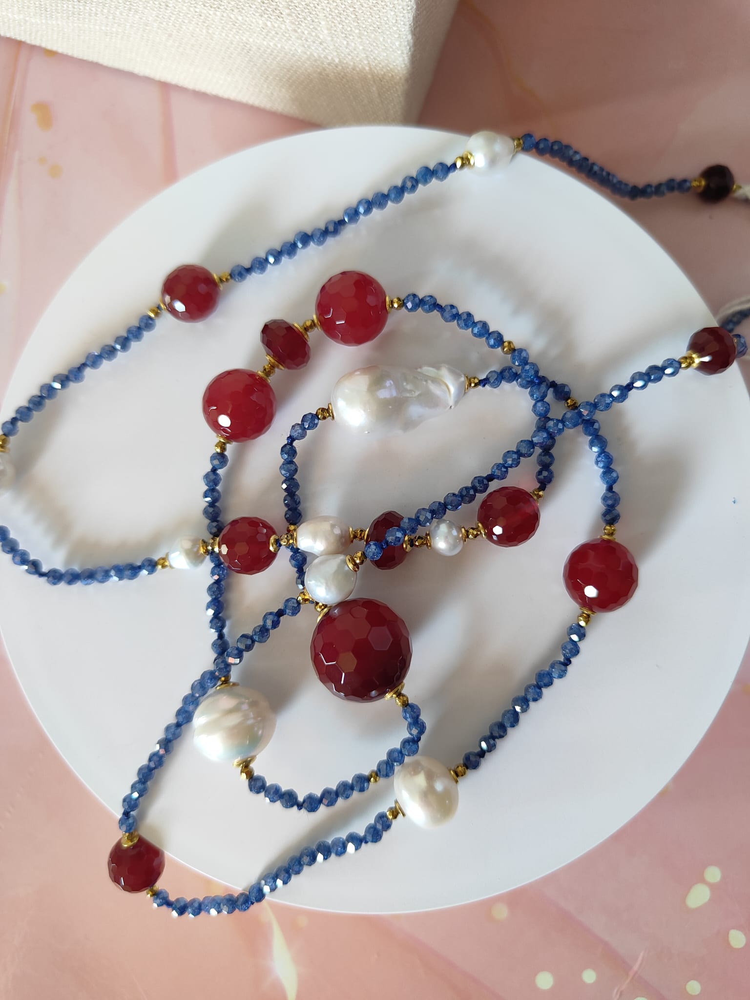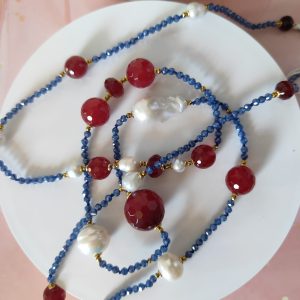 Gli zirconi blu, tagliati a sfaccettature sottili, riflettono la luce con brillantezza e donano dinamismo al design. Le perle barocche, con le loro forme organiche e irripetibili, aggiungono morbidezza e luce naturale, mentre le sfere di agata borgogna esprimono passione e carattere. A completare la composizione, piccoli inserti in ematite dorata creano punti luce caldi e preziosi, bilanciando la palette cromatica con gusto e armonia.