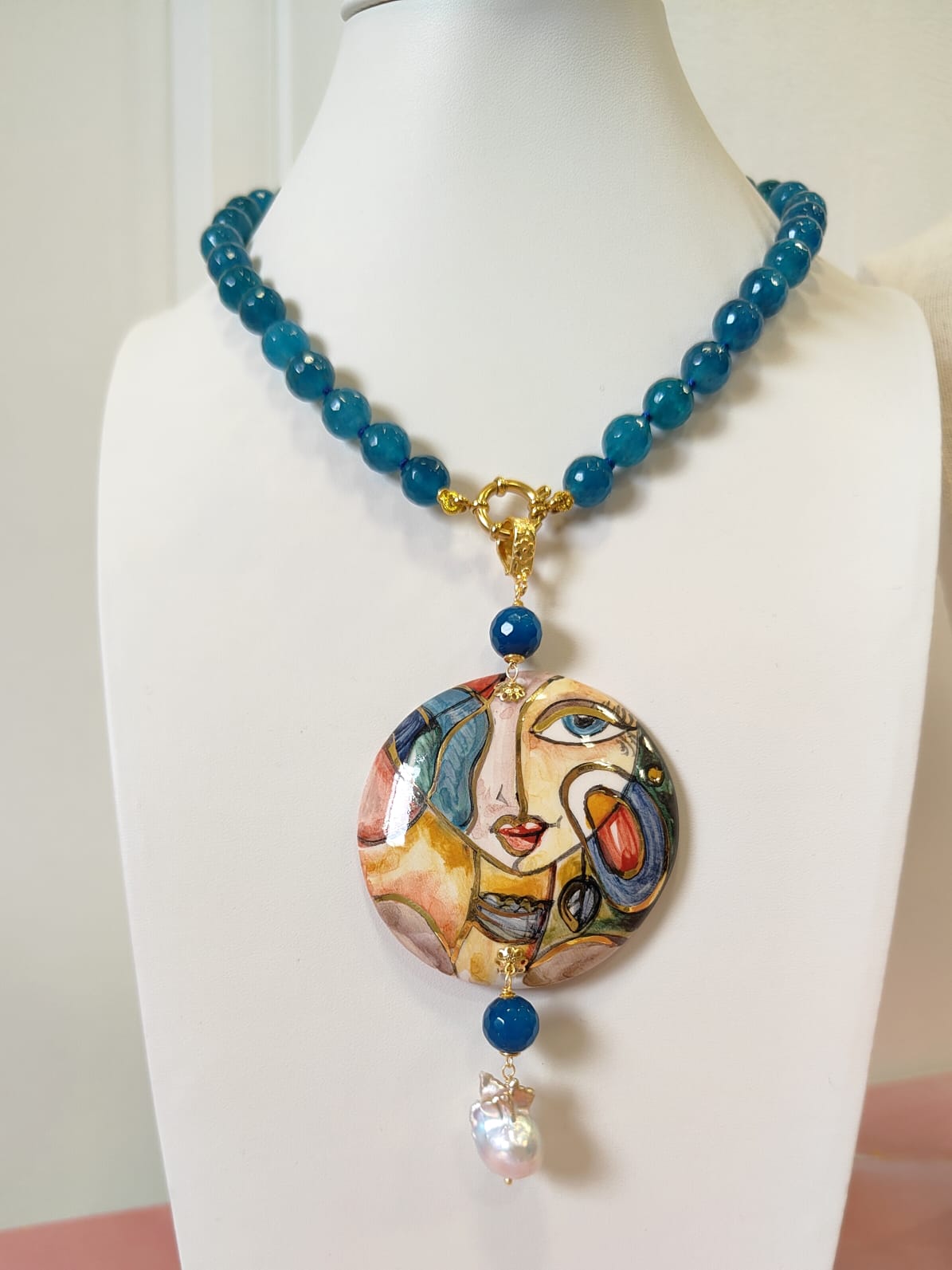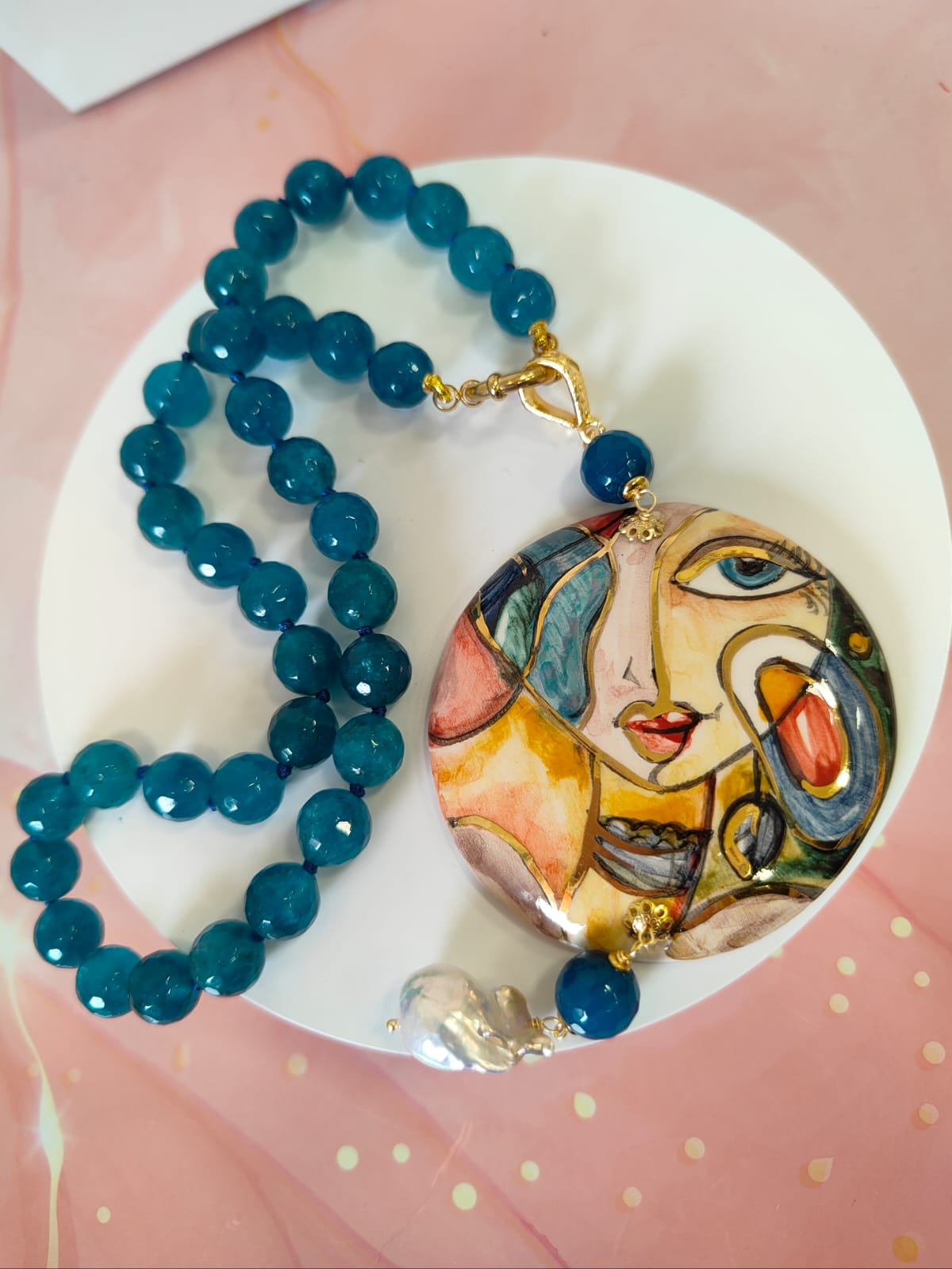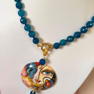 Questa collana agata ceramica nasce dall’incontro tra colore, artigianalità e carattere, un gioiello pensato per chi ama indossare dettagli unici e ricchi di personalità. Le luminose sfere di agata blu creano un ritmo elegante attorno al collo, mentre il grande ciondolo rotondo in ceramica di Caltagirone dipinta a mano porta con sé il fascino dell’arte siciliana: un volto stilizzato, moderno e vibrante, che cattura lo sguardo e racconta una storia fatta di creatività e tradizione.