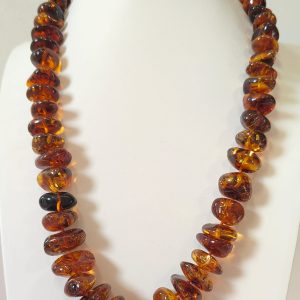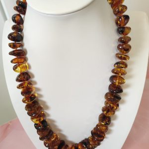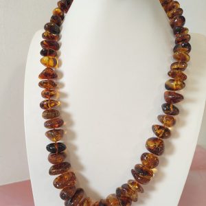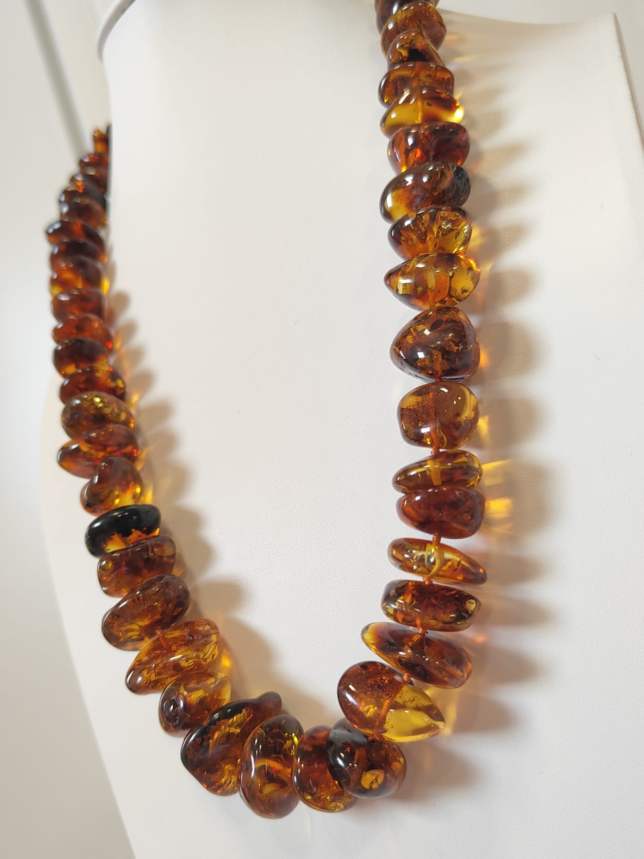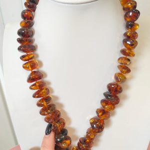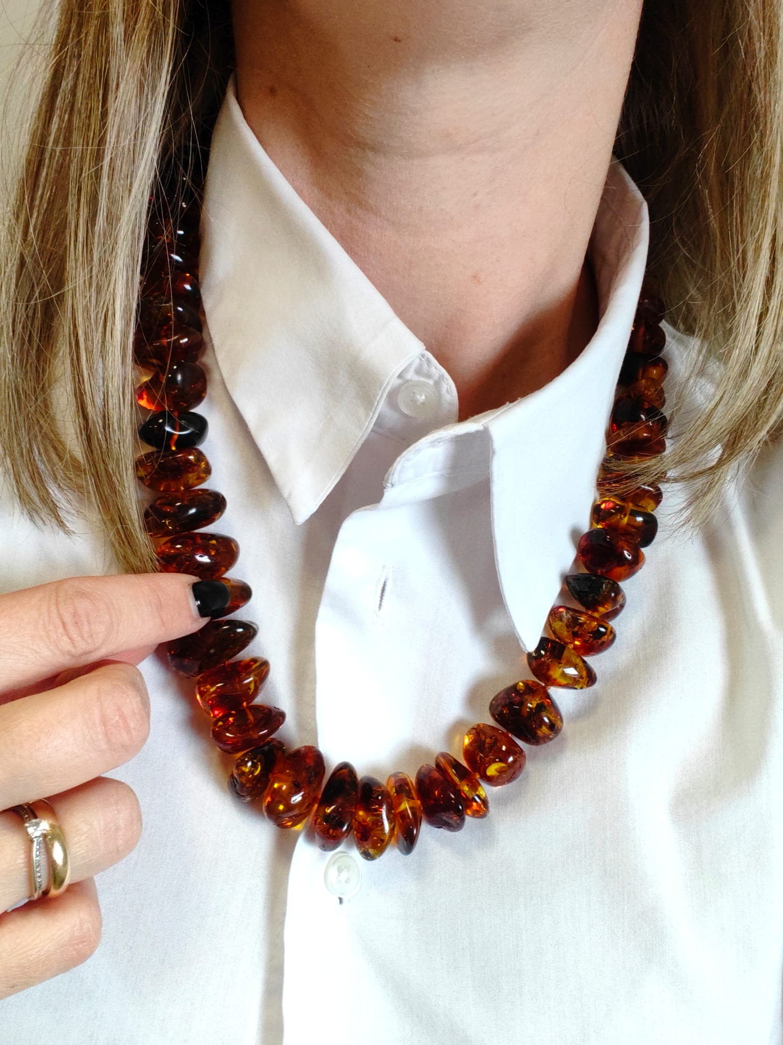 La collana misura 59 cm, quindi si posa sul décolleté con eleganza. Nonostante il peso complessivo di 83 grammi, risulta comoda da indossare grazie alla naturale leggerezza dell’ambra. Le forme organiche delle pietre aggiungono movimento e conferiscono un aspetto ricco ma non eccessivo. Per questo motivo, il gioiello si adatta sia agli outfit quotidiani sia ai look più eleganti.