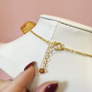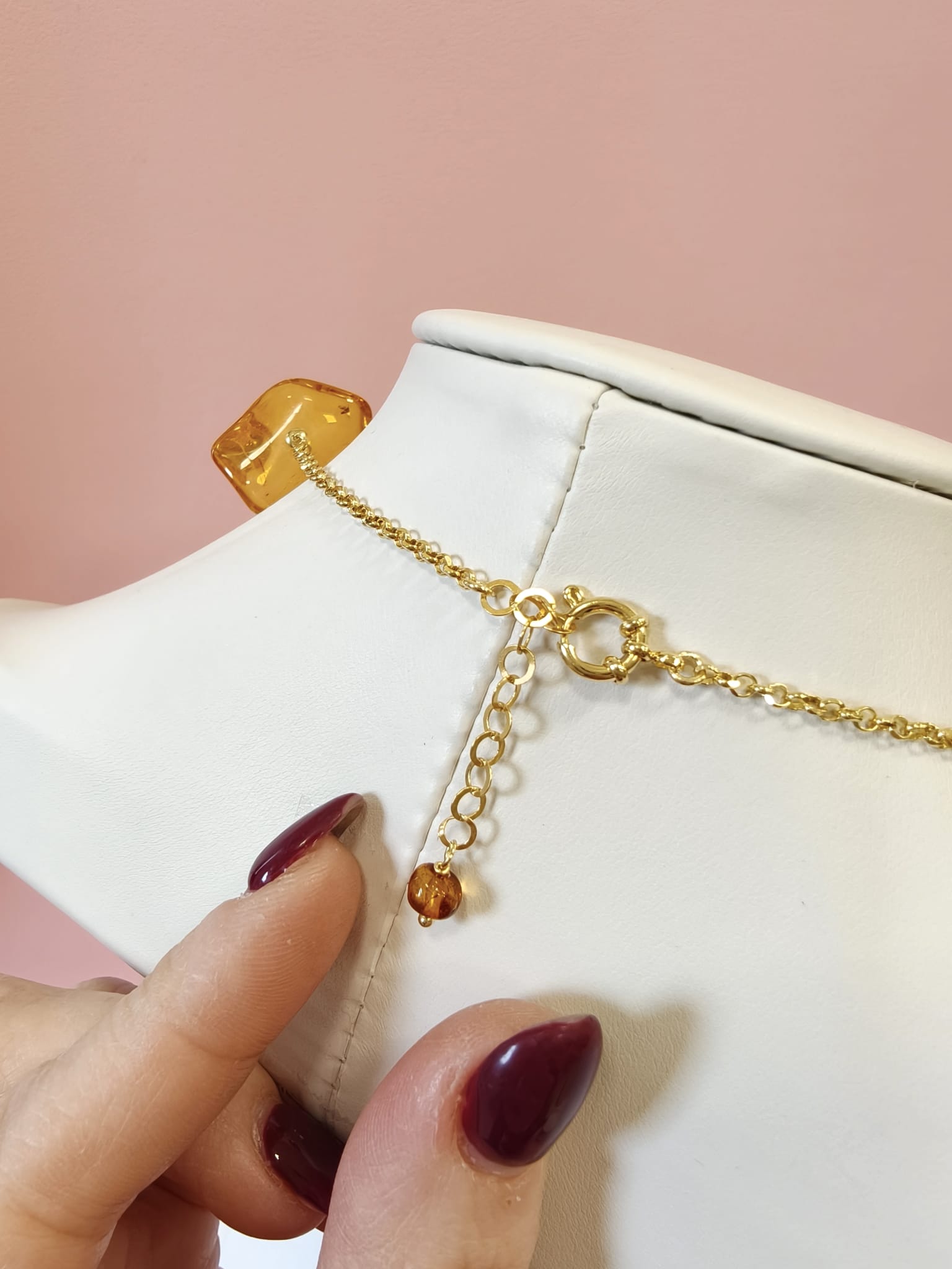 Realizzata in argento 925 placcato oro, questa creazione è impreziosita da una maglia a taglio diamantato, studiata per riflettere la luce con delicatezza e amplificare la brillantezza delle pietre naturali. Il girocollo misura 40 cm, completato da un pratico prolungamento che consente di regolare la lunghezza secondo lo stile desiderato.