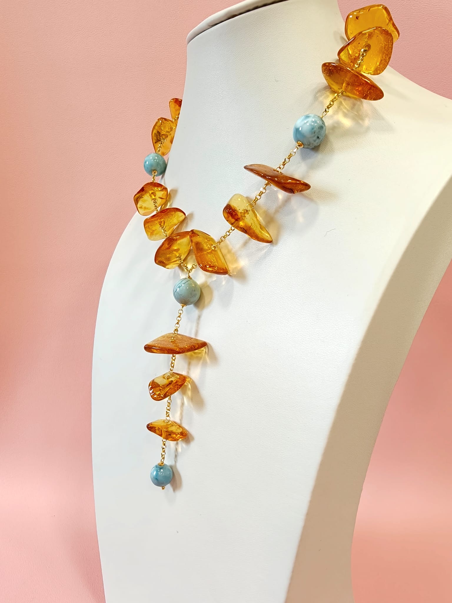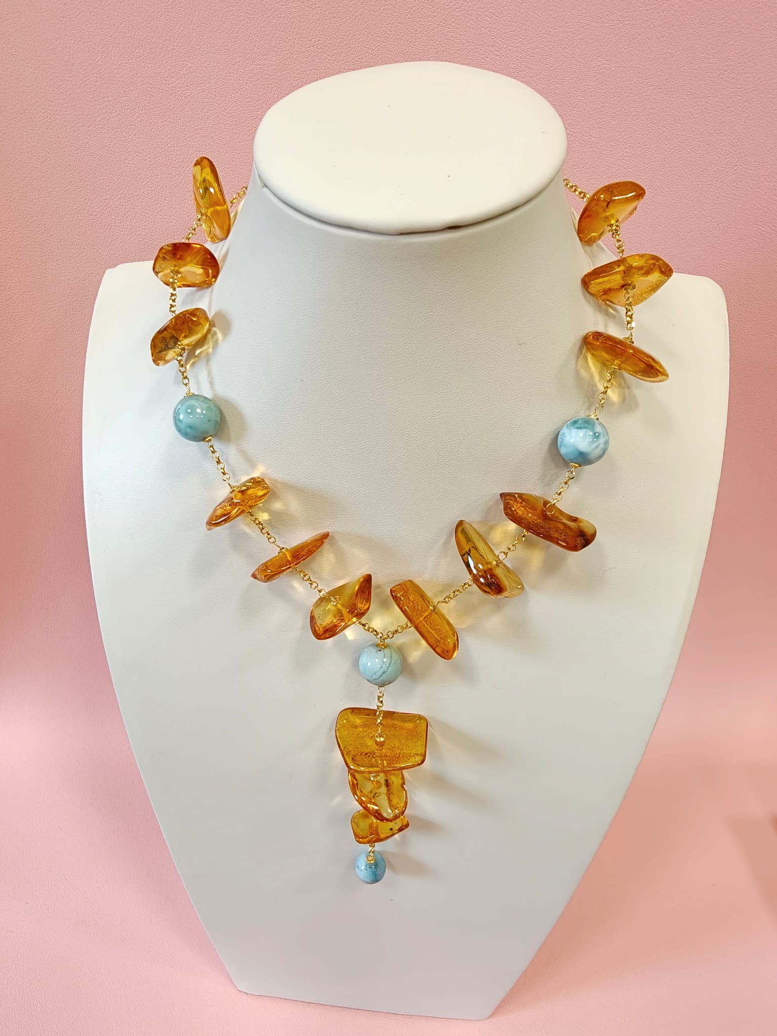 Dal centro si sviluppa un ciondolo verticale lungo circa 9,5 cm, elemento distintivo che dona movimento e slancia la figura. La composizione frontale mantiene una disposizione armoniosa: le ambre naturali, dalle forme irregolari e organiche, sono distribuite con equilibrio prima di incontrare il larimar centrale, creando una linea elegante e perfettamente simmetrica.