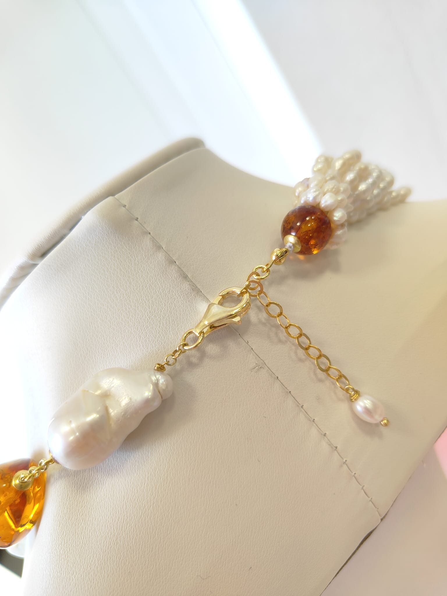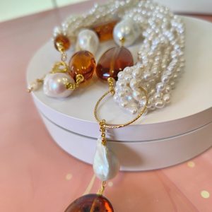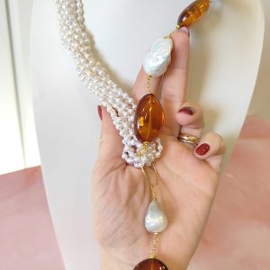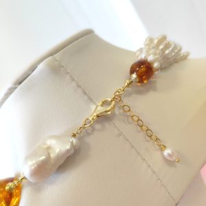 Le perle barocche, scelte una a una per forma e brillantezza, aggiungono movimento e personalità alla collana. Ogni perla racconta una storia diversa, mentre l’ambra regala profondità con il suo tipico colore miele e la trasparenza vibrante. Il ciondolo, lungo circa 8 cm, scende con eleganza e diventa il punto focale del gioiello. La montatura in argento placcato oro accompagna tutti gli elementi con una tonalità calda e luminosa, così da esaltare sia la perla sia l’ambra.