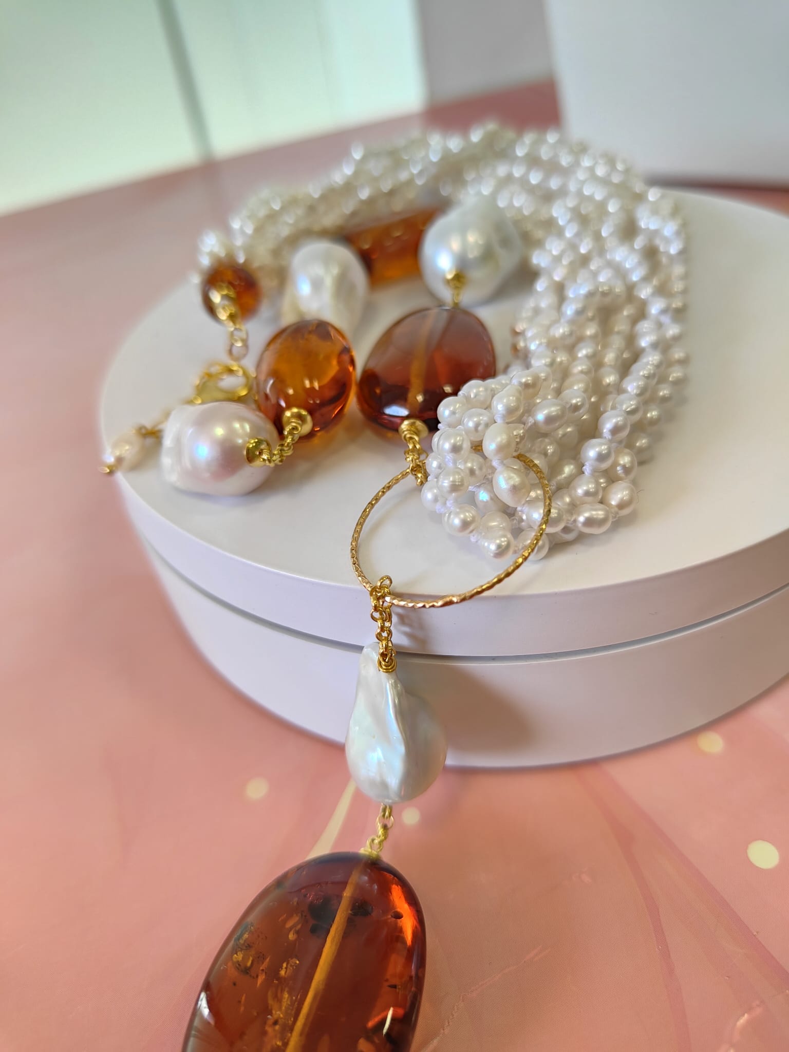 La collana ambra e perle è un pezzo unico, quindi può presentare leggere imperfezioni dovute alla natura delle pietre e alla lavorazione manuale. Queste piccole differenze non sono difetti, ma segni della sua autenticità e del suo carattere speciale.