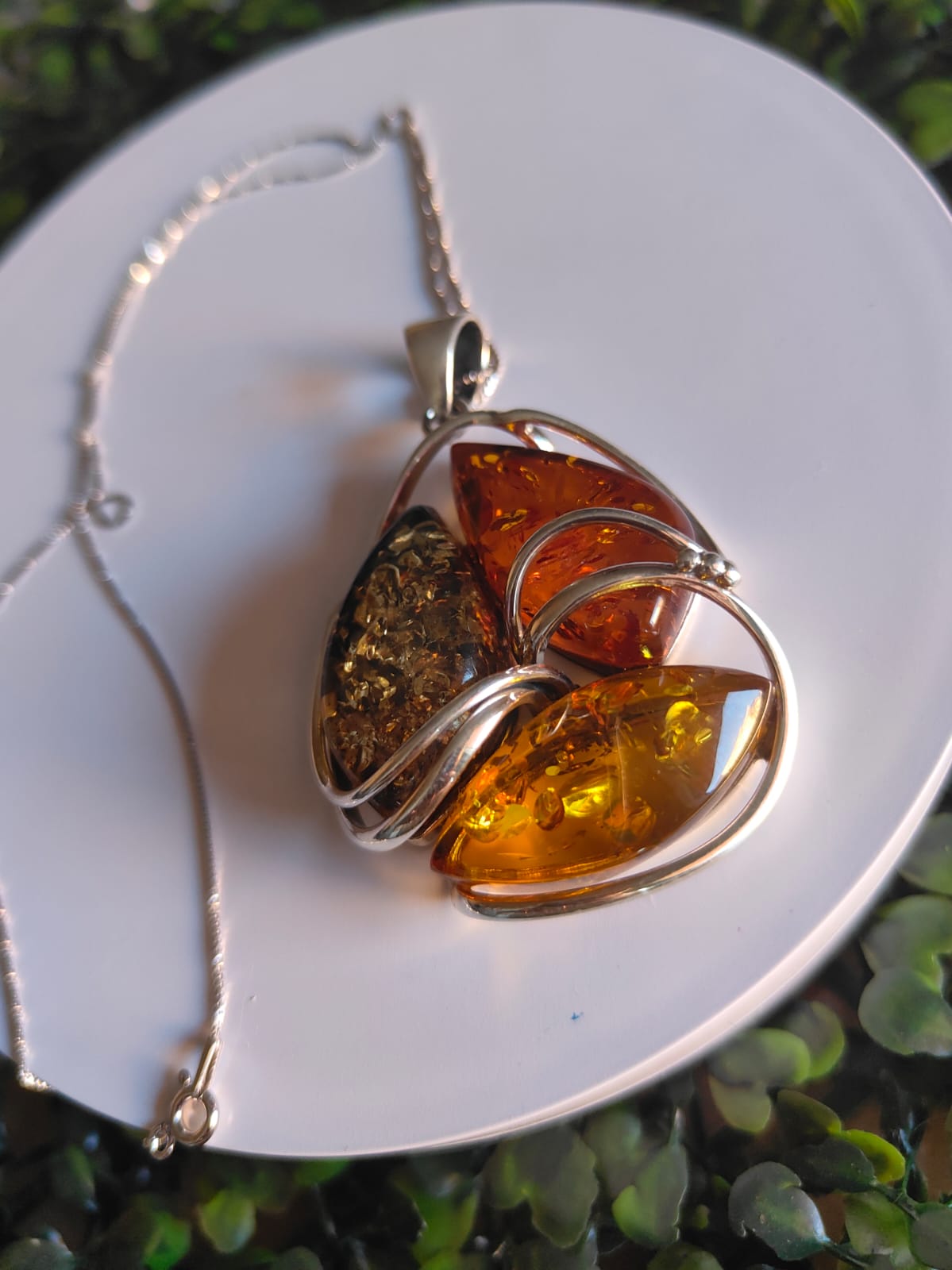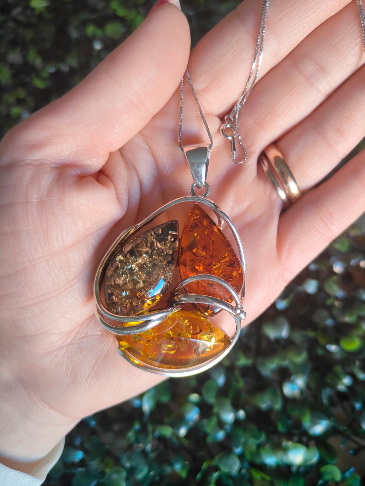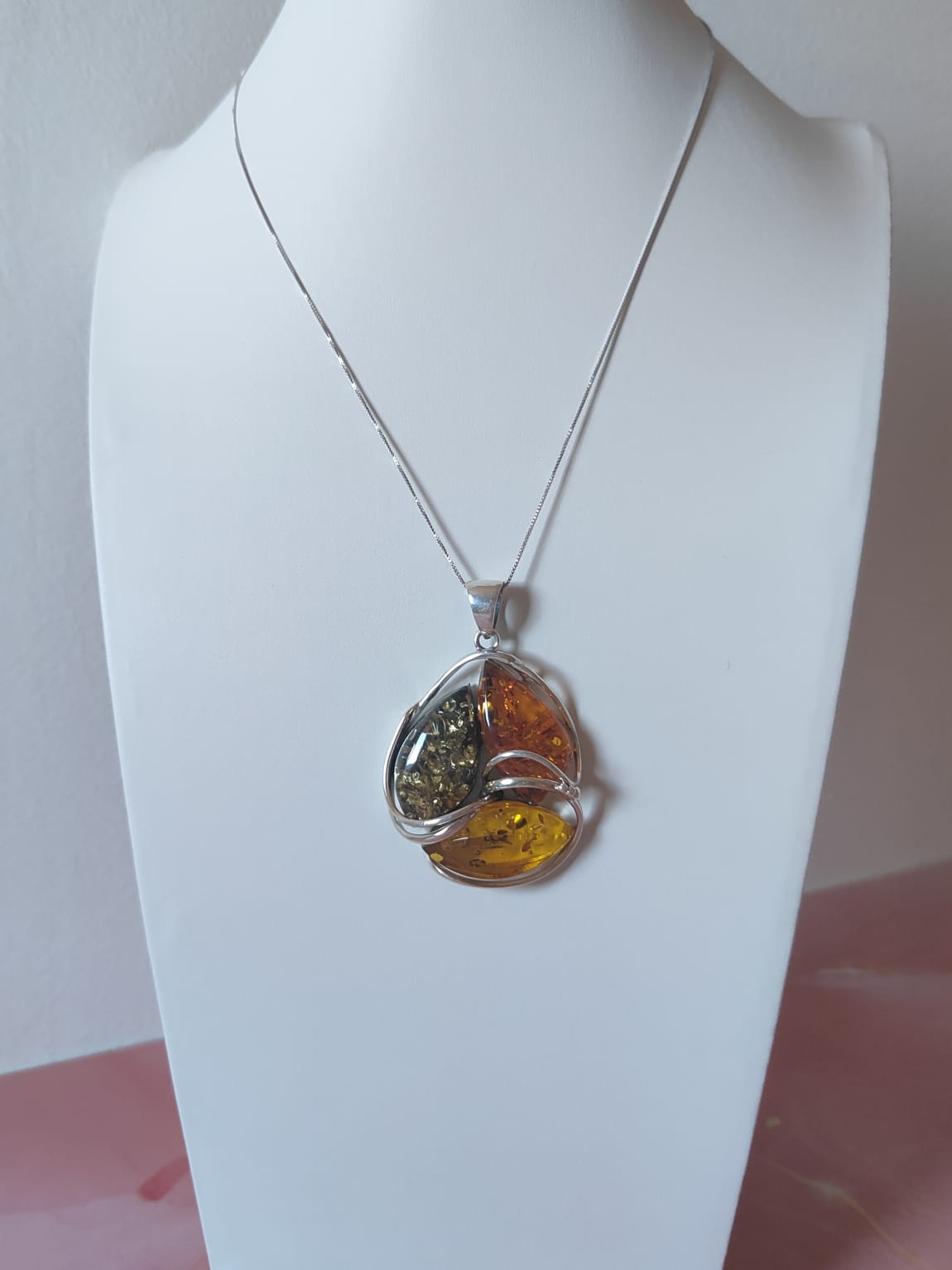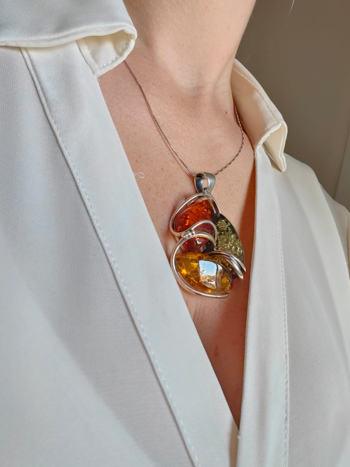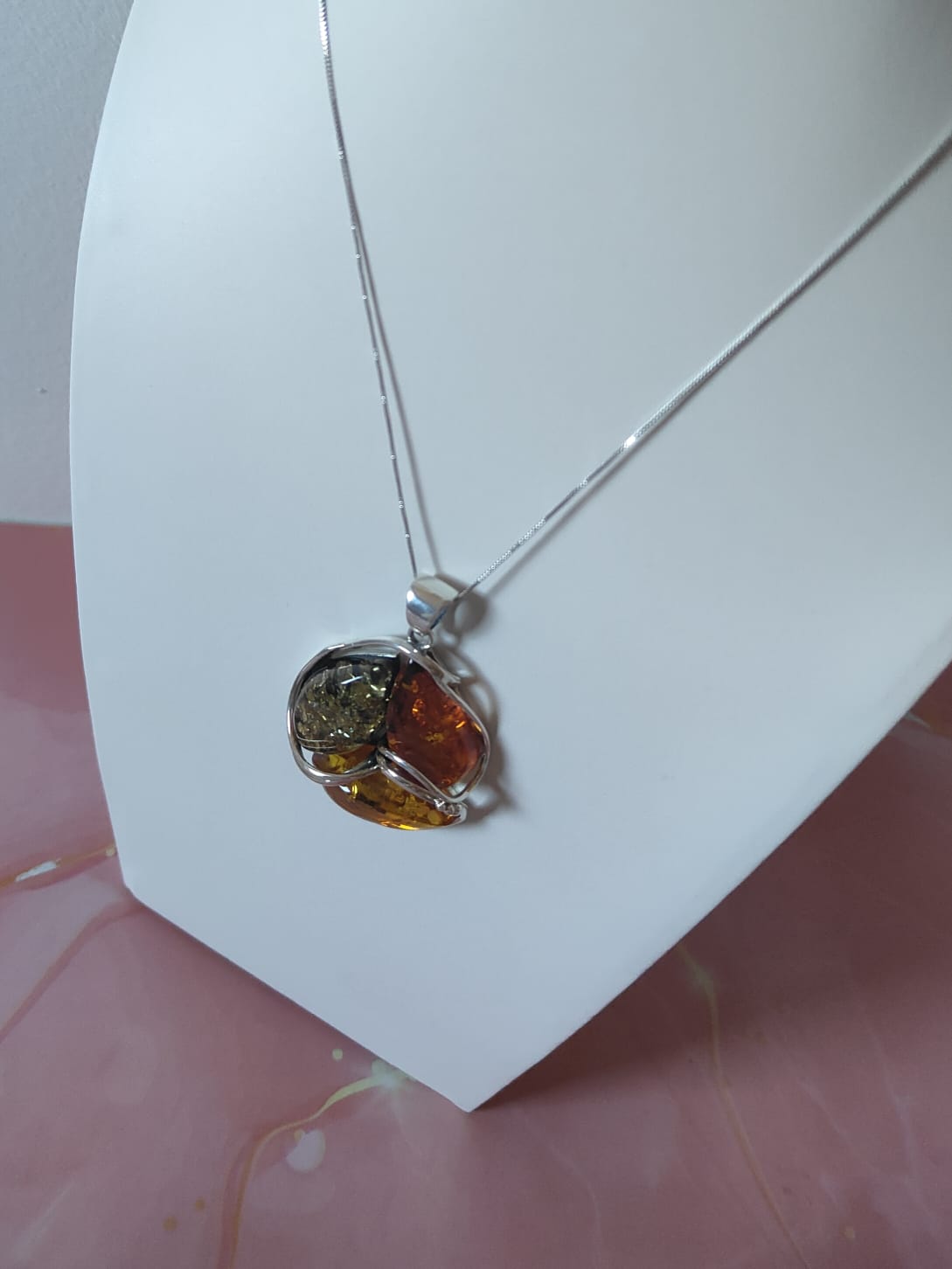 La collana ambra multicolore in argento 925 è un gioiello unico che unisce eleganza e autenticità. Il ciondolo, dalle dimensioni importanti di 6 cm x 4 cm, racchiude tre tonalità naturali di ambra: verde, cognac e gialla. Insieme creano un mosaico di luce che illumina chi lo indossa con raffinatezza e calore.