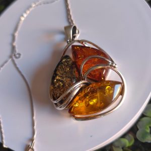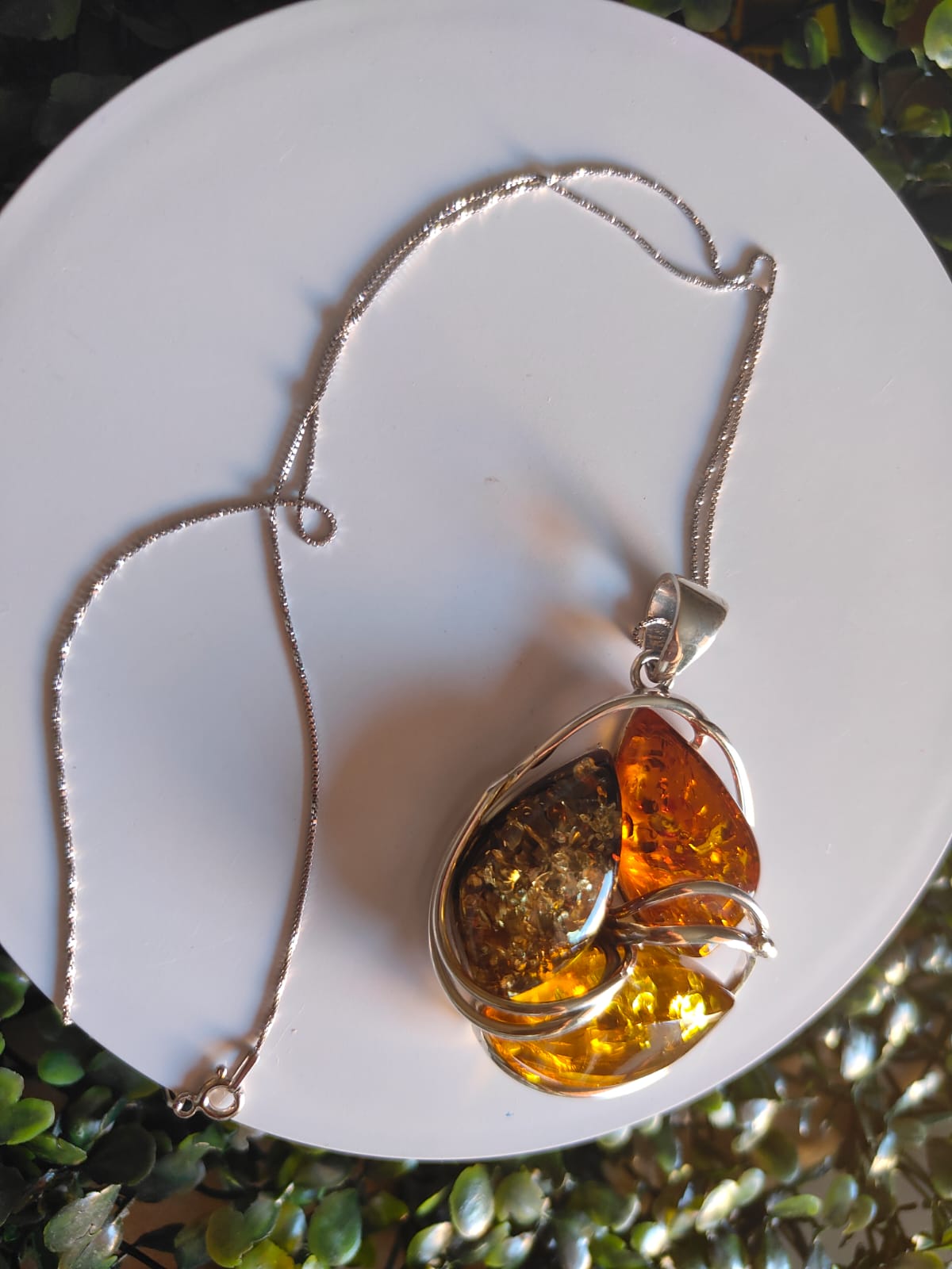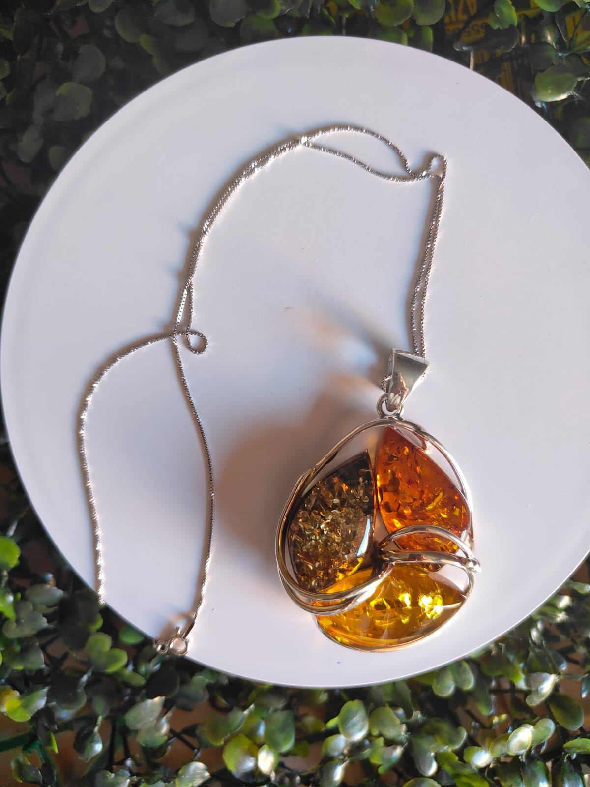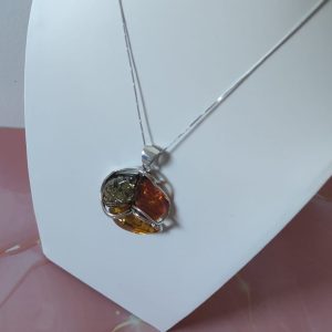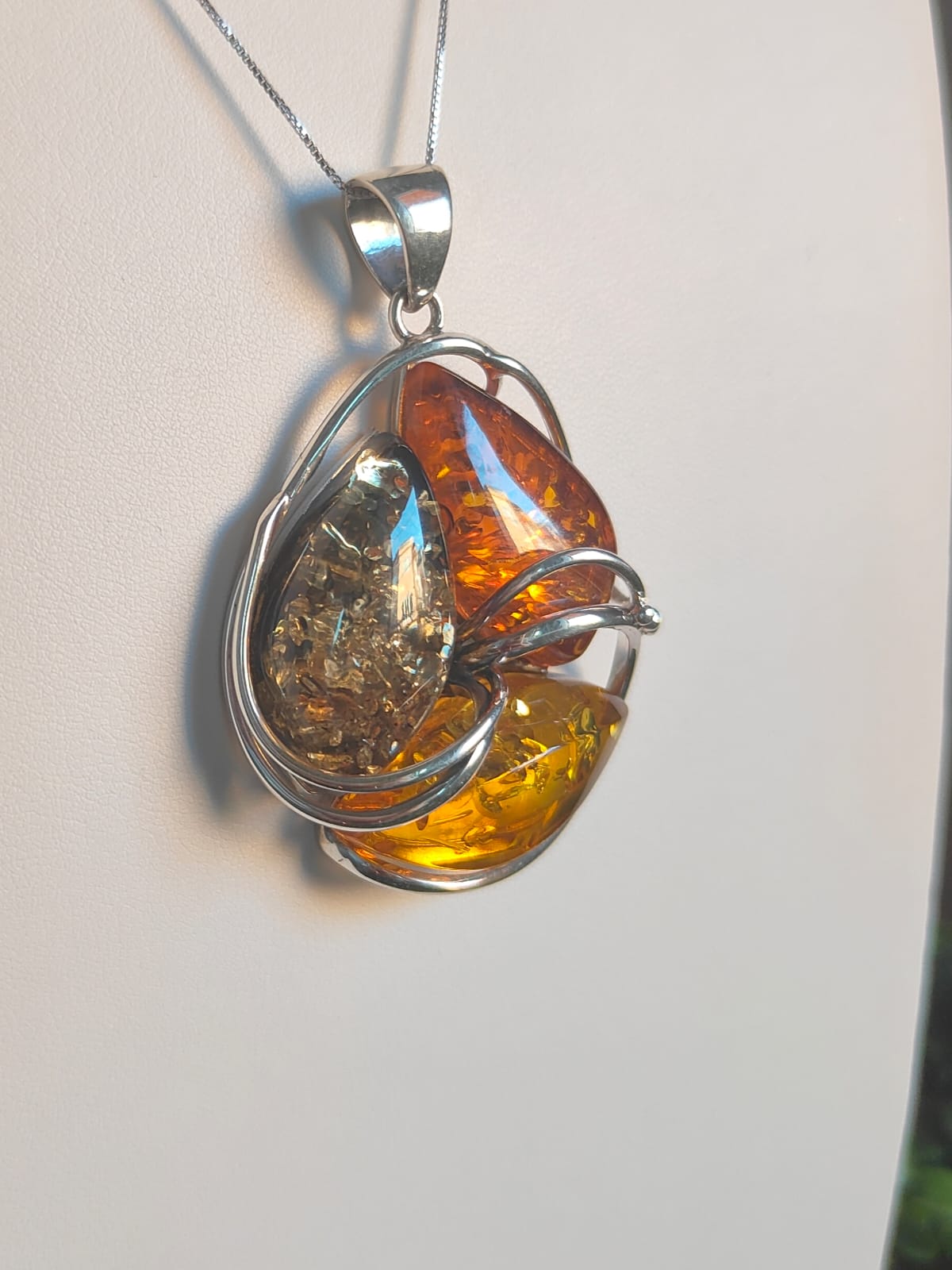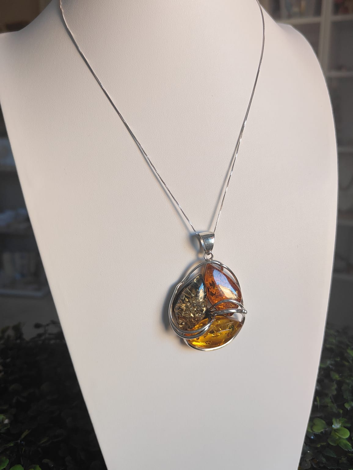 La collana ambra multicolore in argento 925 è un gioiello unico che unisce eleganza e autenticità. Il ciondolo, dalle dimensioni importanti di 6 cm x 4 cm, racchiude tre tonalità naturali di ambra: verde, cognac e gialla. Insieme creano un mosaico di luce che illumina chi lo indossa con raffinatezza e calore.