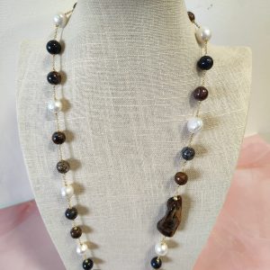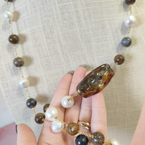 La collana è intervallata da perle barocche luminose e da perle tonde in diaspro naturale. Le perle aggiungono punti luce delicati, mentre il diaspro crea profondità cromatica con tonalità marroni, blu e grigie. Inoltre, la catena sottile in argento 925 placcato oro dona armonia al ritmo delle pietre. Il risultato è un gioiello leggero, fluido e ricco di personalità.