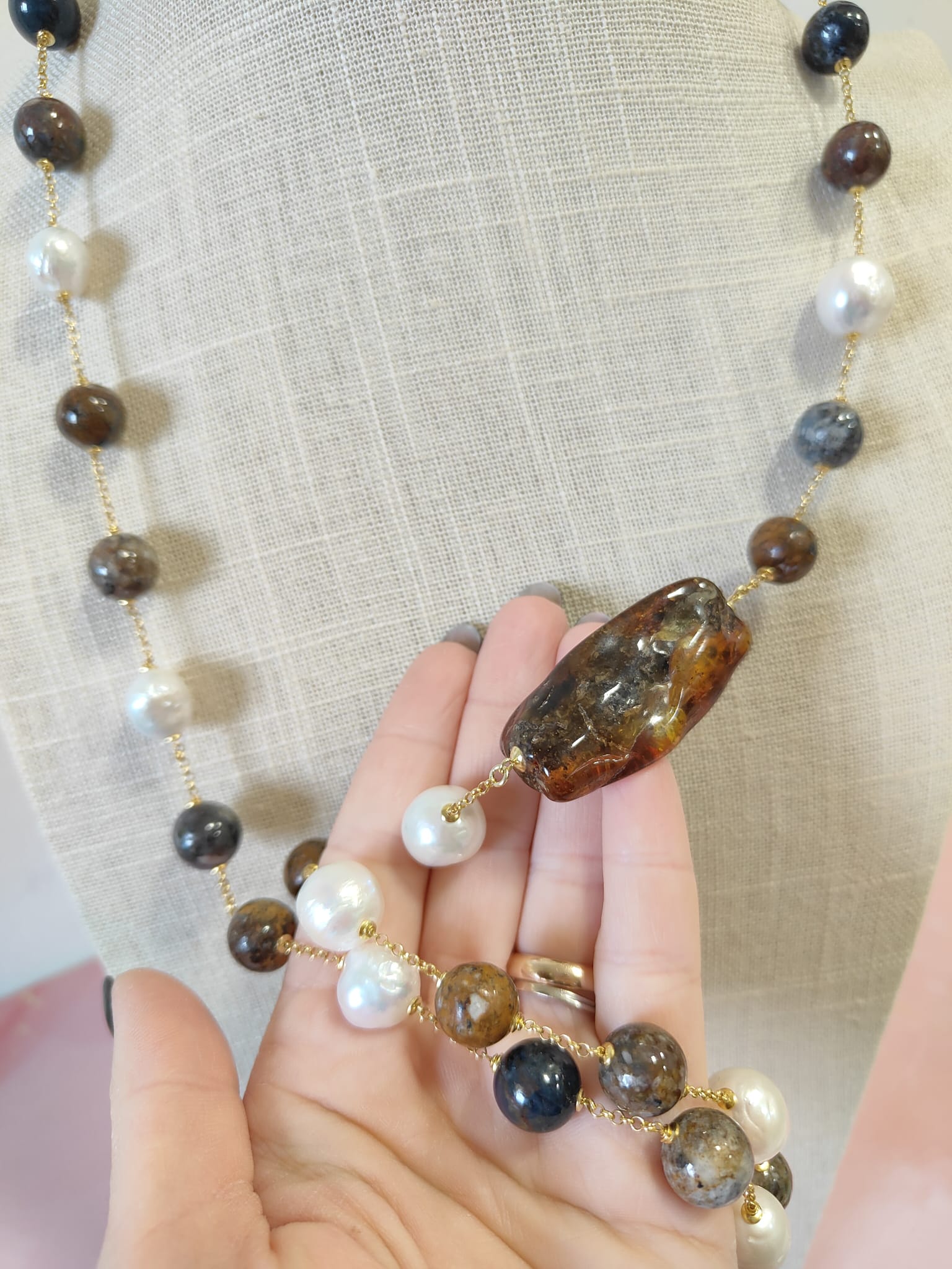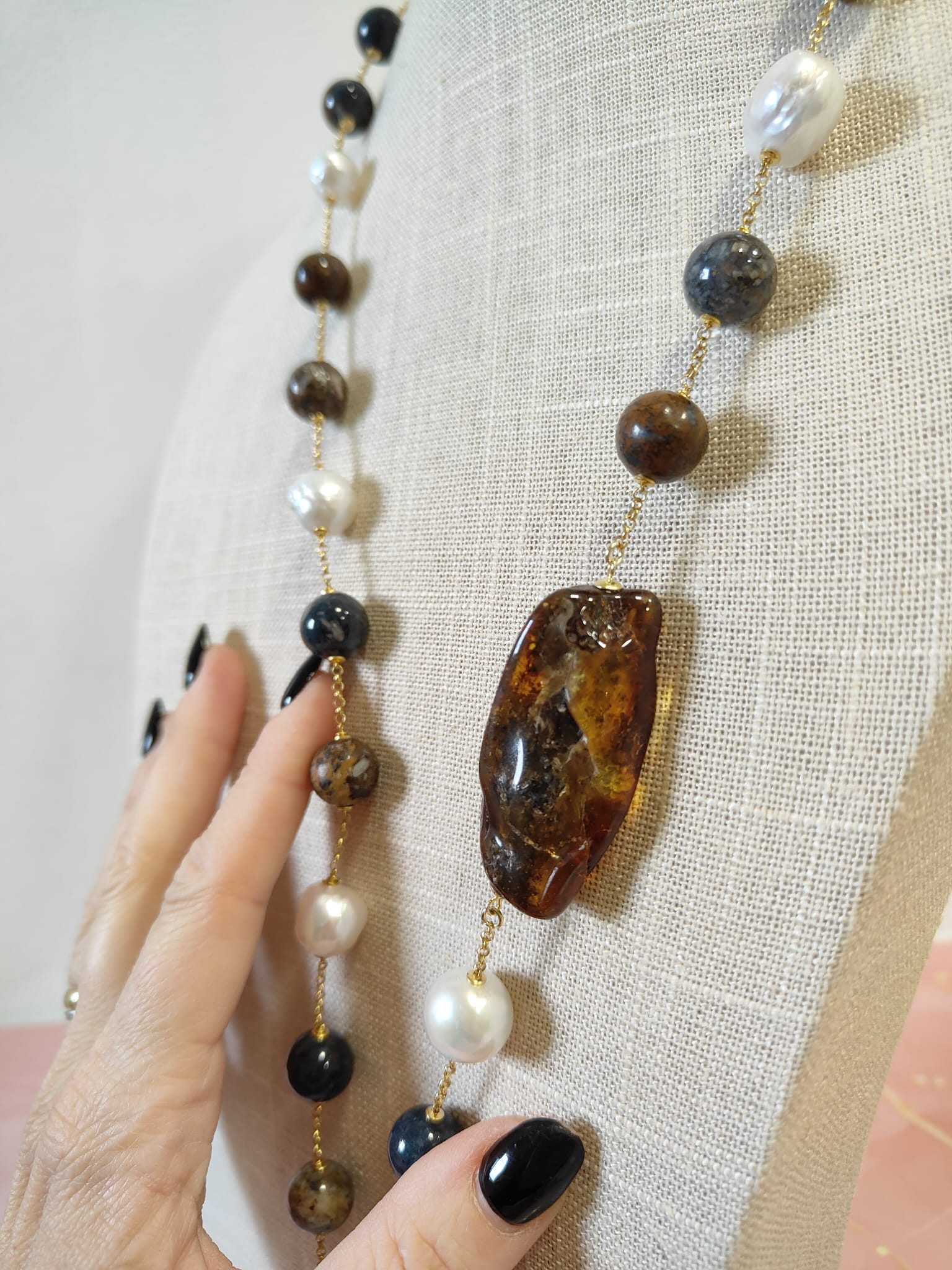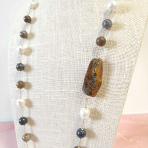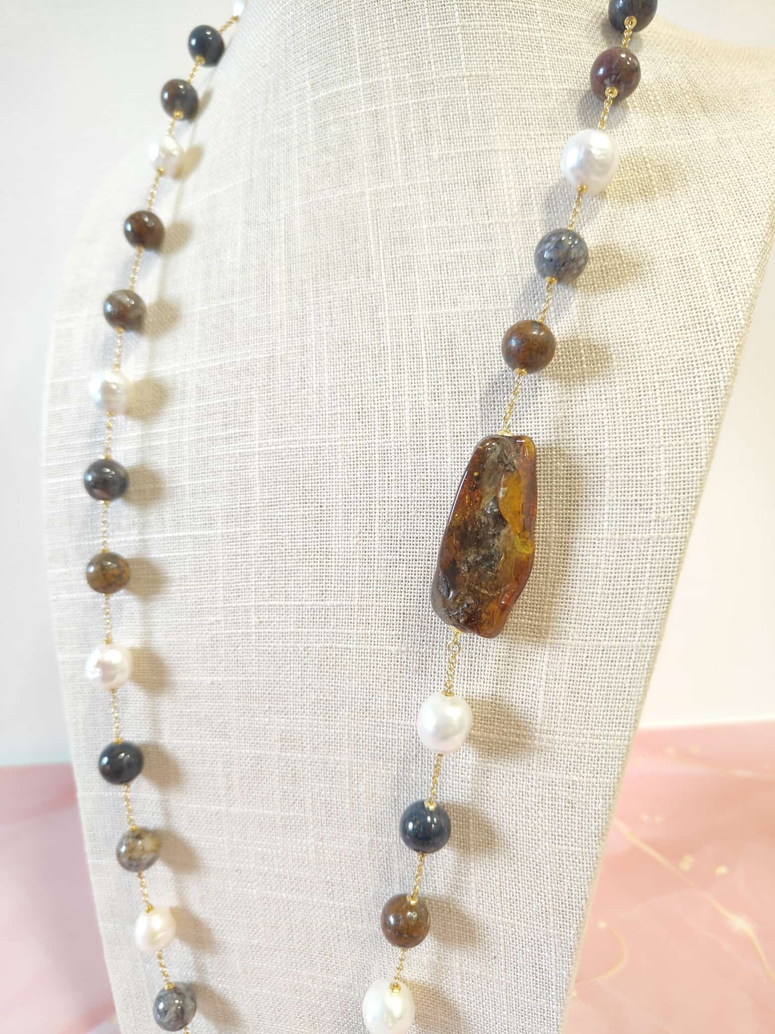 Materiali: ambra baltica naturale, perle barocche naturali, diaspro naturale