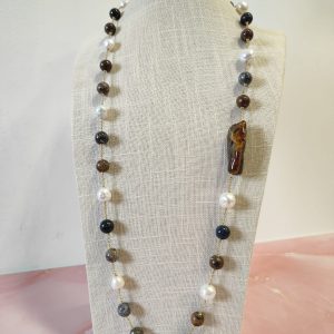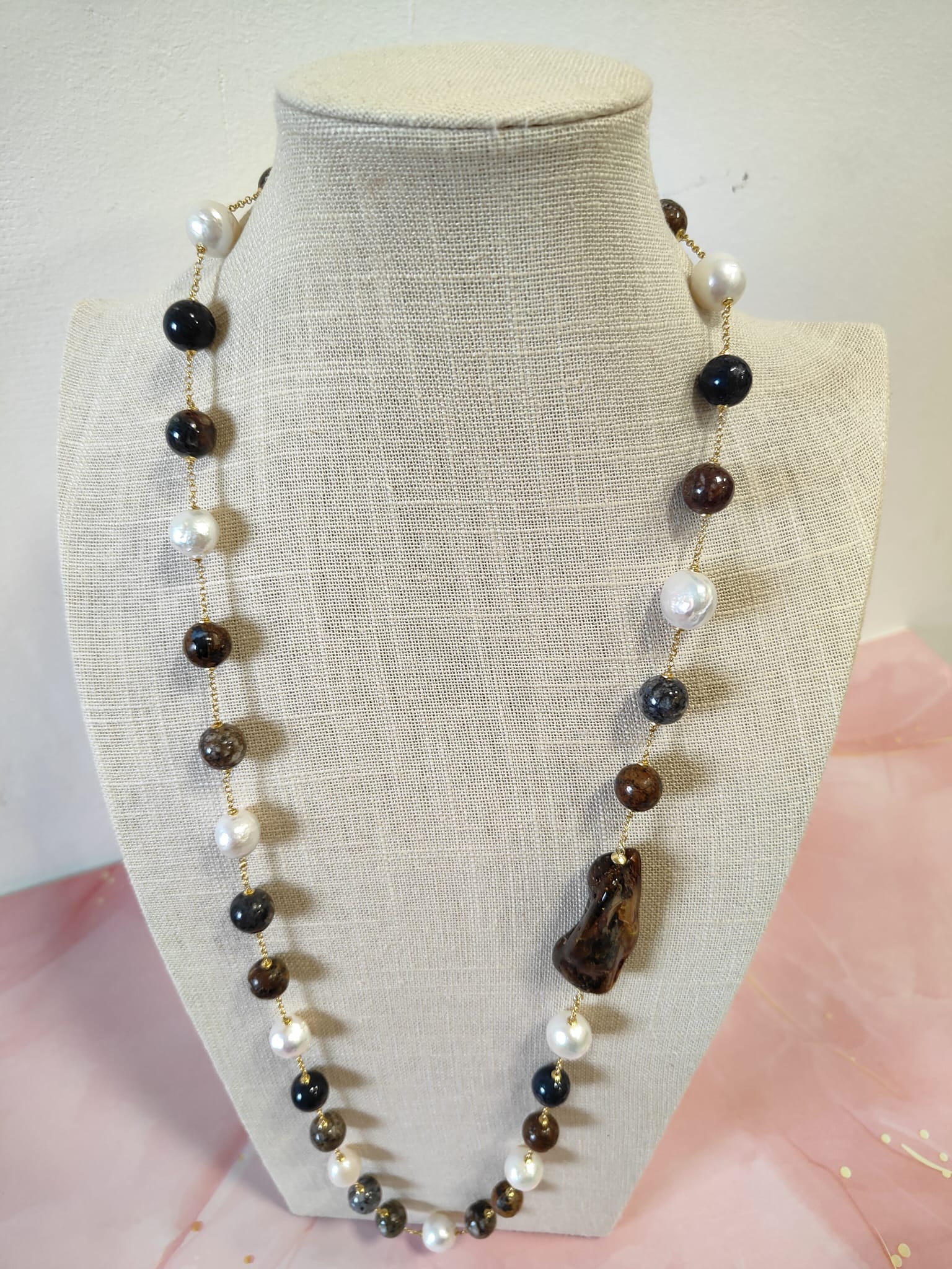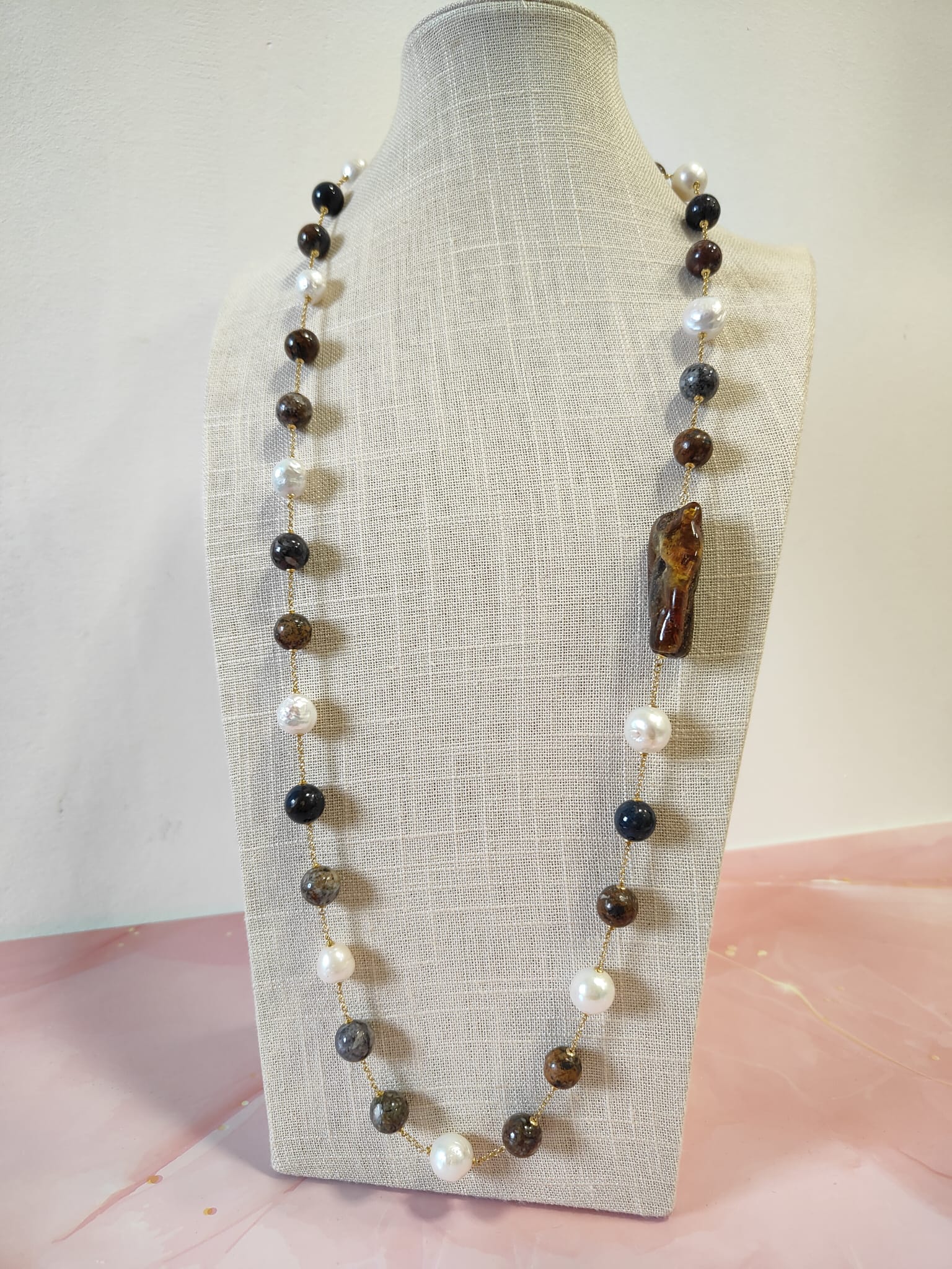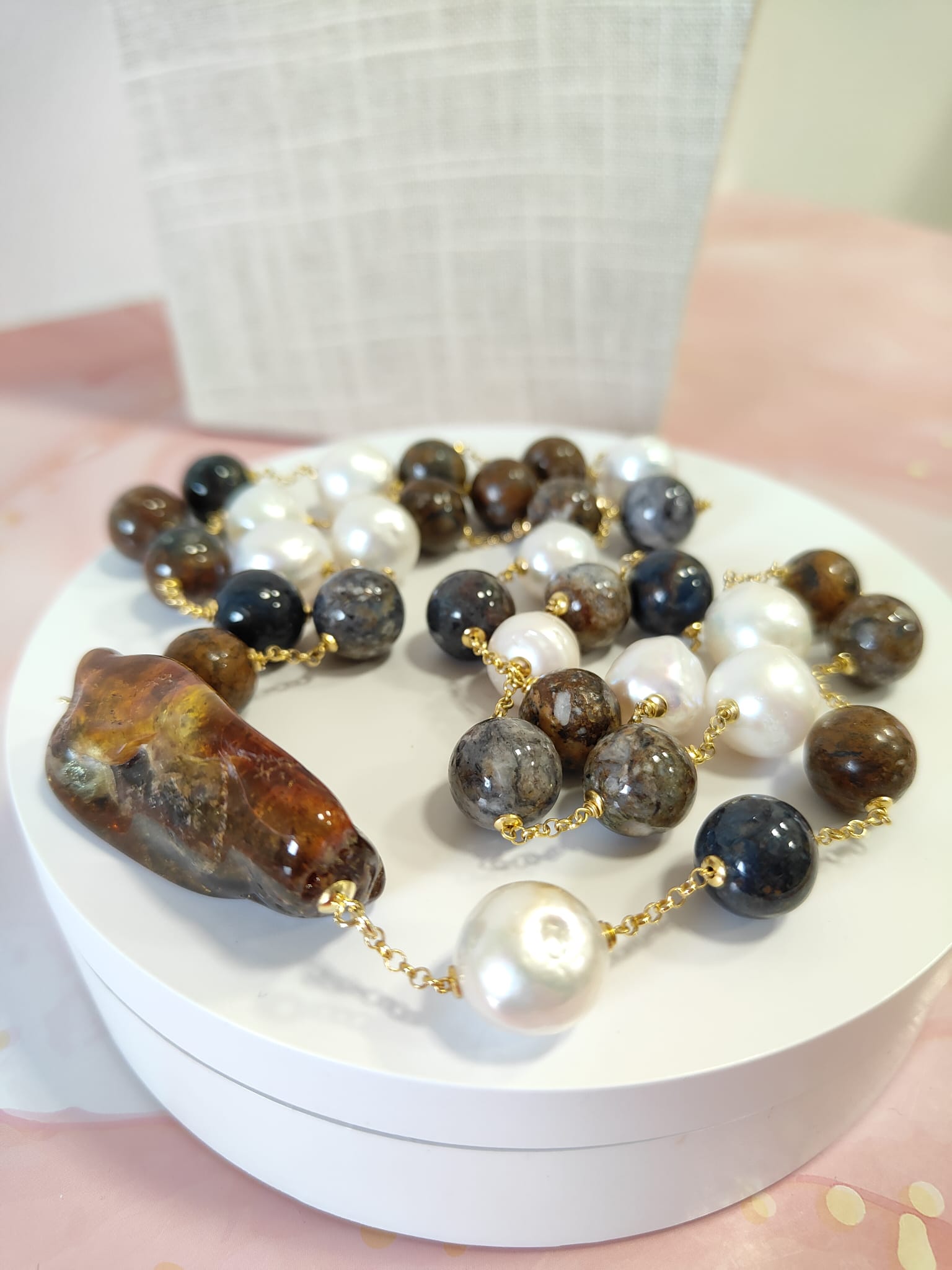 Materiali: ambra baltica naturale, perle barocche naturali, diaspro naturale