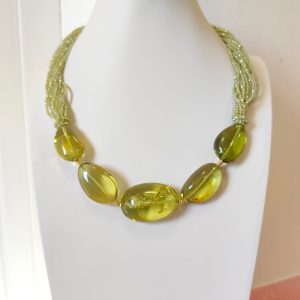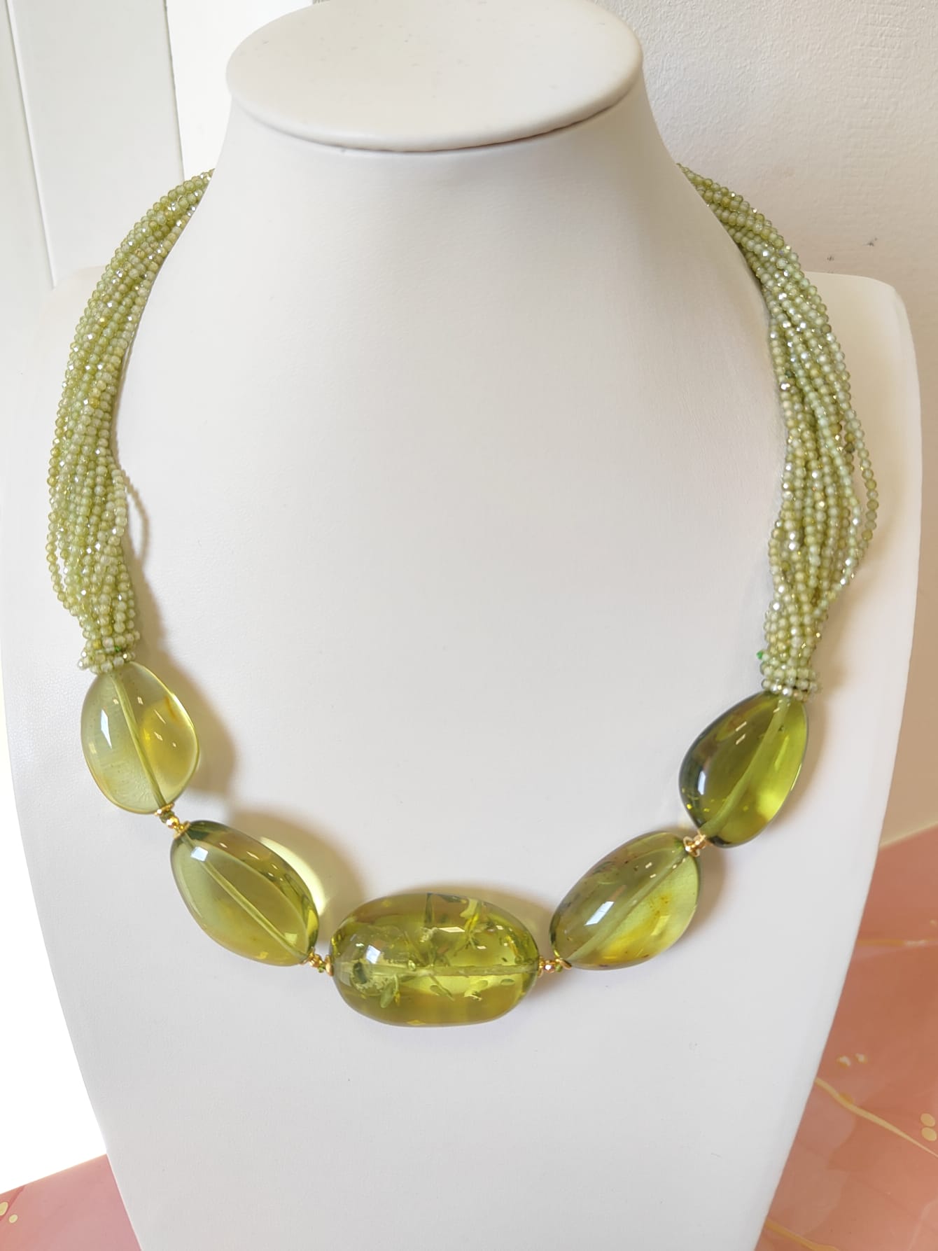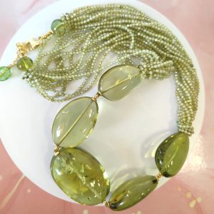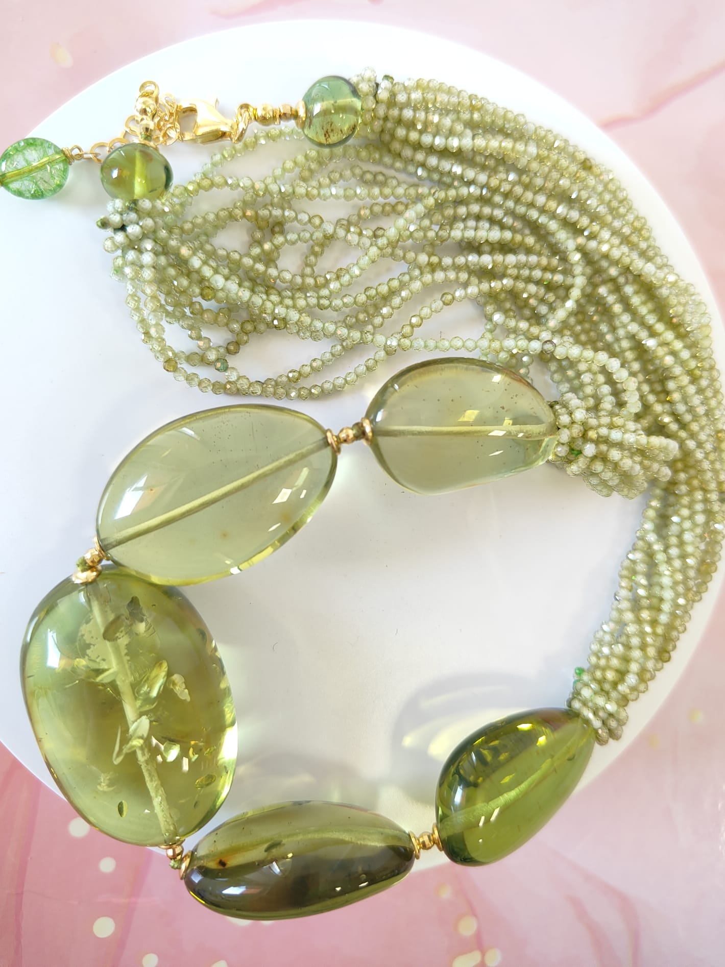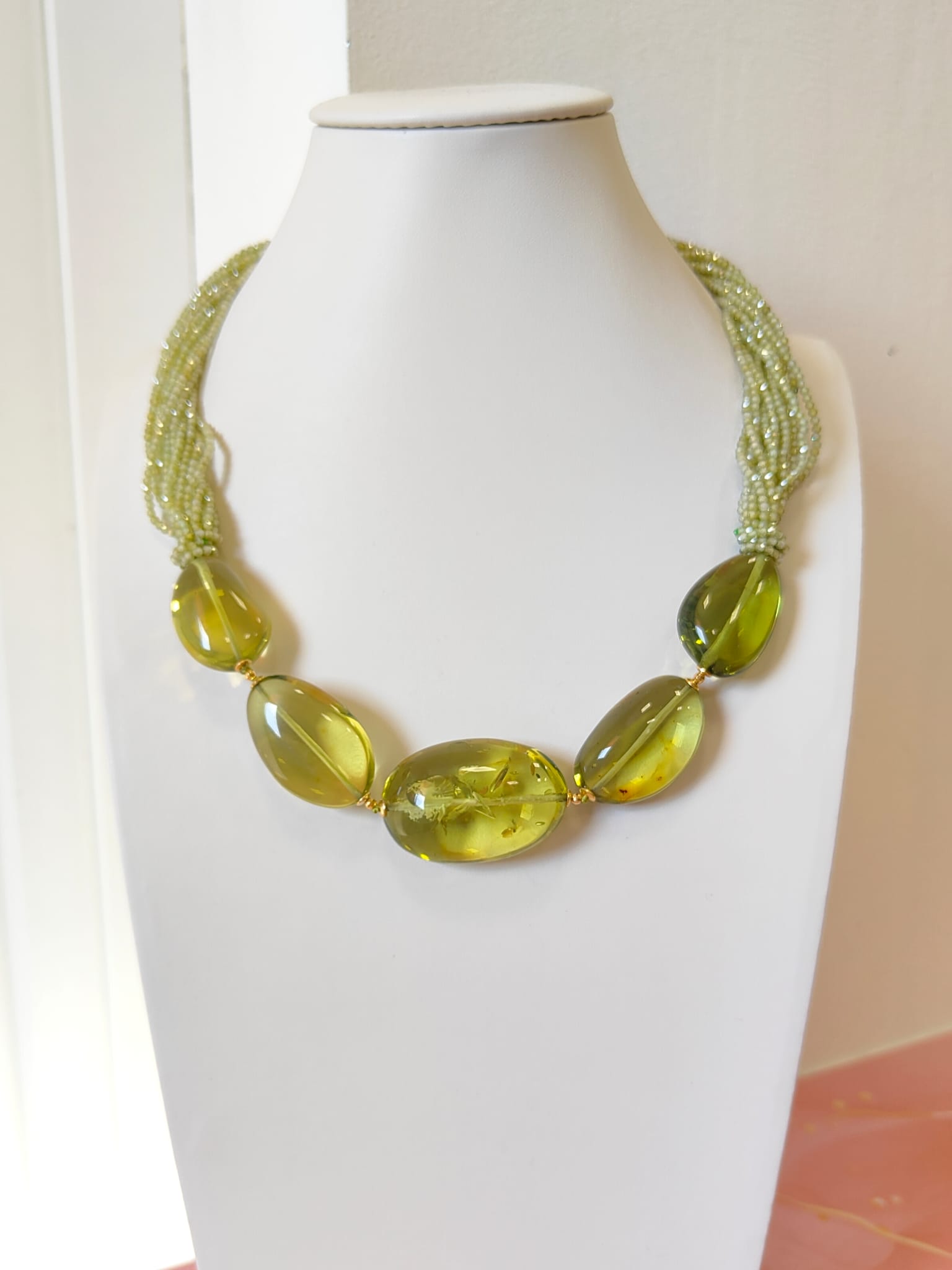 Questa collana in ambra verde e zirconi nasce come un pezzo unico dall’anima luminosa, pensato per chi desidera indossare un gioiello capace di raccontare una storia. Le grandi pietre di ambra verde riflettono la luce in modo irresistibile e, inoltre, custodiscono al loro interno inclusioni naturali che rendono ogni elemento diverso dall’altro. Proprio per questo motivo, la collana assume un carattere autentico e profondamente personale.