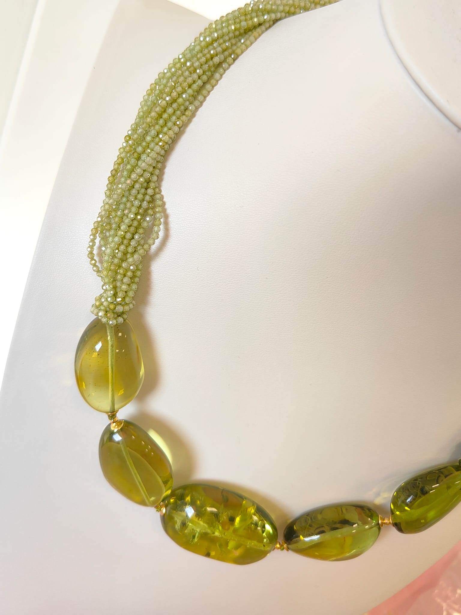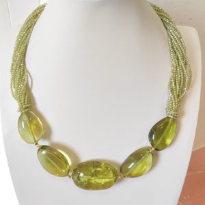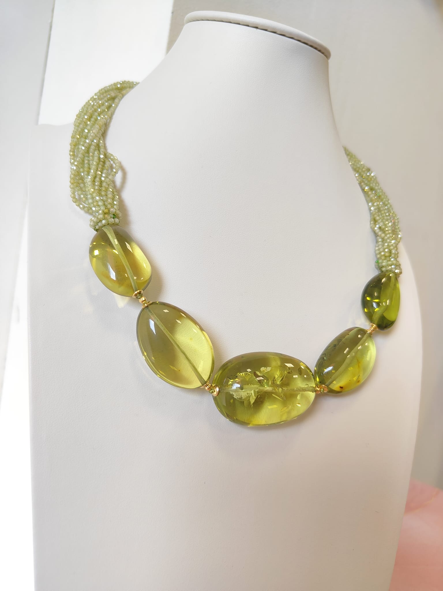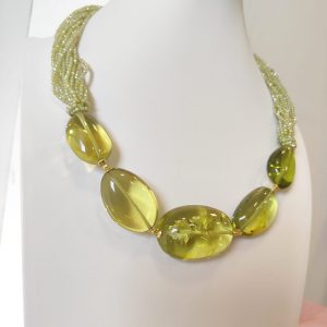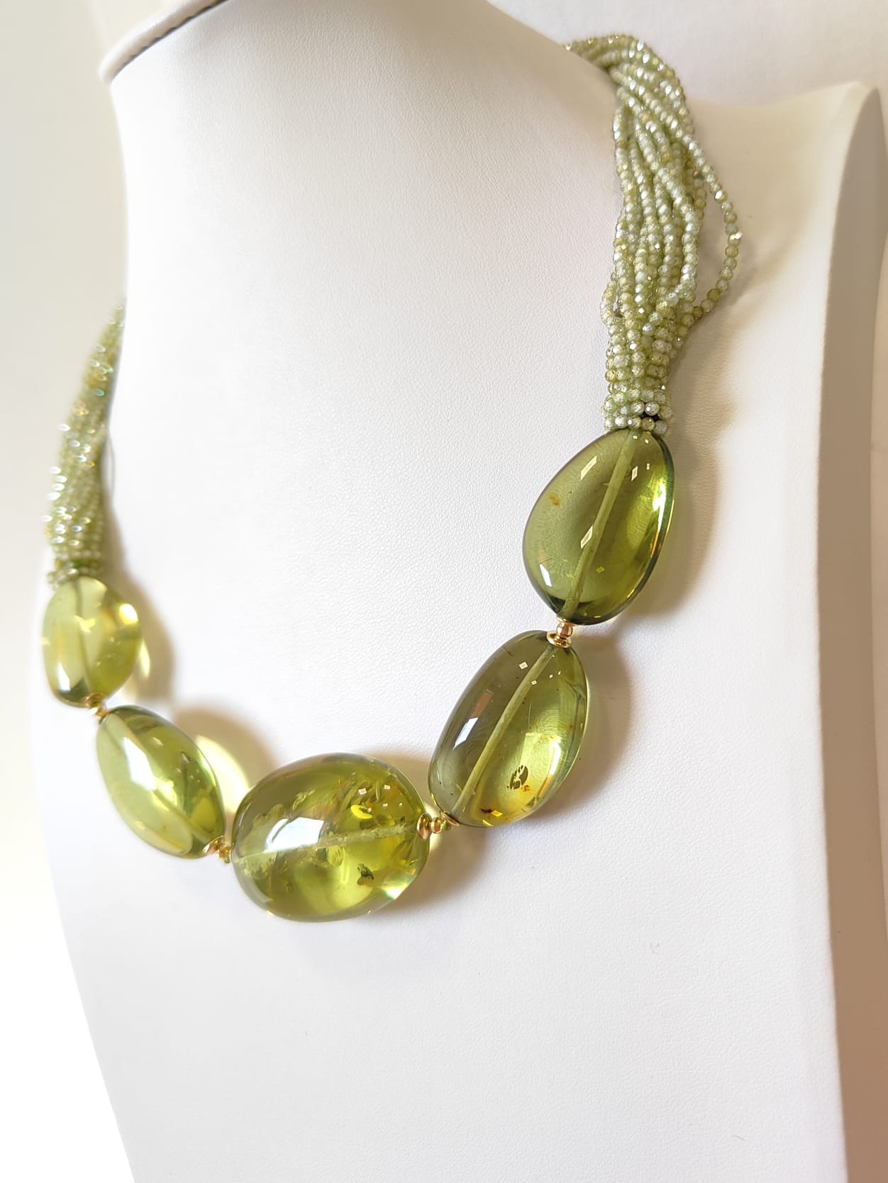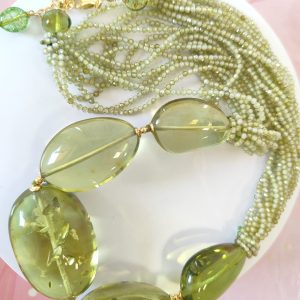 Questa collana in ambra verde e zirconi nasce come un pezzo unico dall’anima luminosa, pensato per chi desidera indossare un gioiello capace di raccontare una storia. Le grandi pietre di ambra verde riflettono la luce in modo irresistibile e, inoltre, custodiscono al loro interno inclusioni naturali che rendono ogni elemento diverso dall’altro. Proprio per questo motivo, la collana assume un carattere autentico e profondamente personale.