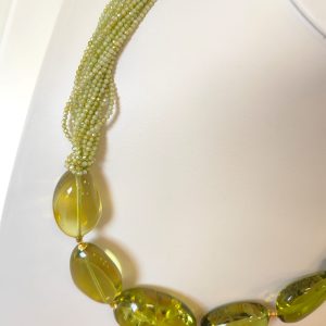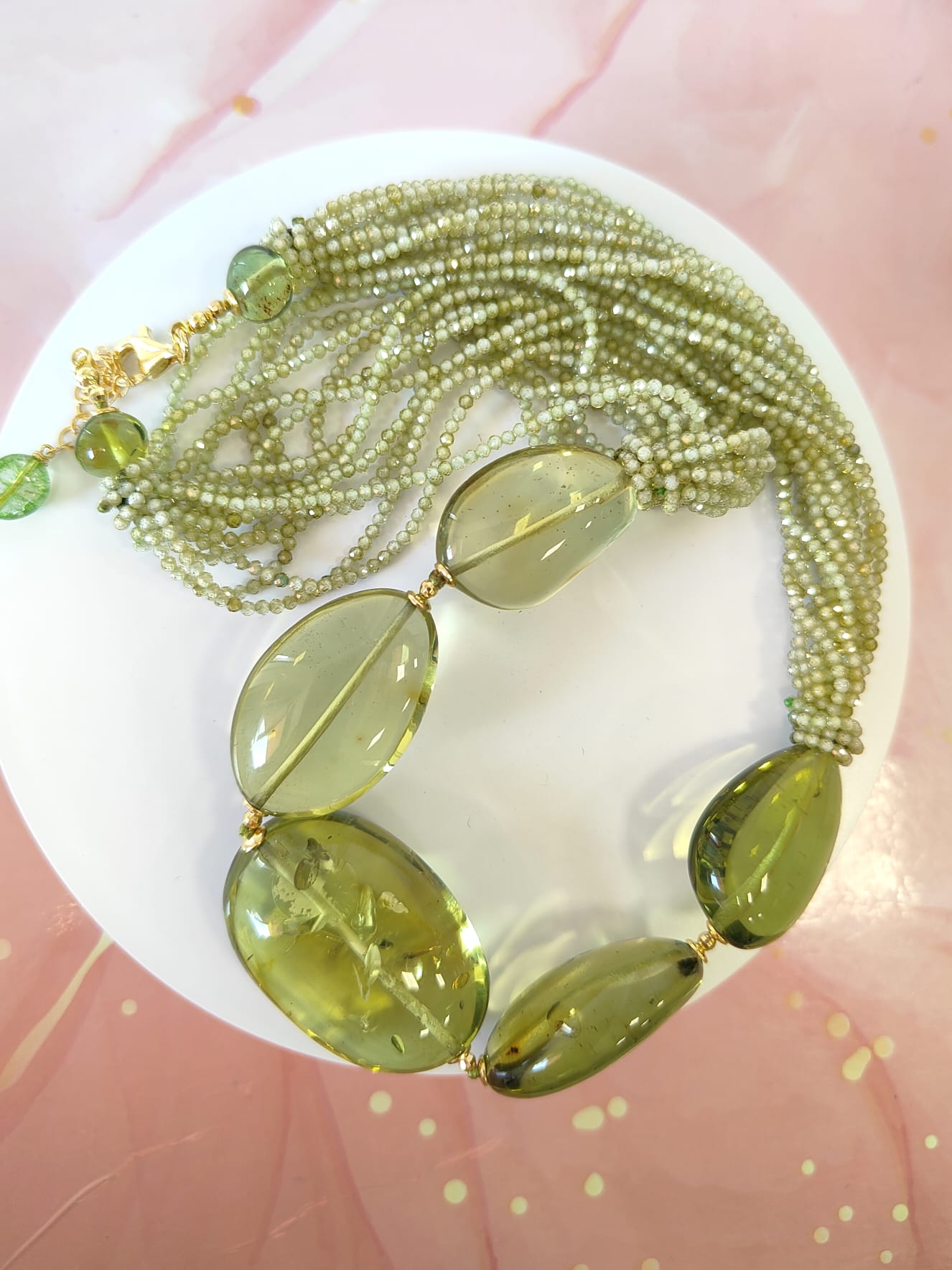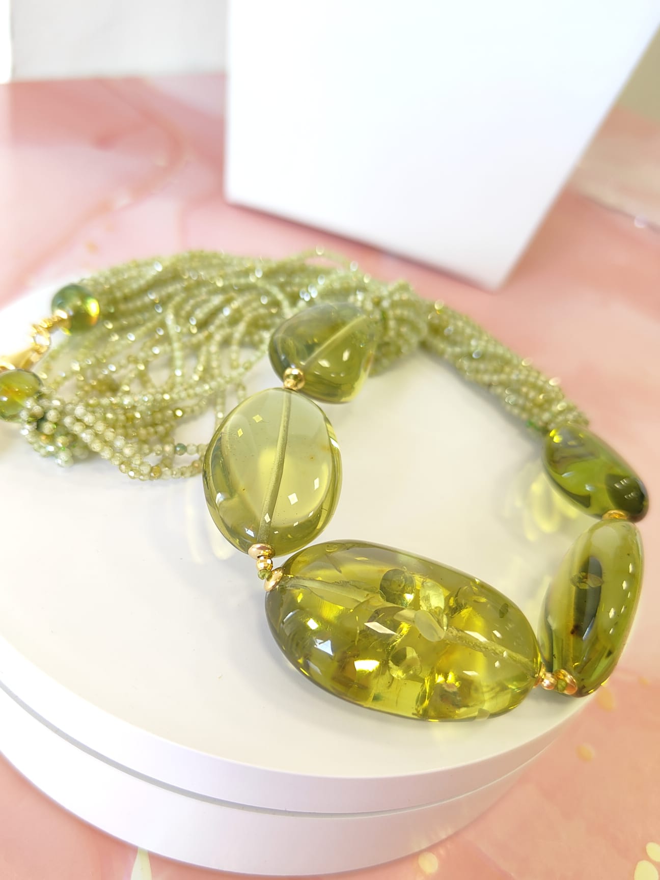 Ogni dettaglio è realizzato a mano, quindi ogni esemplare è veramente irripetibile. I micro-zirconi, intrecciati in numerosi fili, creano una texture scintillante; l’ambra verde, invece, porta con sé una luce calda e magnetica, impossibile da ignorare. La chiusura a moschettone in argento 925 placcato oro garantisce sicurezza e, allo stesso tempo, mantiene uno stile raffinato. Infine, la lunghezza di 50 cm più prolungamento permette di adattare il gioiello a diverse scollature.
