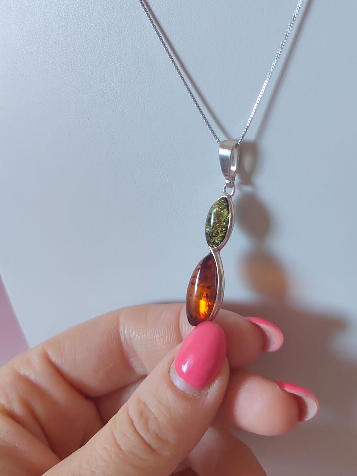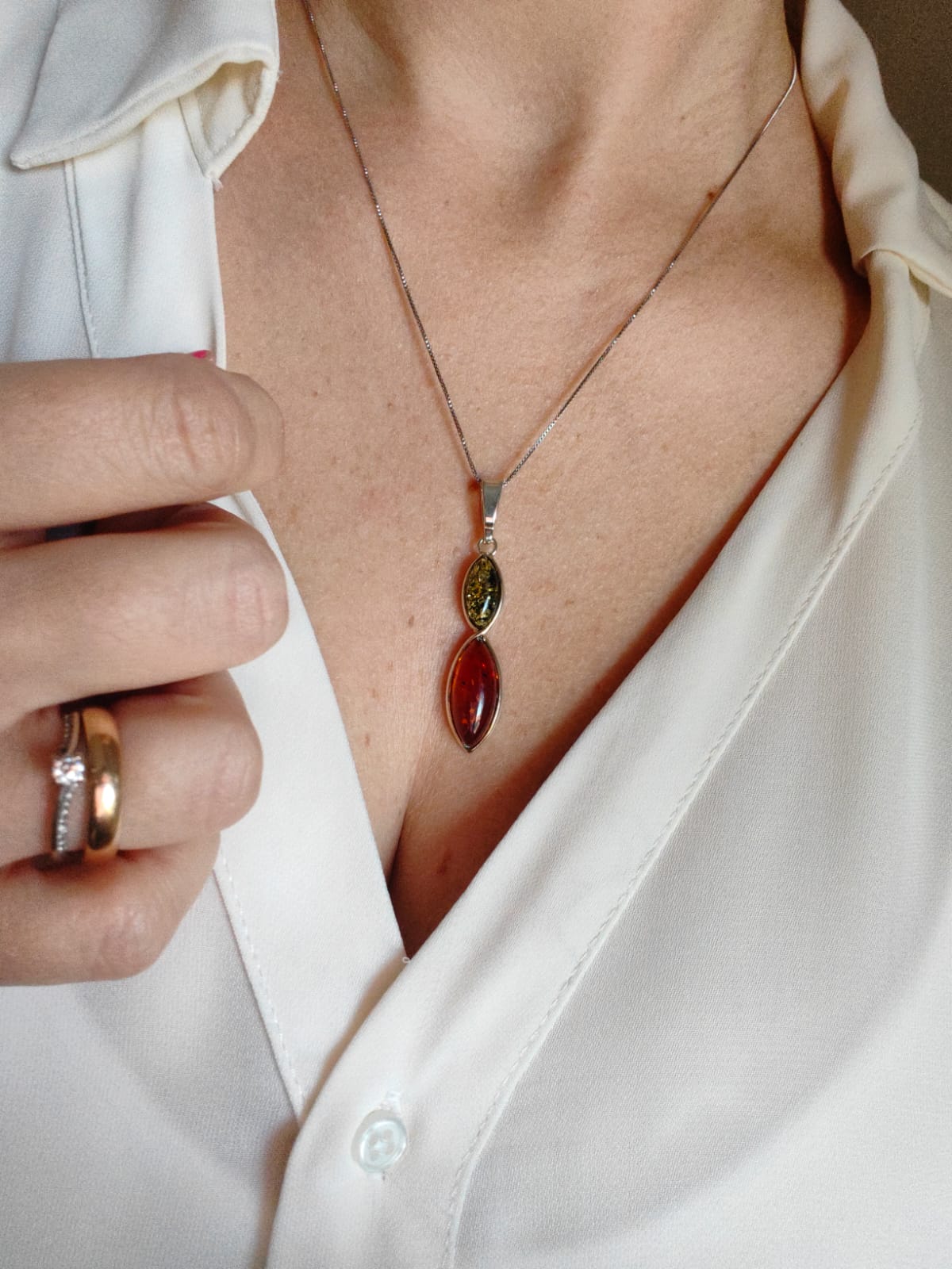La collana ambra verde e cognac è una creazione artigianale. Ogni pietra è diversa dall’altra: le inclusioni, le sfumature e i riflessi rendono ogni pezzo unico. Così, chi la indossa porta con sé non solo un gioiello, ma una piccola opera d’arte irripetibile.