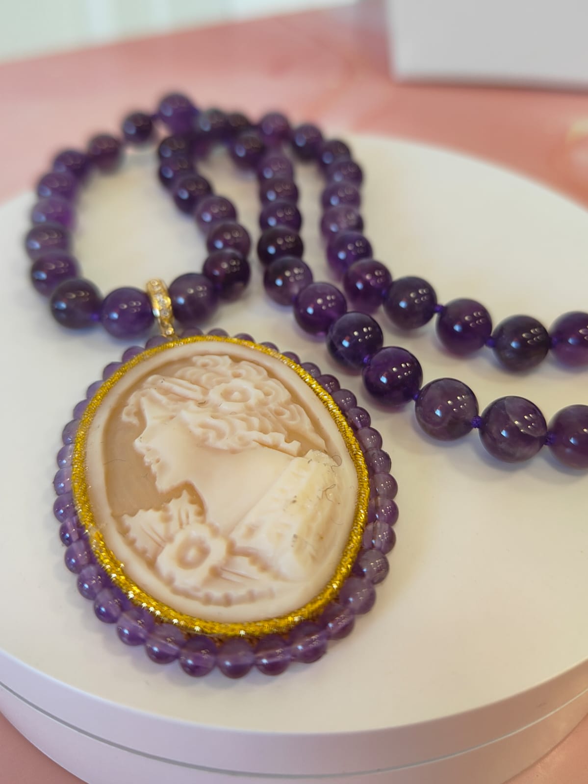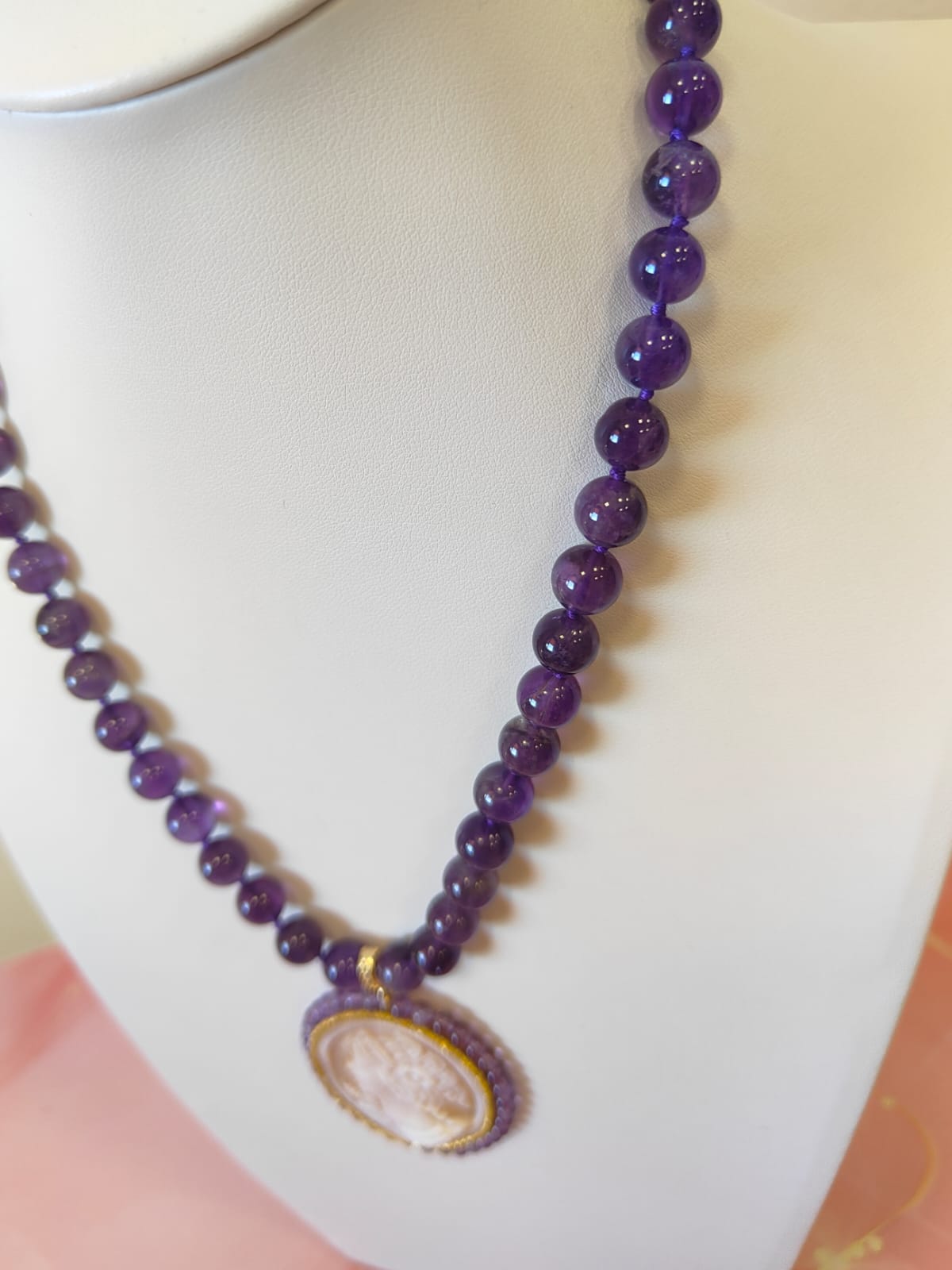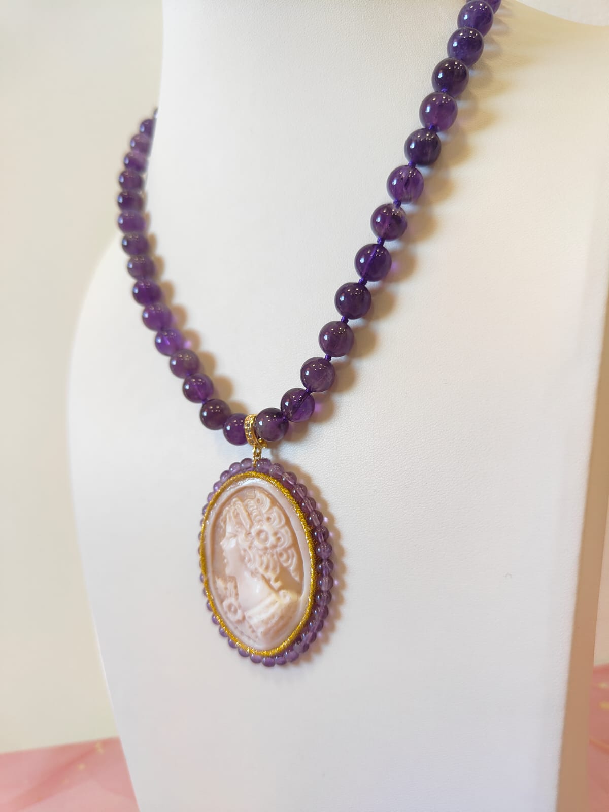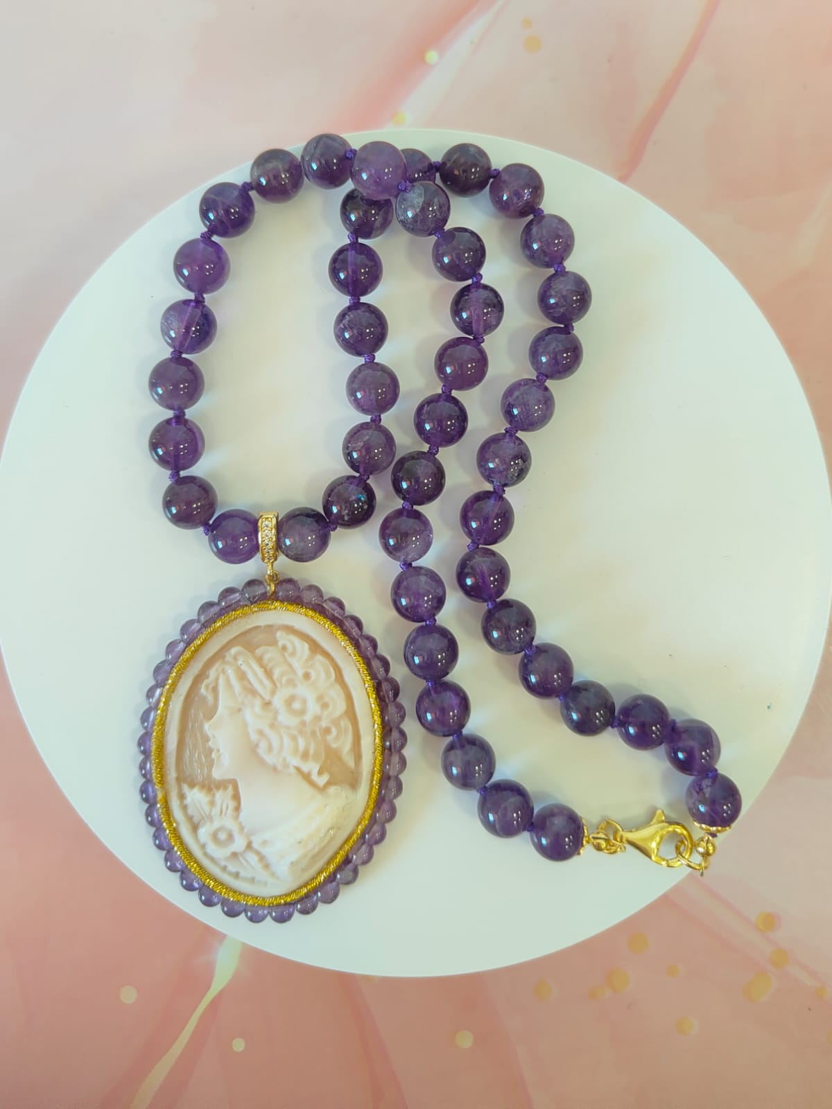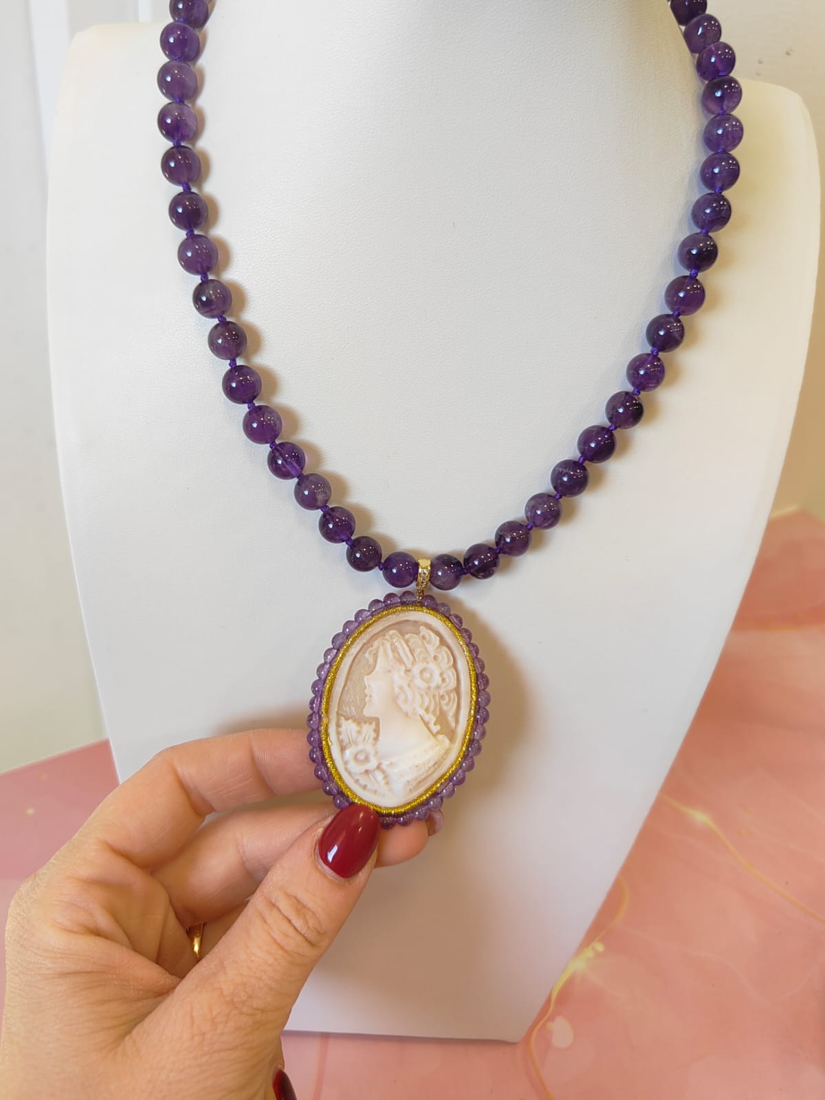 Raffinata collana ametista con cammeo inciso a mano, con ametista naturale, chiusura in argento placcato oro e dettagli luminosi. Gioiello artigianale elegante.