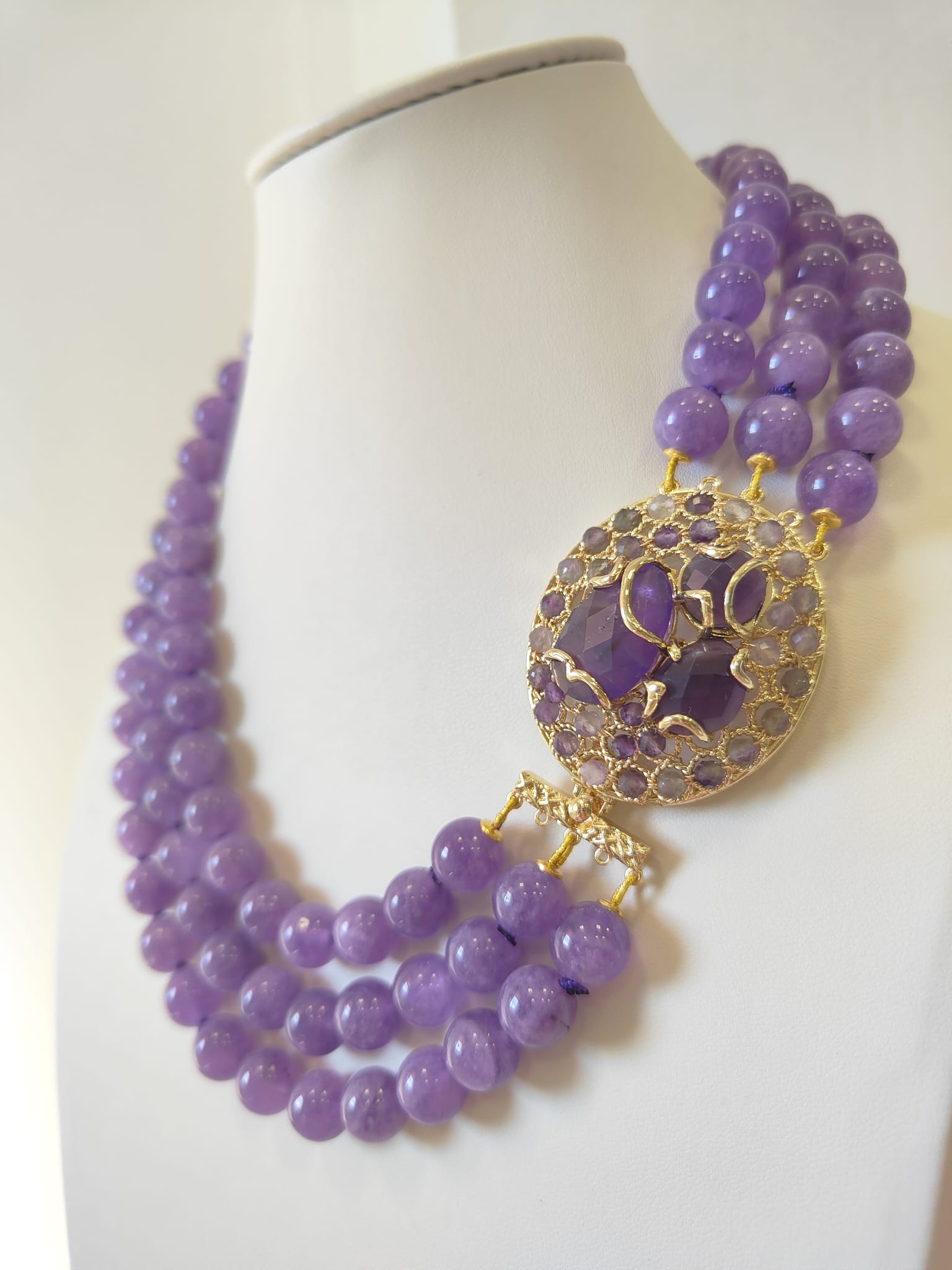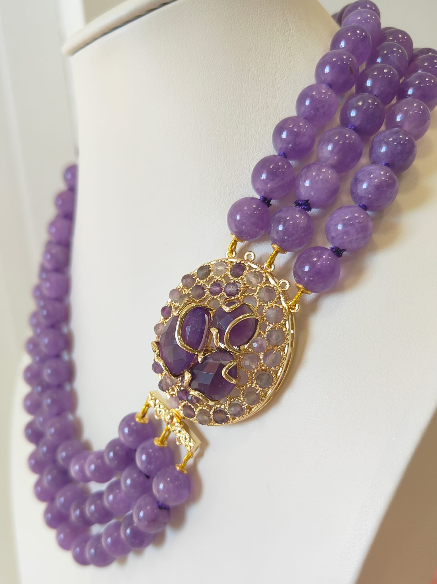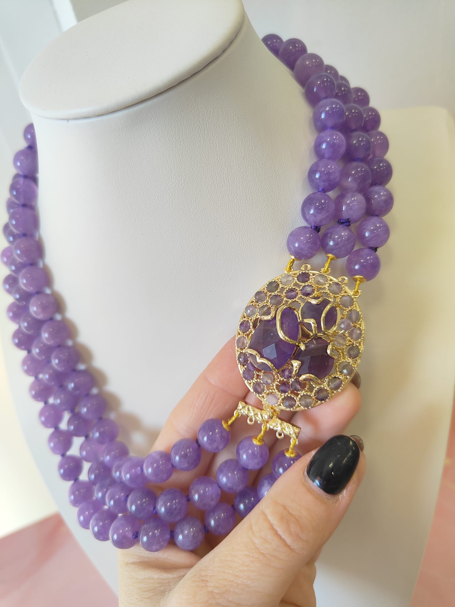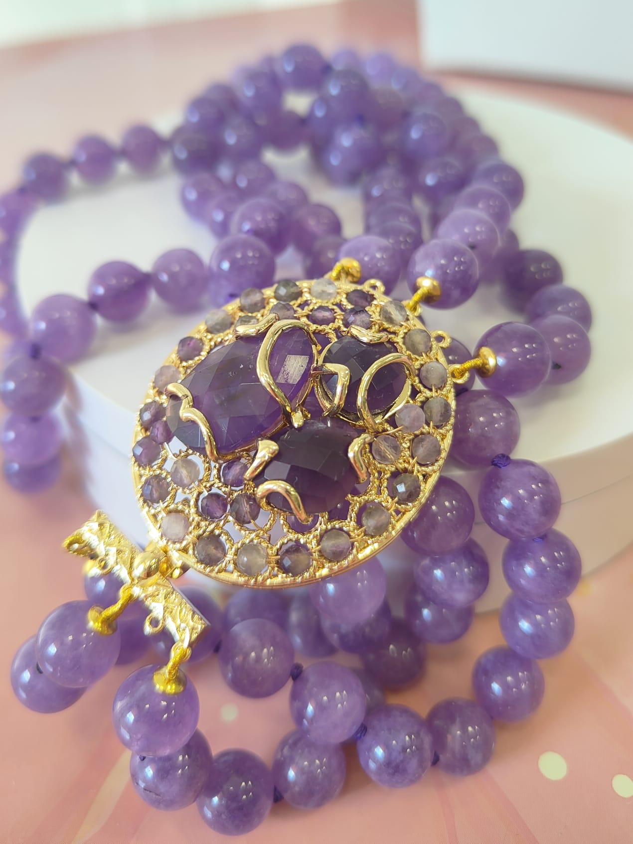 Il design di questa collana è arricchito da una preziosa chiusura laterale in ottone dorato, finemente lavorata e impreziosita da un grande frammento di ametista incastonato al centro. La montatura traforata dorata, con micro pietre che la circondano, crea un gioco di riflessi sofisticato e luminoso. Non si tratta di una semplice chiusura, ma di un vero e proprio elemento decorativo che diventa il punto focale del gioiello, da mostrare con orgoglio.