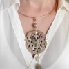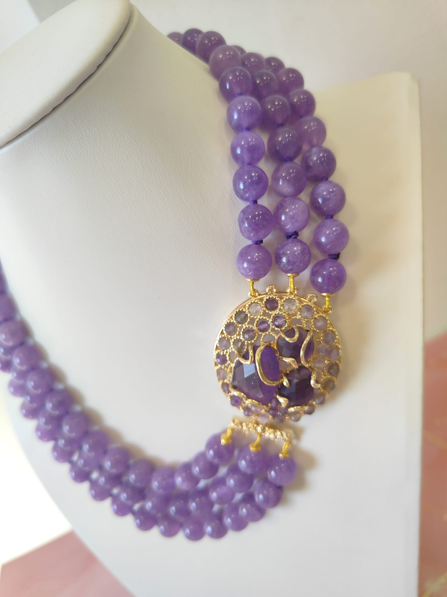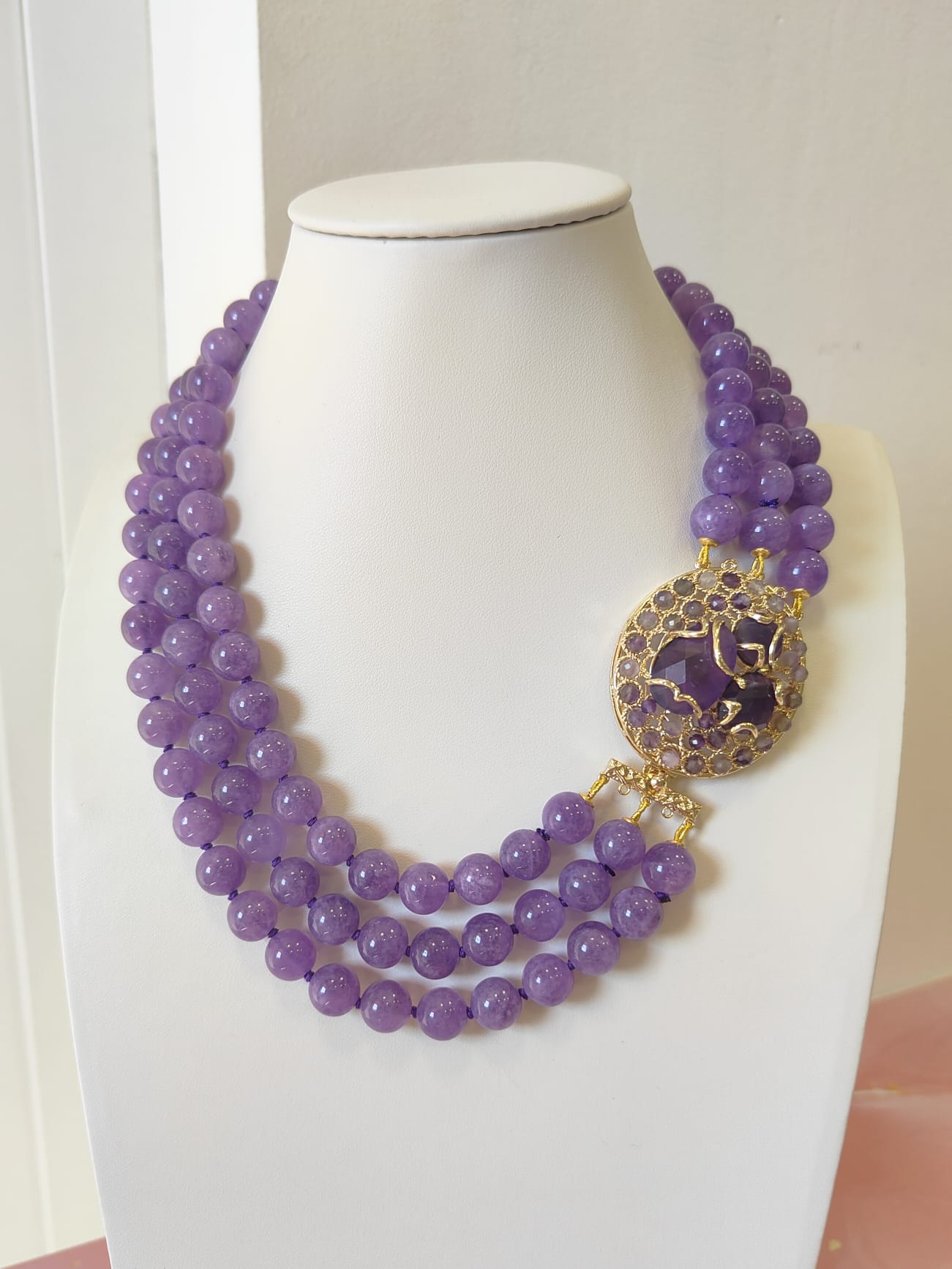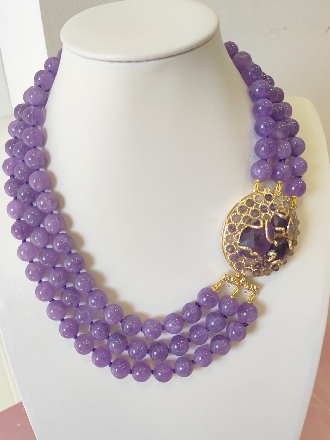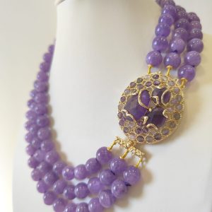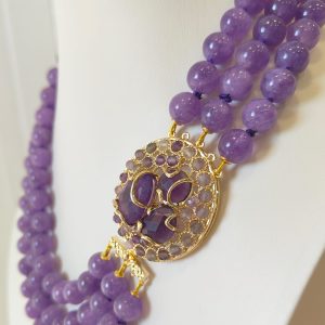 Il design di questa collana è arricchito da una preziosa chiusura laterale in ottone dorato, finemente lavorata e impreziosita da un grande frammento di ametista incastonato al centro. La montatura traforata dorata, con micro pietre che la circondano, crea un gioco di riflessi sofisticato e luminoso. Non si tratta di una semplice chiusura, ma di un vero e proprio elemento decorativo che diventa il punto focale del gioiello, da mostrare con orgoglio.
