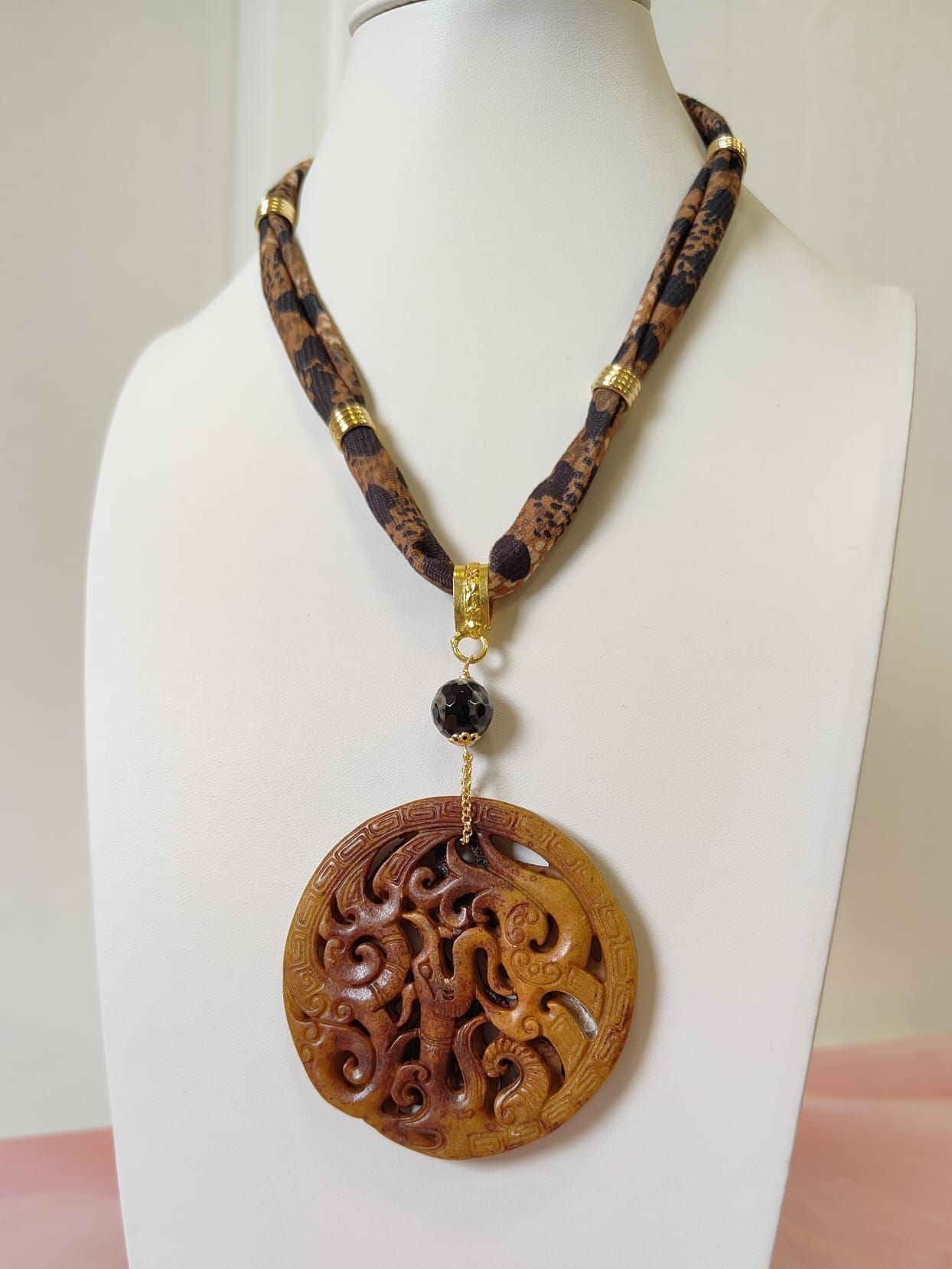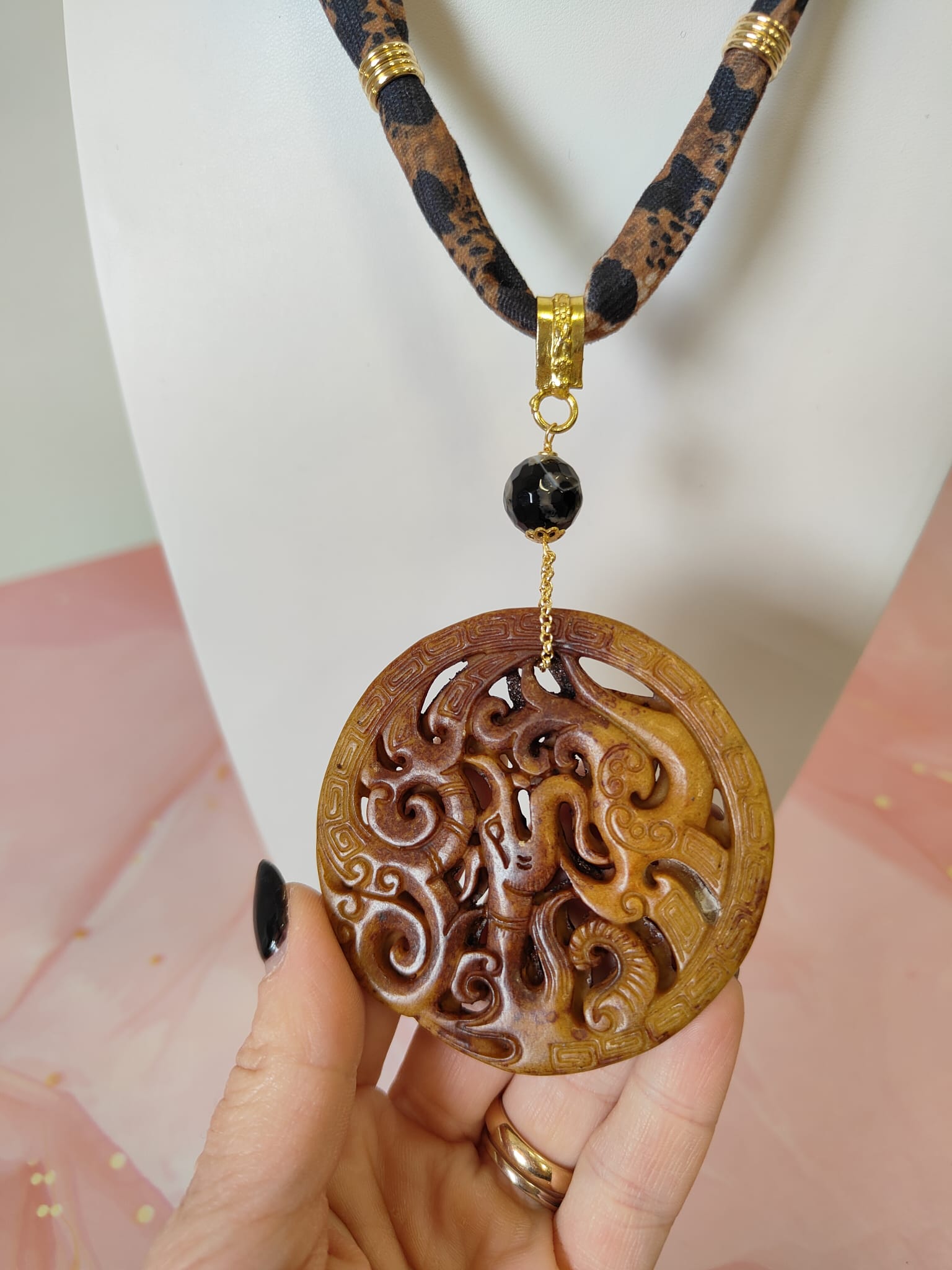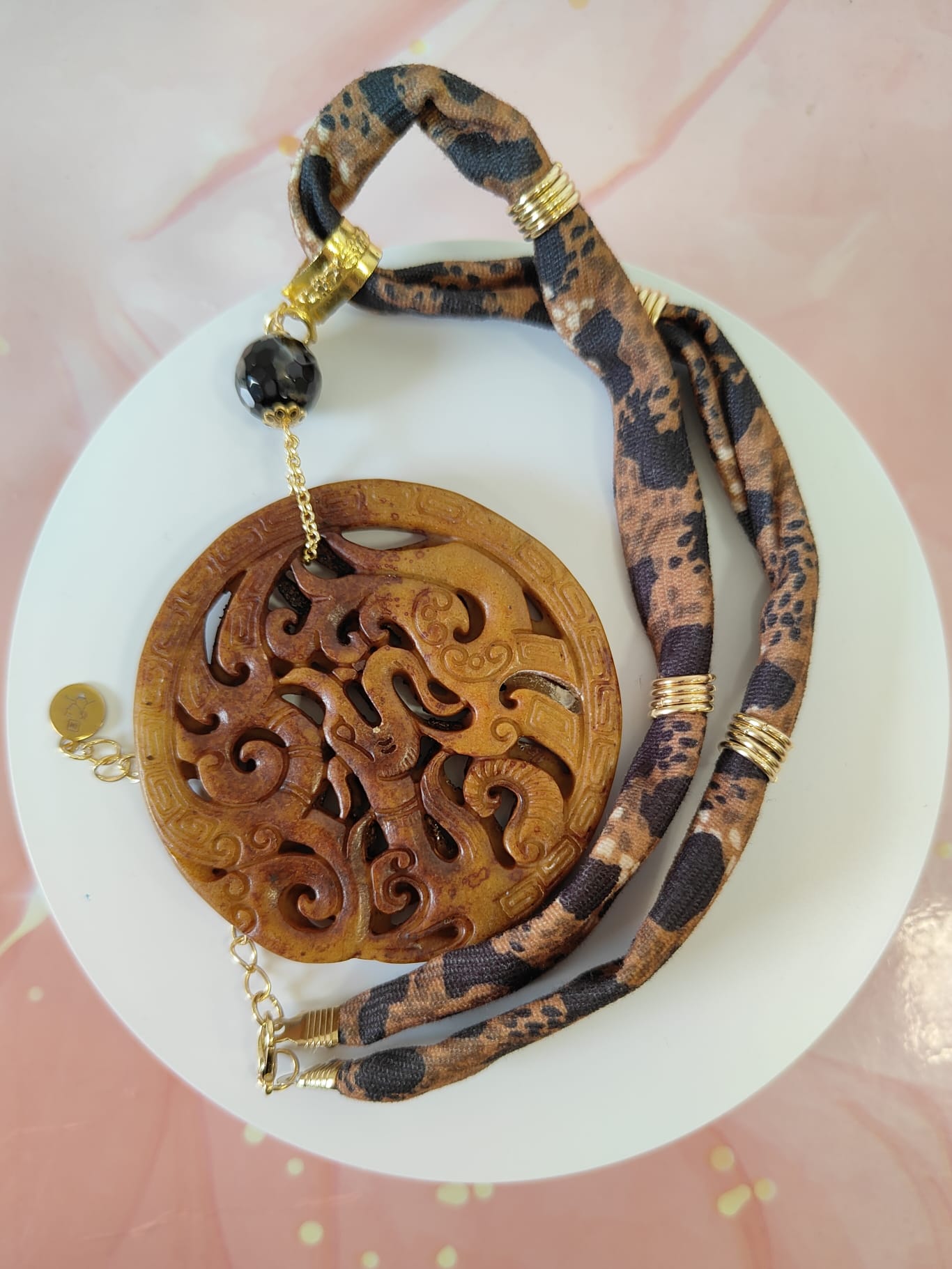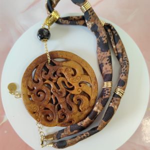 La collana animalier e mandala è un gioiello dal carattere deciso, pensato per chi ama gli accessori capaci di raccontare una storia attraverso dettagli preziosi. Il tessuto animalier che avvolge il girocollo dona un’energia selvaggia e sofisticata, mentre il grande mandala in giada antica, riccamente intagliato, aggiunge un’allure mistica e simbolica, creando un contrasto armonioso che rende questo pezzo unico nel suo genere. Chi indossa questa collana porta con sé un elemento di stile che unisce forza, eleganza e una vena boho–etnica.