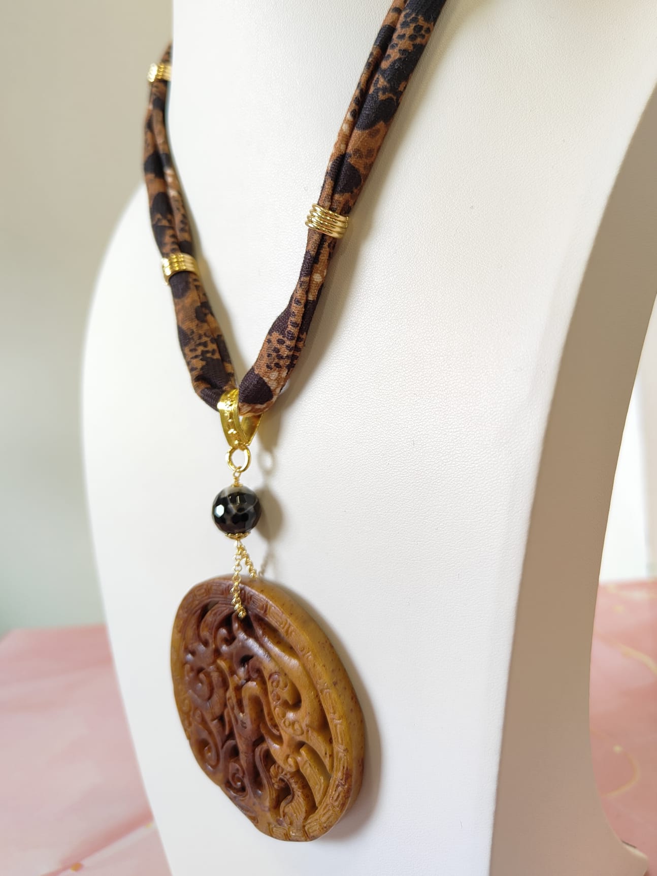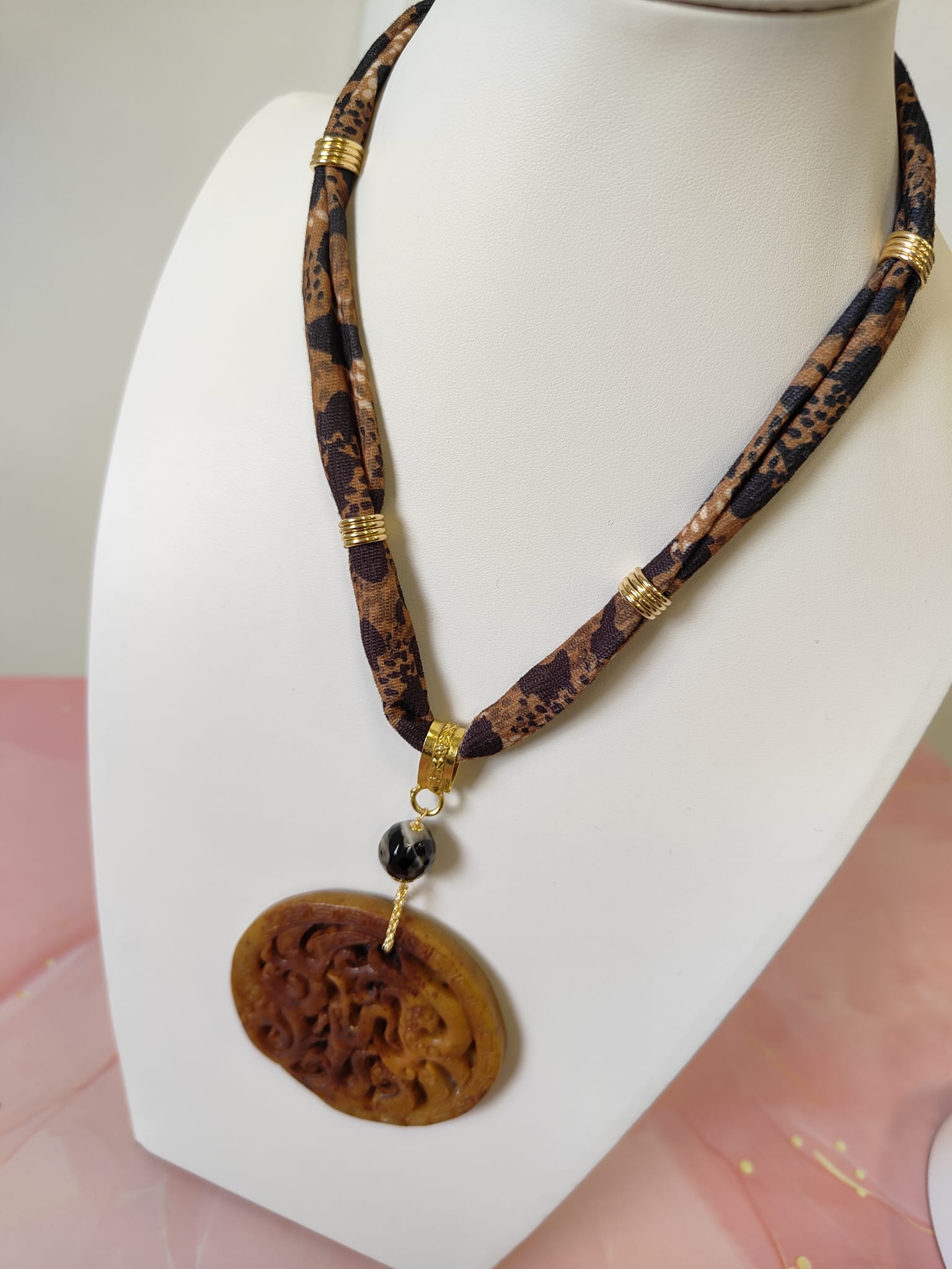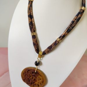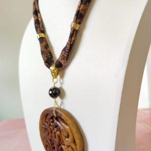 La collana animalier e mandala è un gioiello dal carattere deciso, pensato per chi ama gli accessori capaci di raccontare una storia attraverso dettagli preziosi. Il tessuto animalier che avvolge il girocollo dona un’energia selvaggia e sofisticata, mentre il grande mandala in giada antica, riccamente intagliato, aggiunge un’allure mistica e simbolica, creando un contrasto armonioso che rende questo pezzo unico nel suo genere. Chi indossa questa collana porta con sé un elemento di stile che unisce forza, eleganza e una vena boho–etnica.