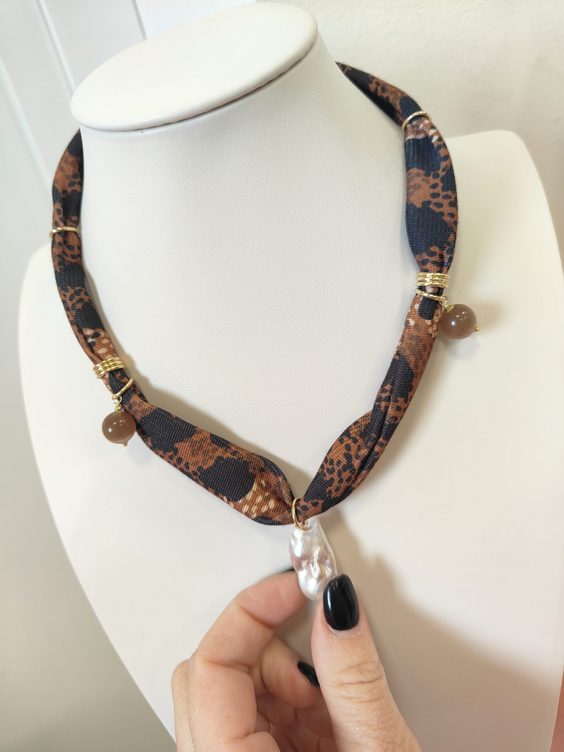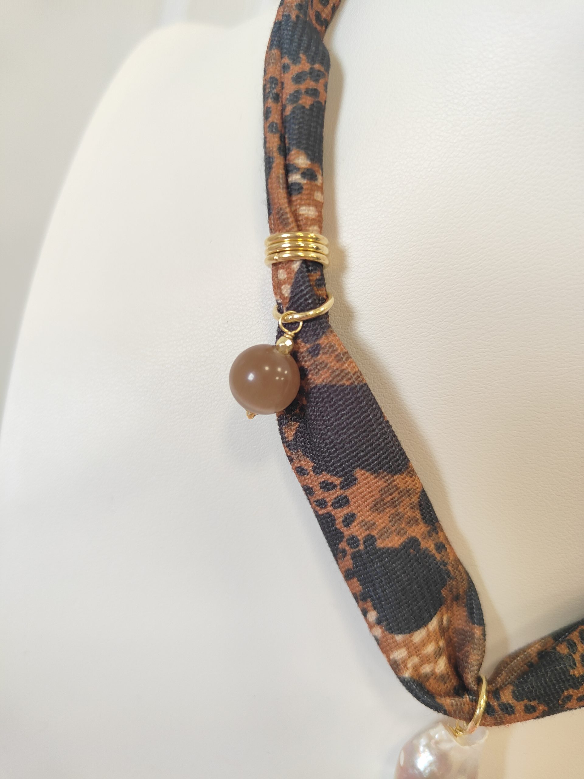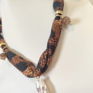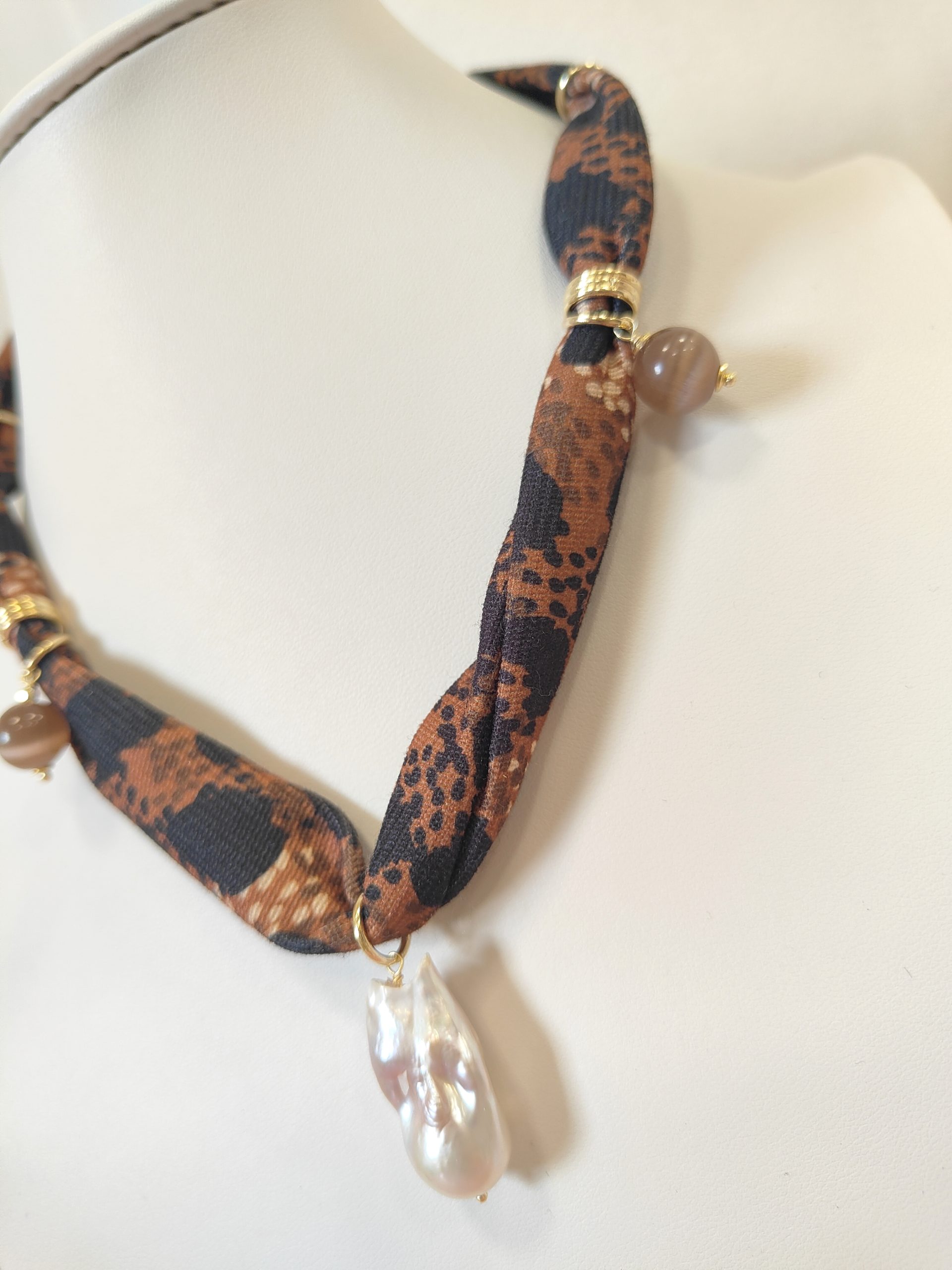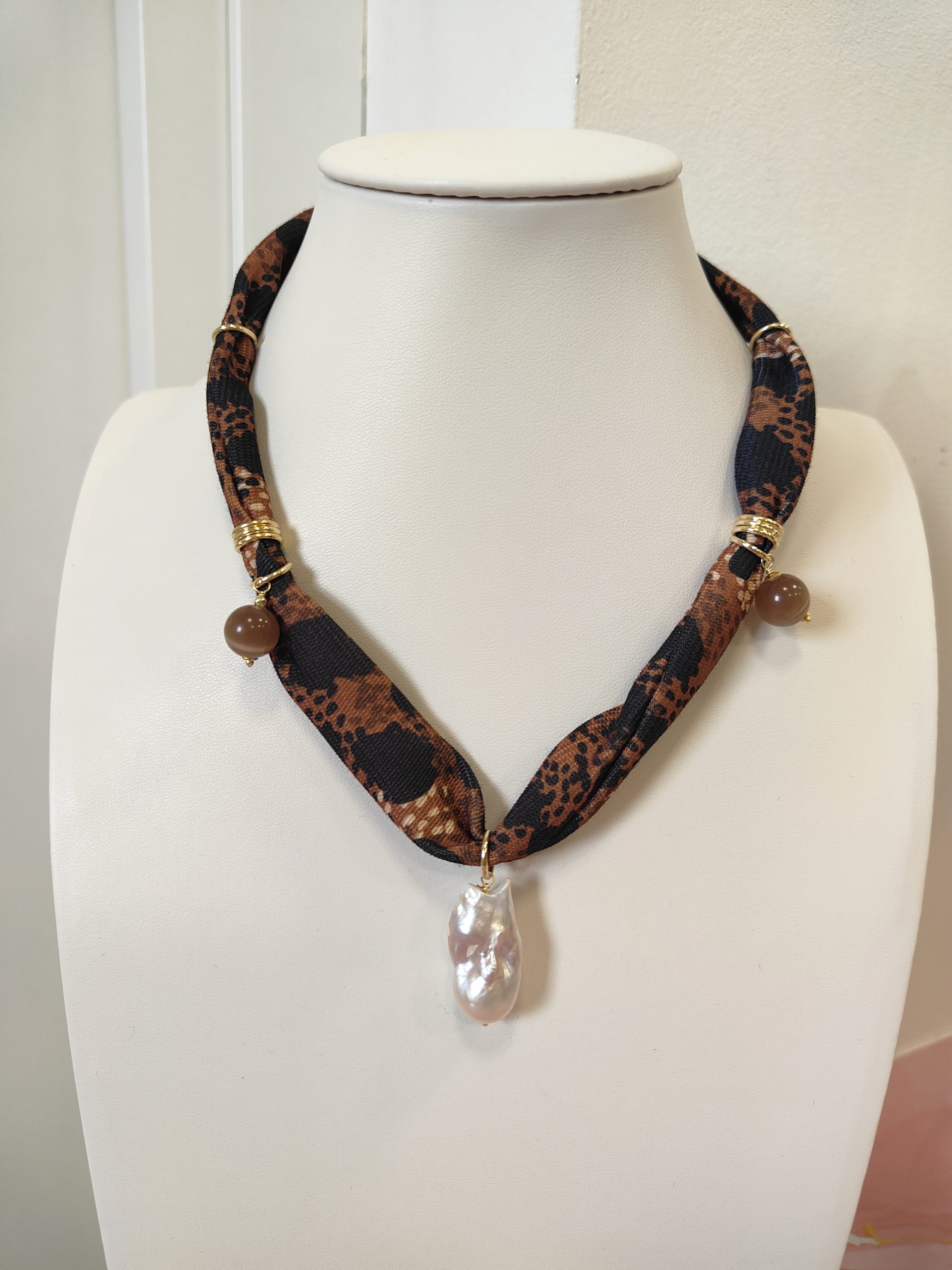 Materiali: stoffa fantasia animalier, occhio di gatto naturale, perla barocca, inserti e chiusura in ottone