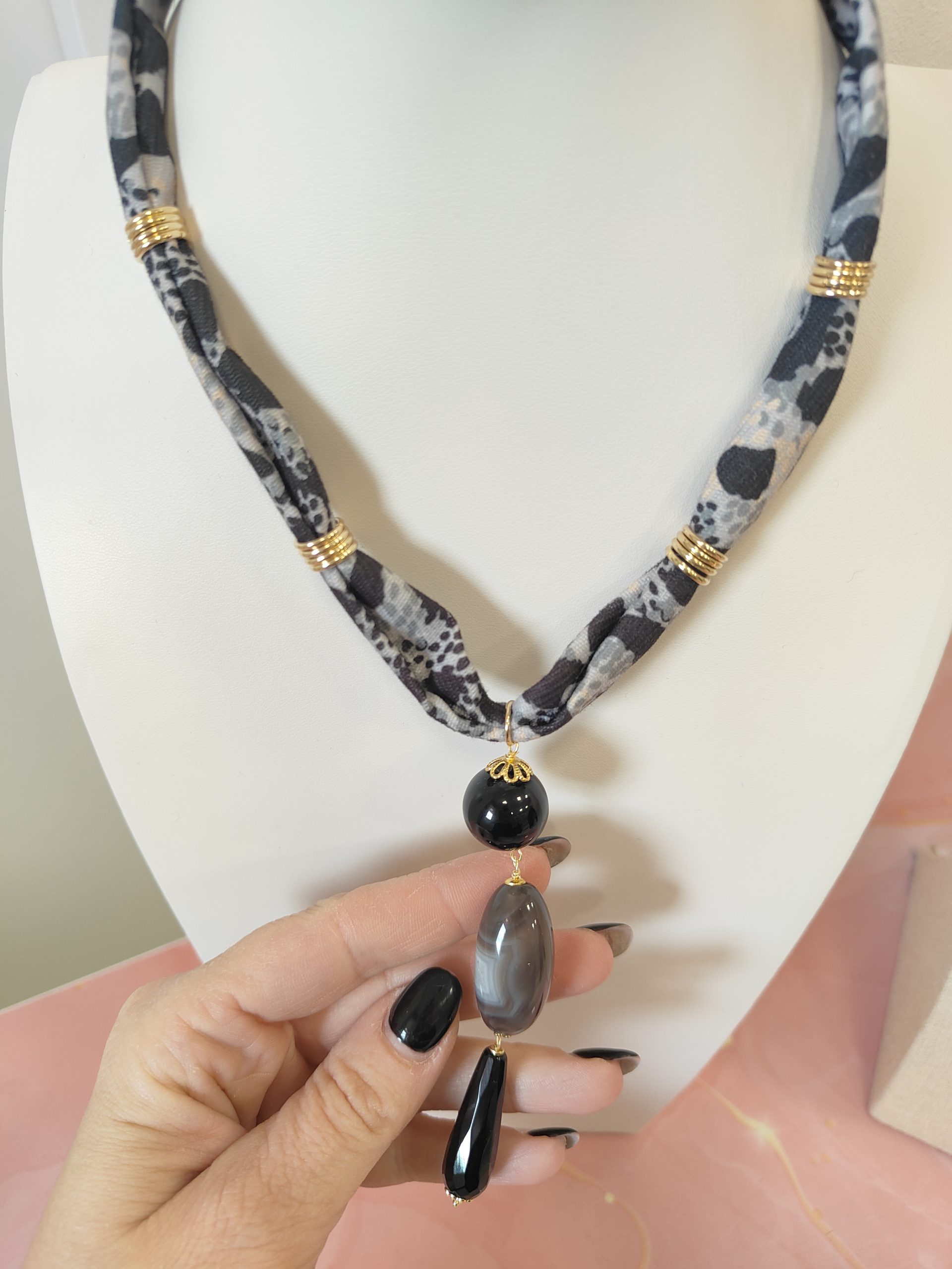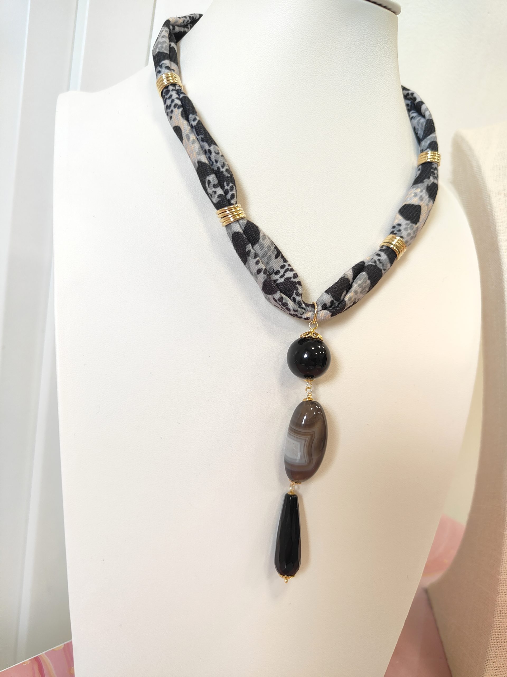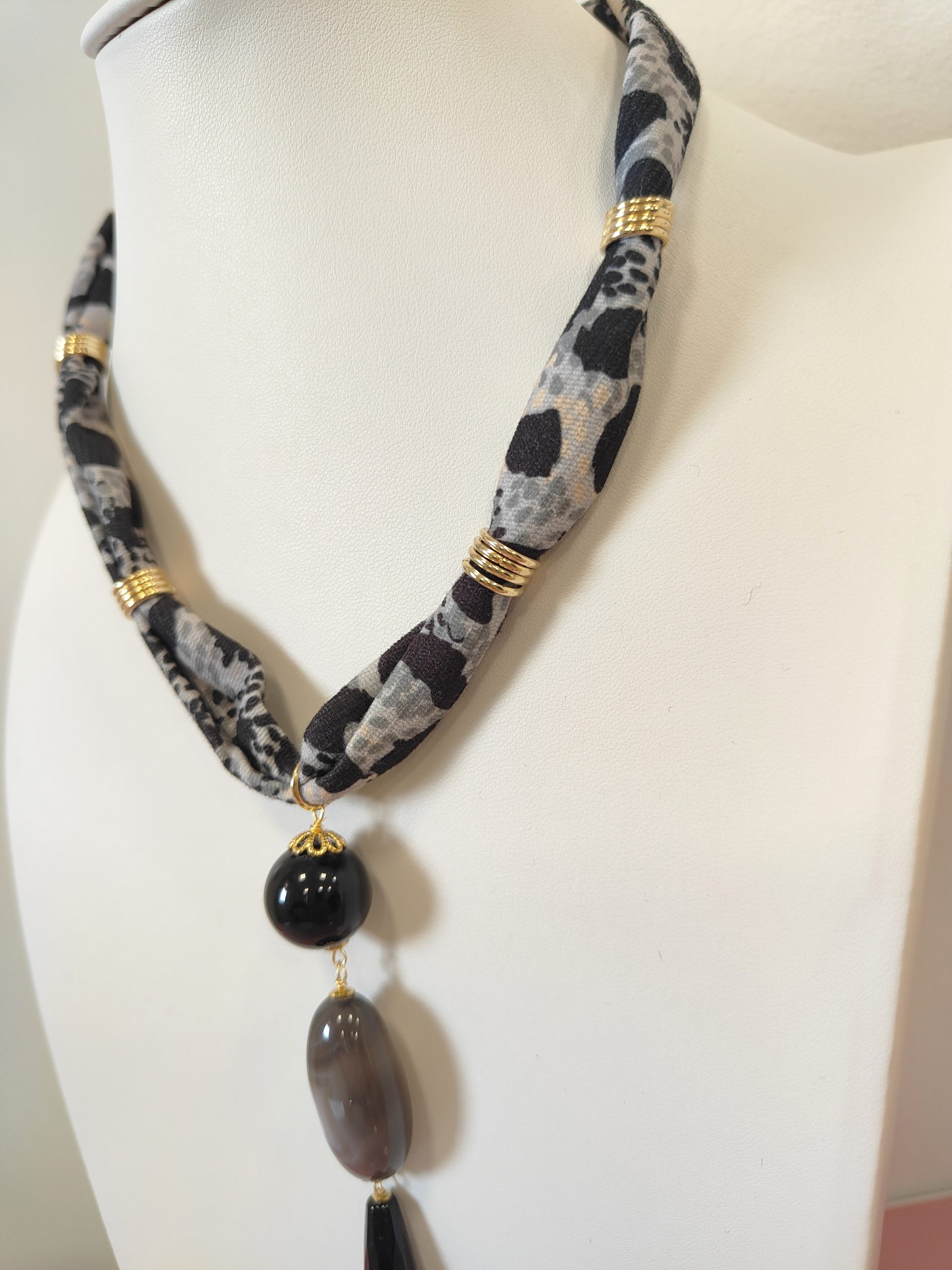 Materiali: stoffa fantasia animalier grigio/nero; onice nero; agata striata naturale; inserti e chiusura in ottone dorato