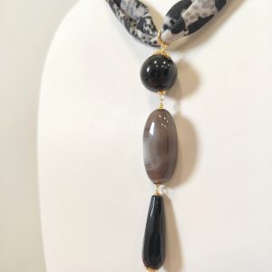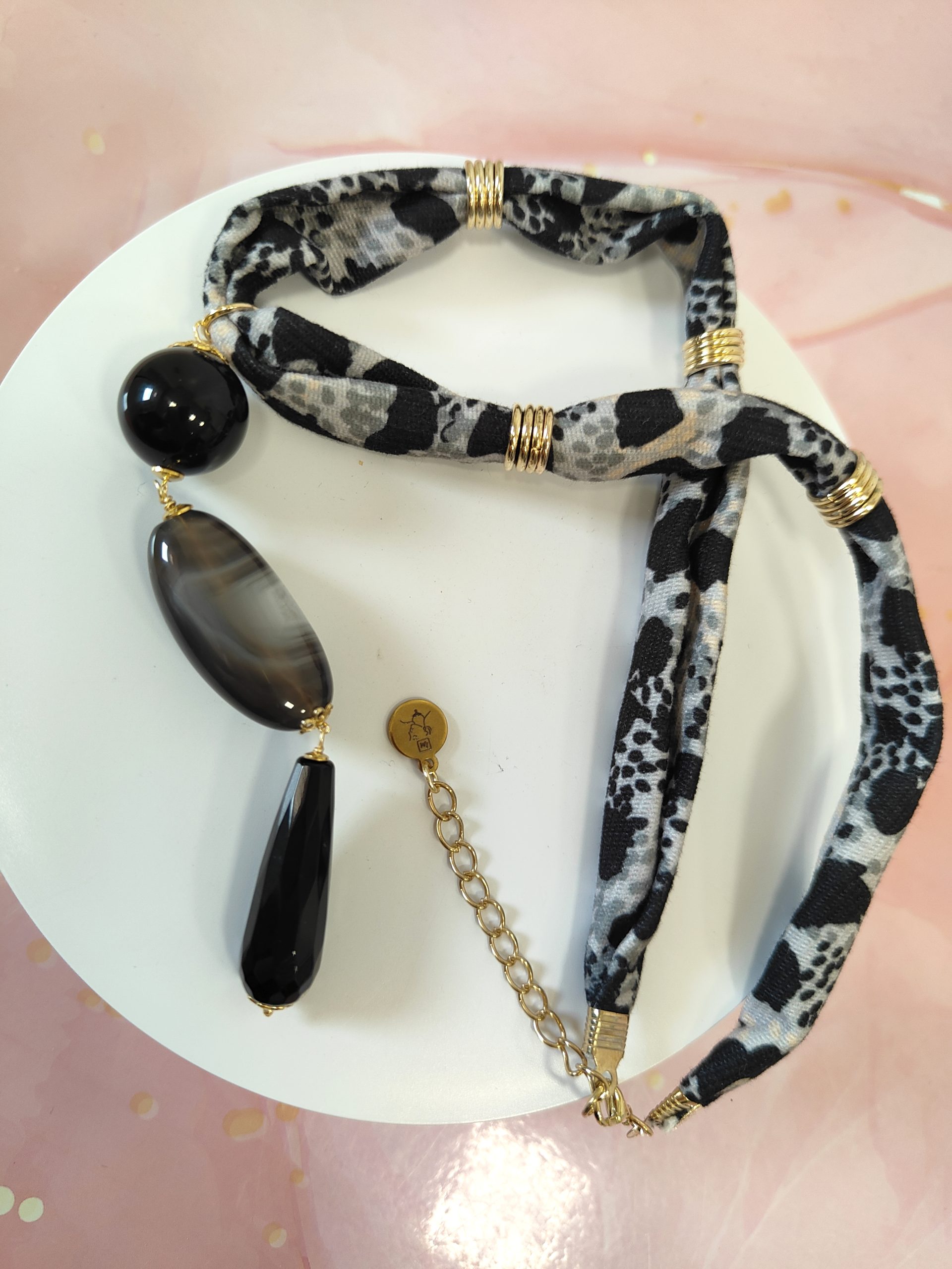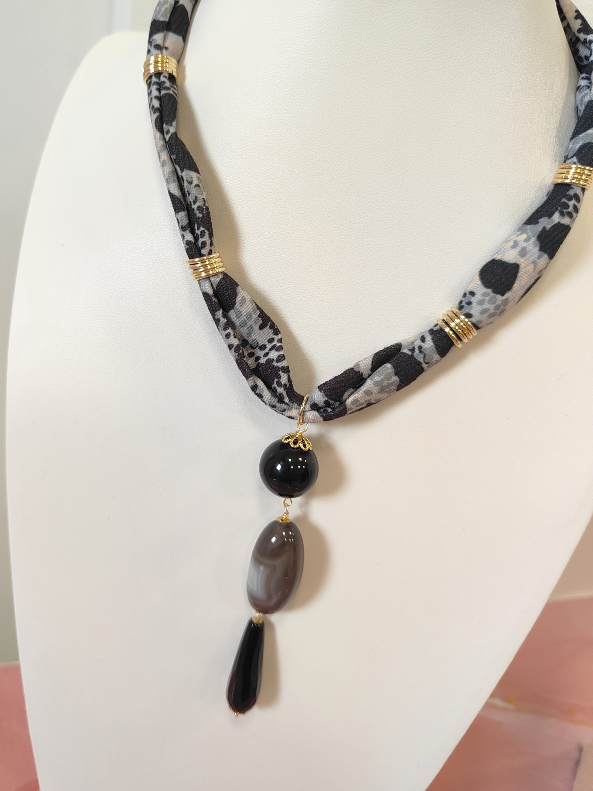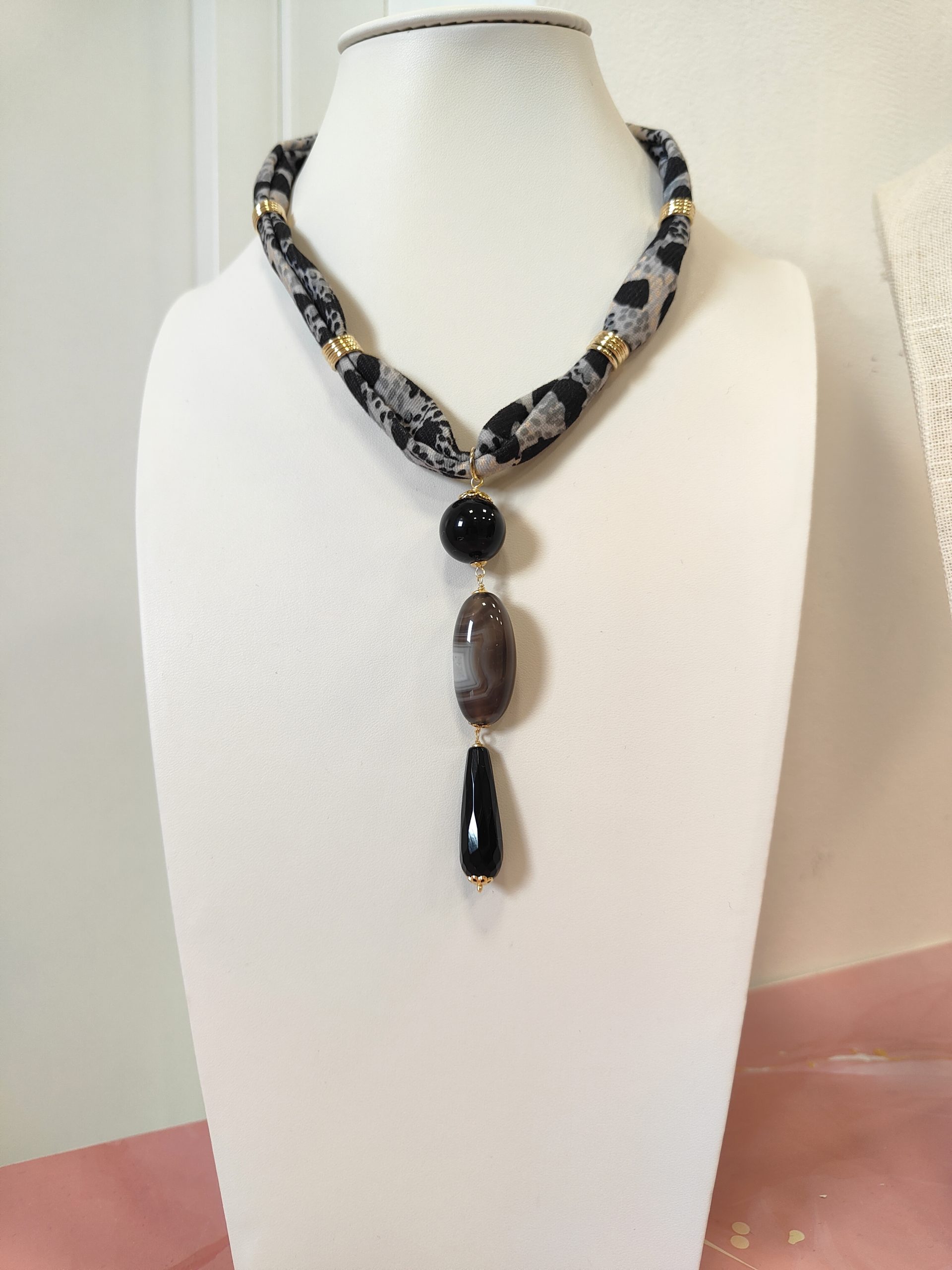 Materiali: stoffa fantasia animalier grigio/nero; onice nero; agata striata naturale; inserti e chiusura in ottone dorato