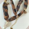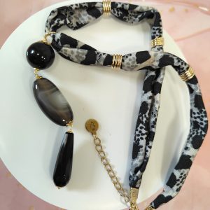 La collana animalier onice agata è un gioiello dal carattere forte e sofisticato, pensato per chi ama le linee decise e i contrasti raffinati. Il laccio in morbida stoffa, decorato con una fantasia animalier nei toni del grigio, nero e avorio, avvolge con eleganza il collo, creando una base morbida e ricercata che si adatta perfettamente a ogni outfit. Gli inserti dorati, posizionati lungo la trama del tessuto, aggiungono punti luce che risaltano la dinamica della fantasia e conferiscono un tocco prezioso al design.