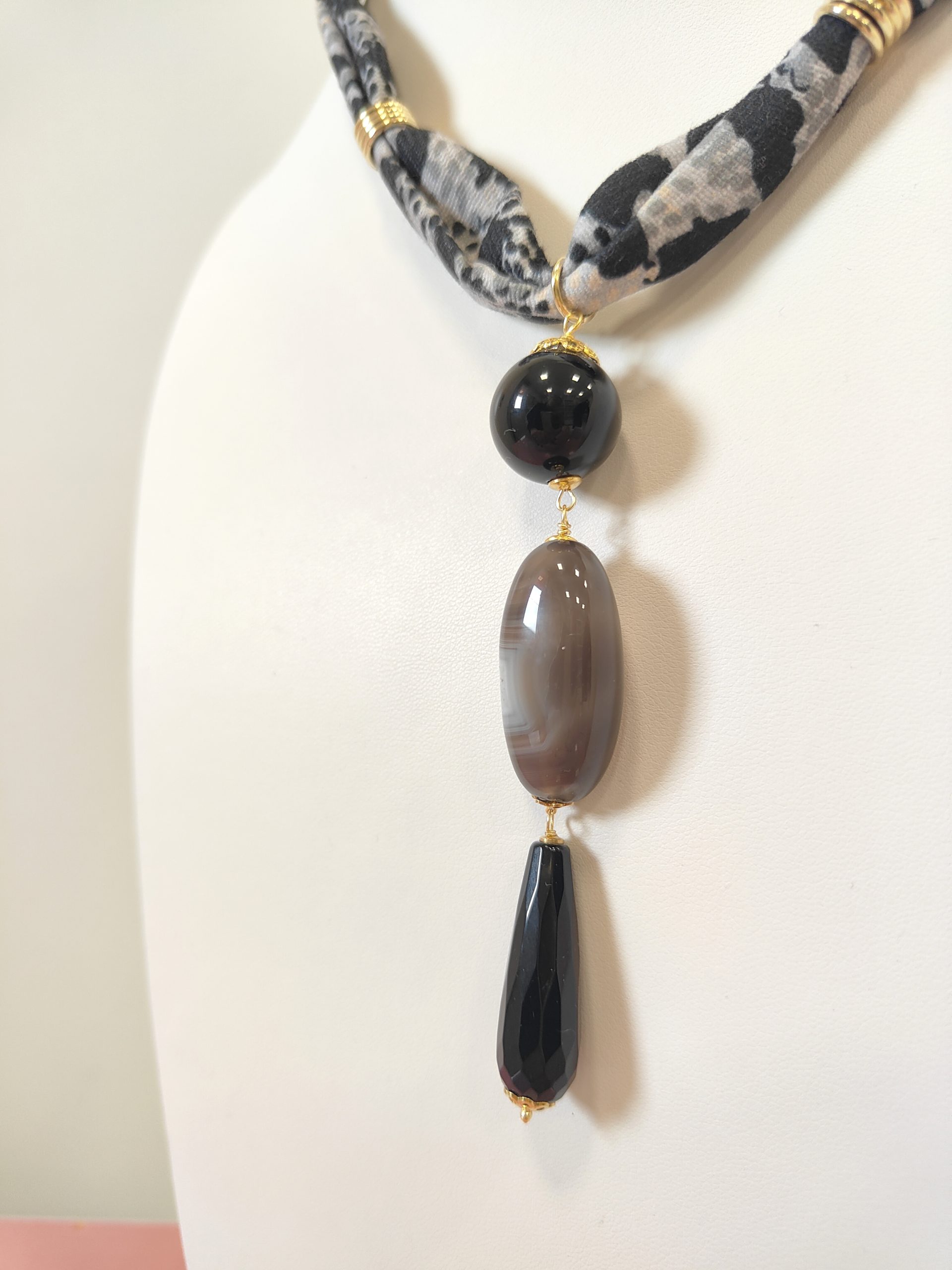 Pendente: sfera in onice nero + ovale in agata striata + goccia sfaccettata in onice nero