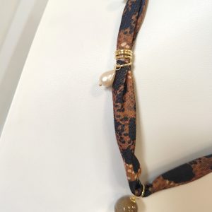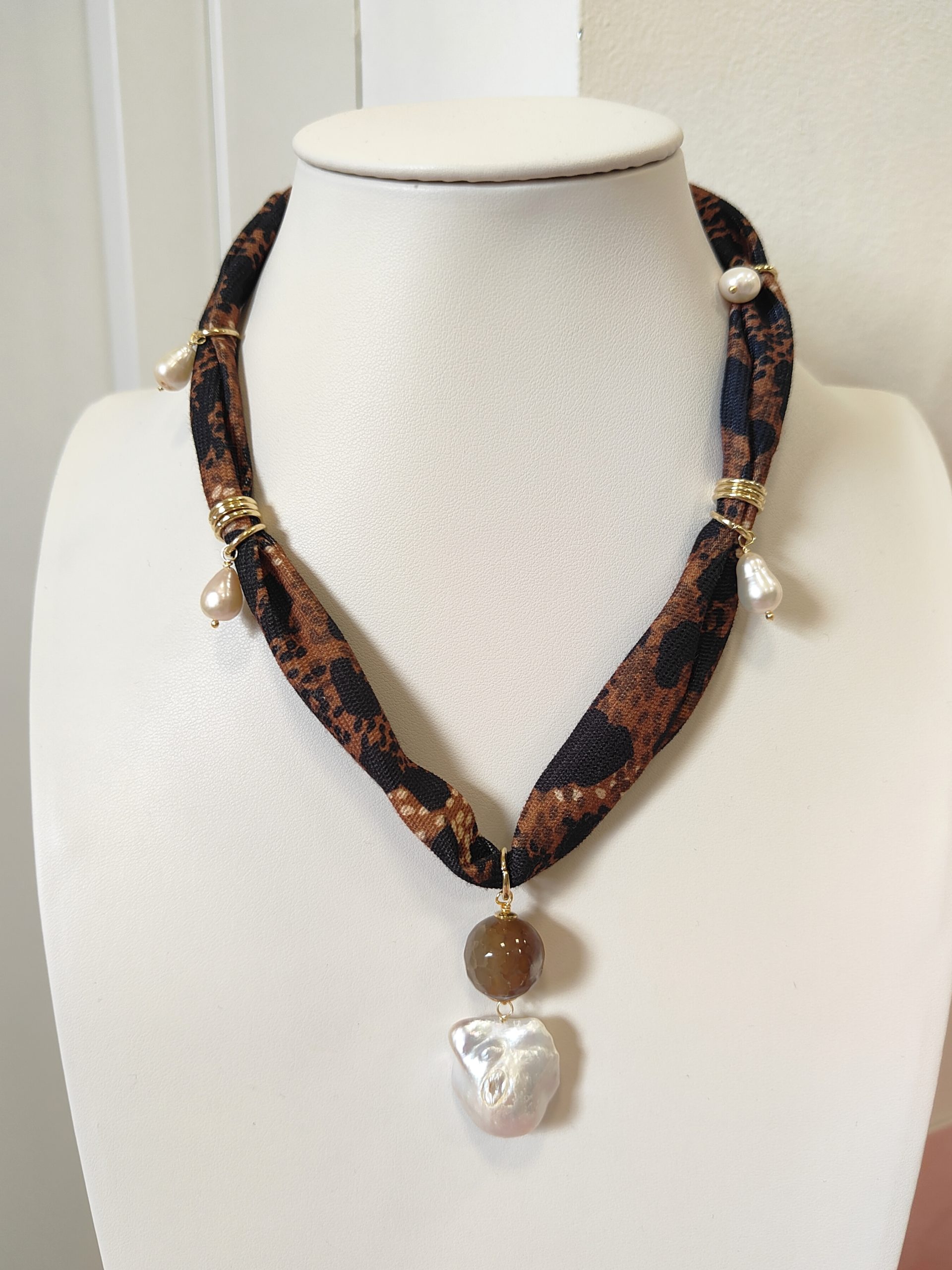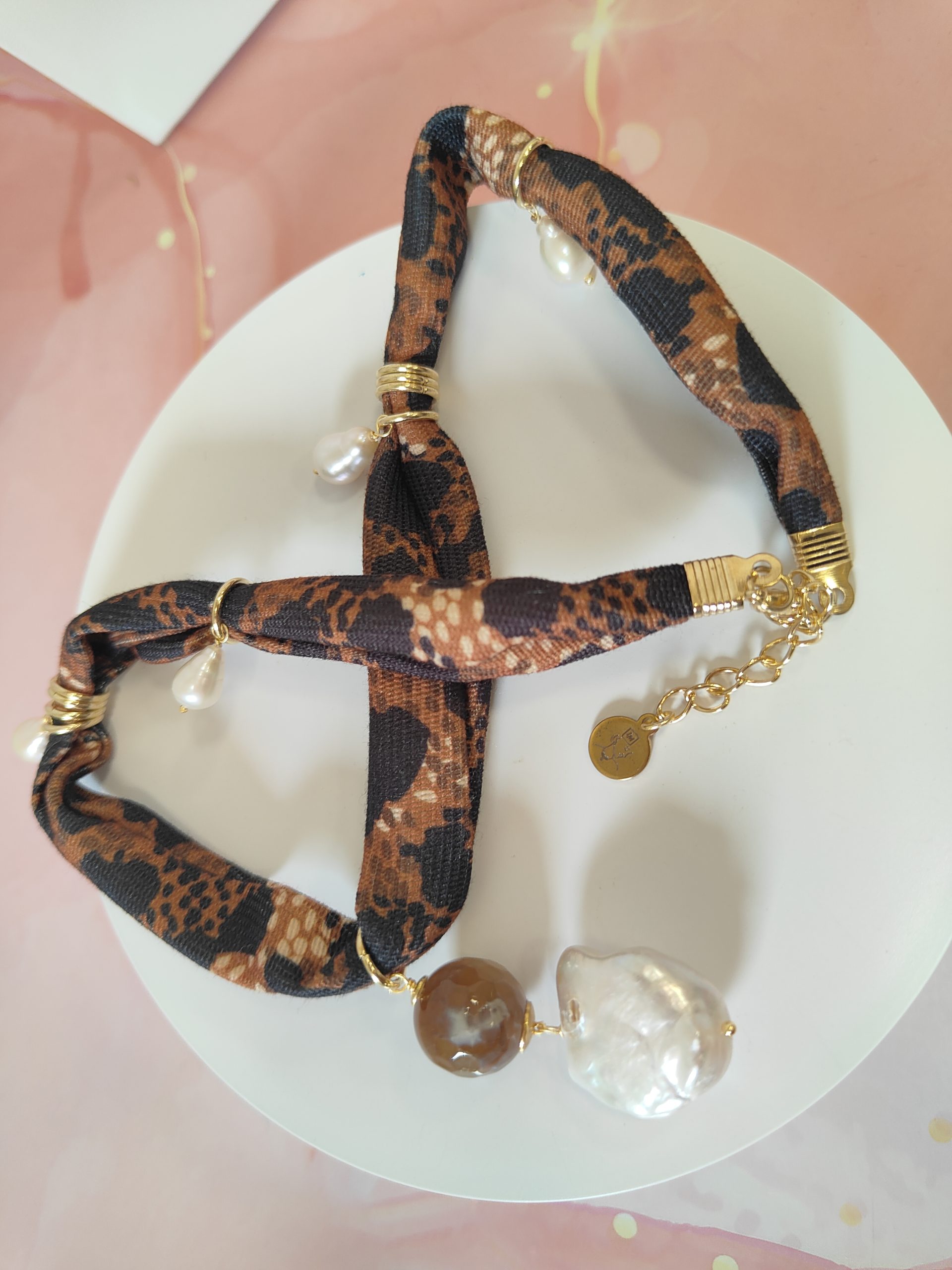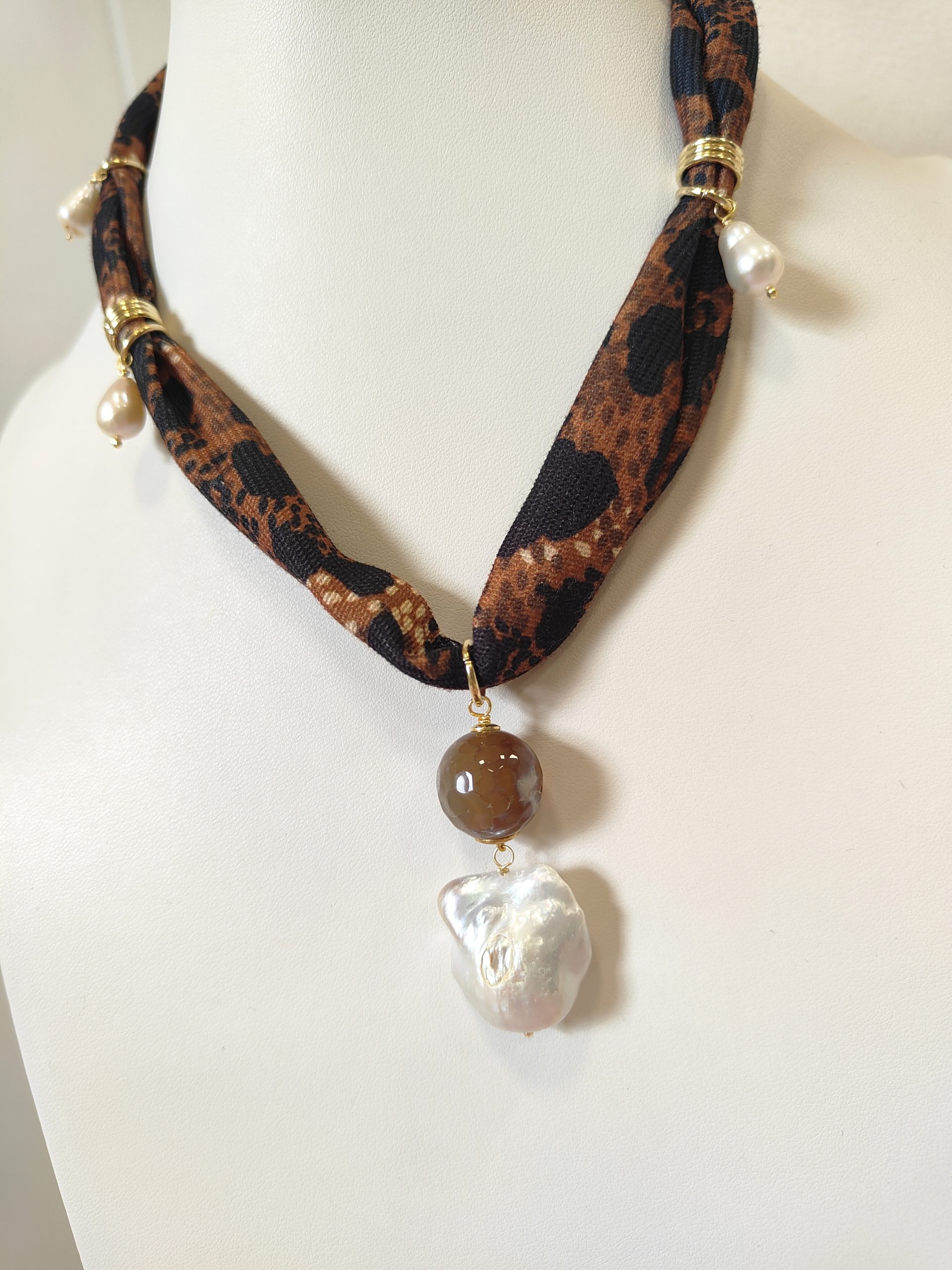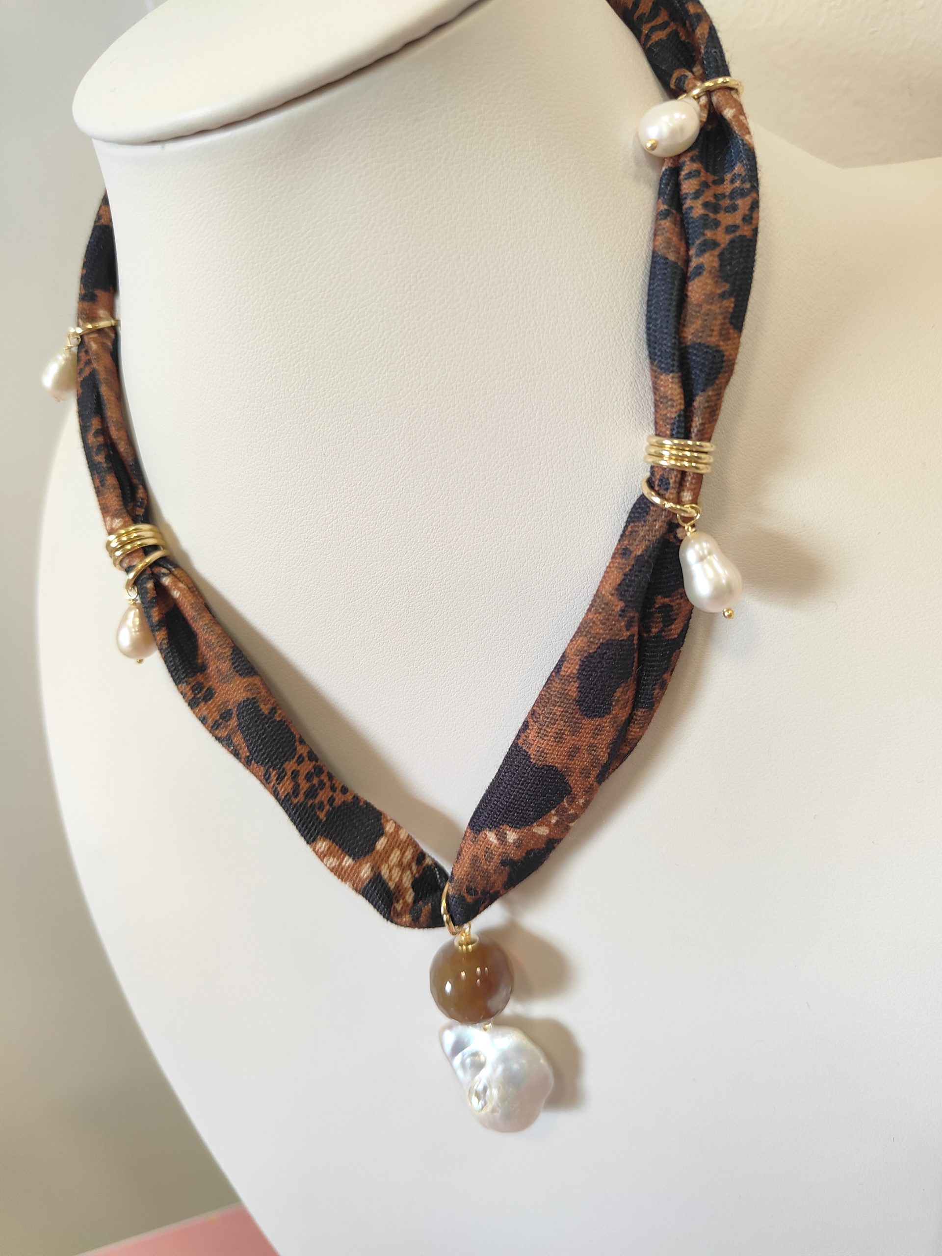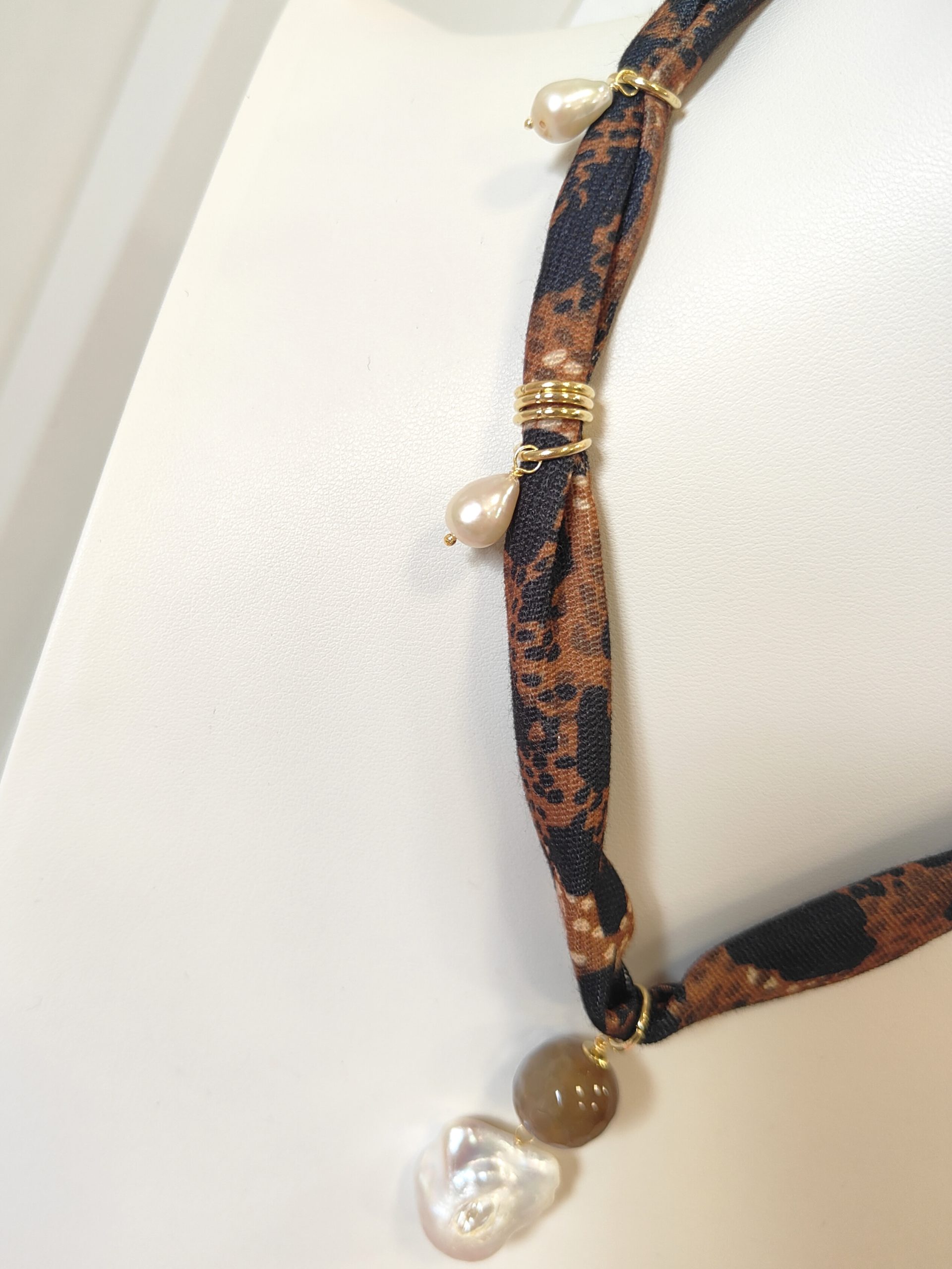 Materiali: laccio in stoffa fantasia animalier; inserti e chiusura in ottone; perle barocche naturali; agata crackle