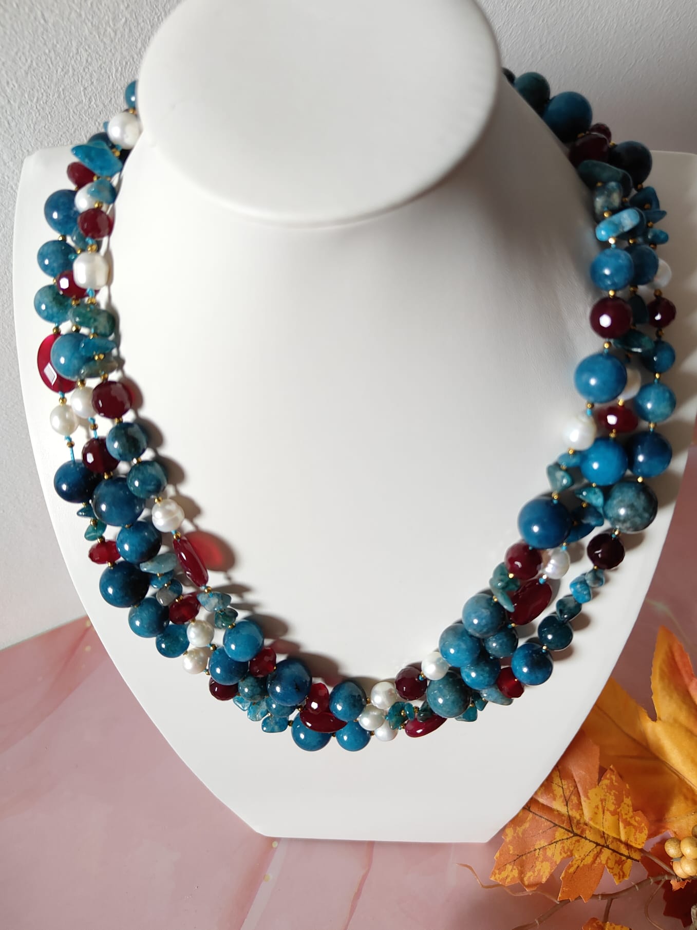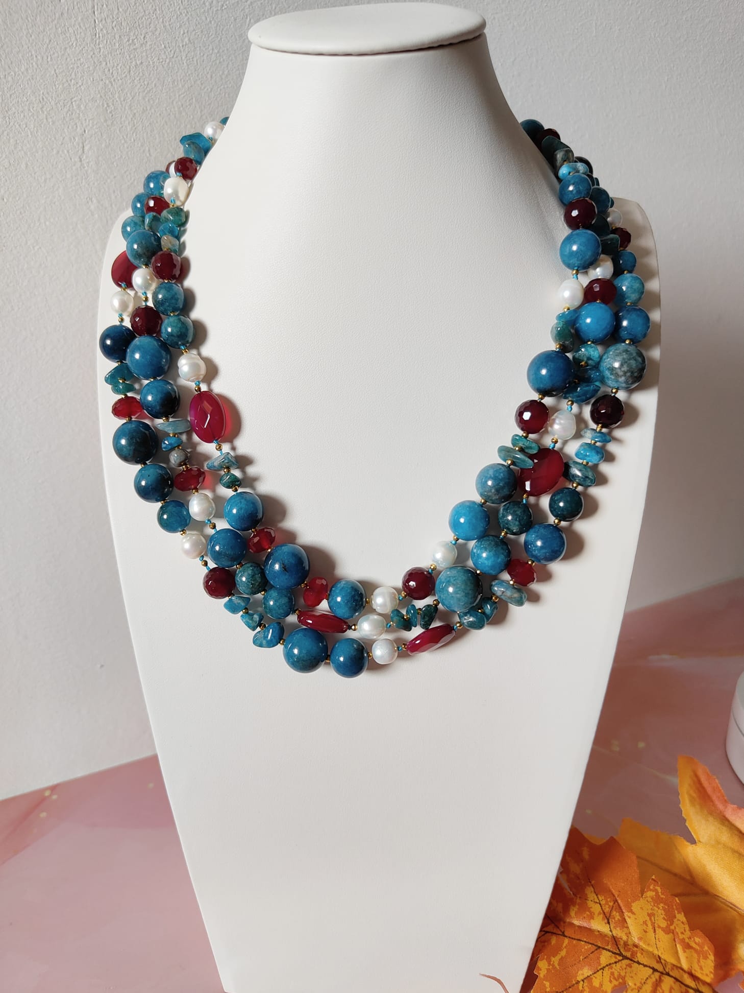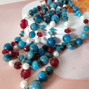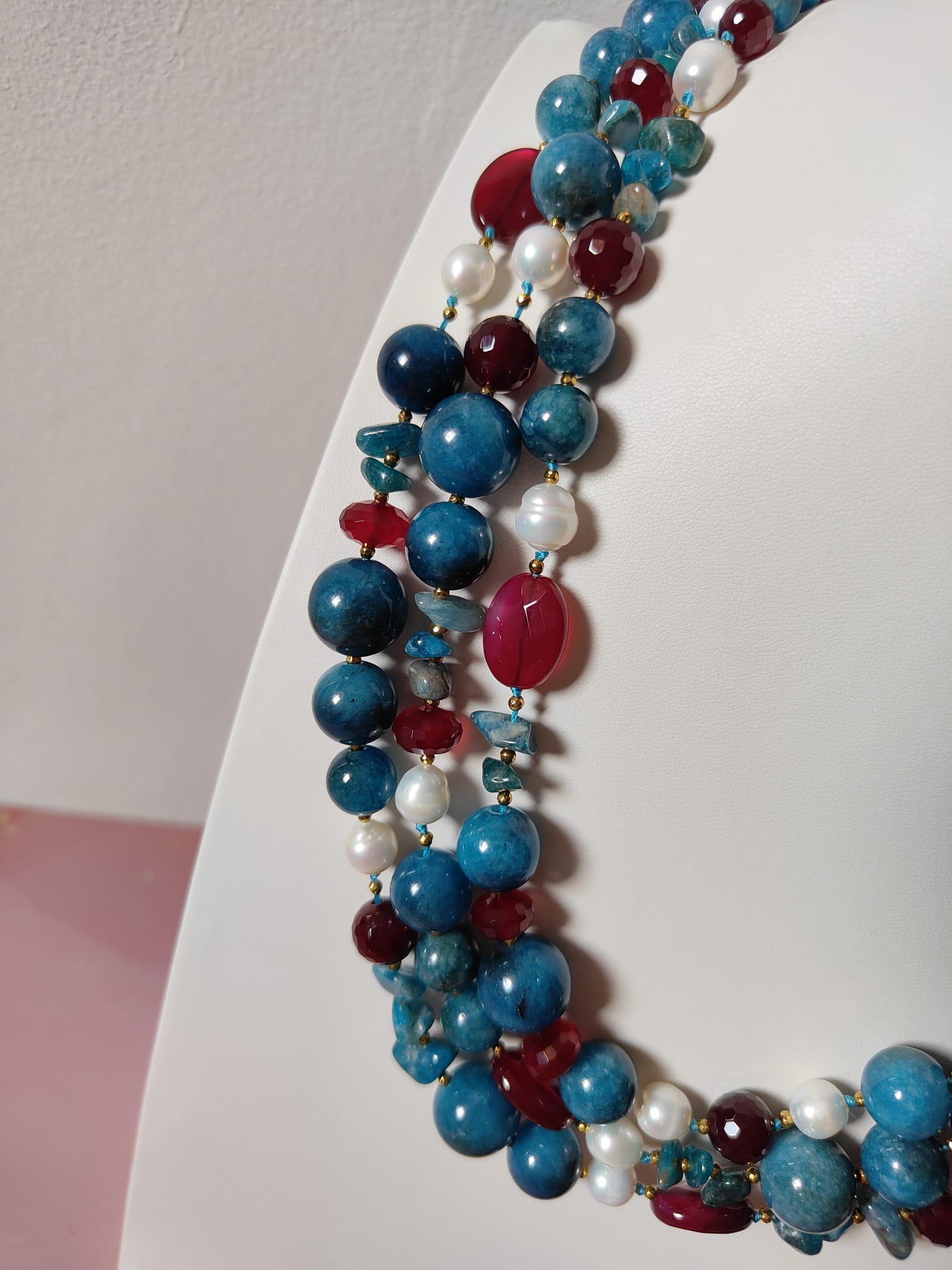 La collana apatite e agata è una creazione artigianale pensata per chi ama gioielli d’impatto, capaci di fondere la forza delle pietre naturali con la delicatezza delle perle. La sua struttura multifilo, arricchita da un’armonia di colori, avvolge il collo con eleganza e personalità, trasformando ogni outfit in un’espressione di stile unico.