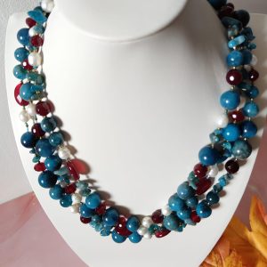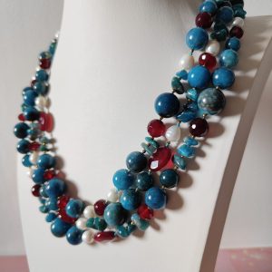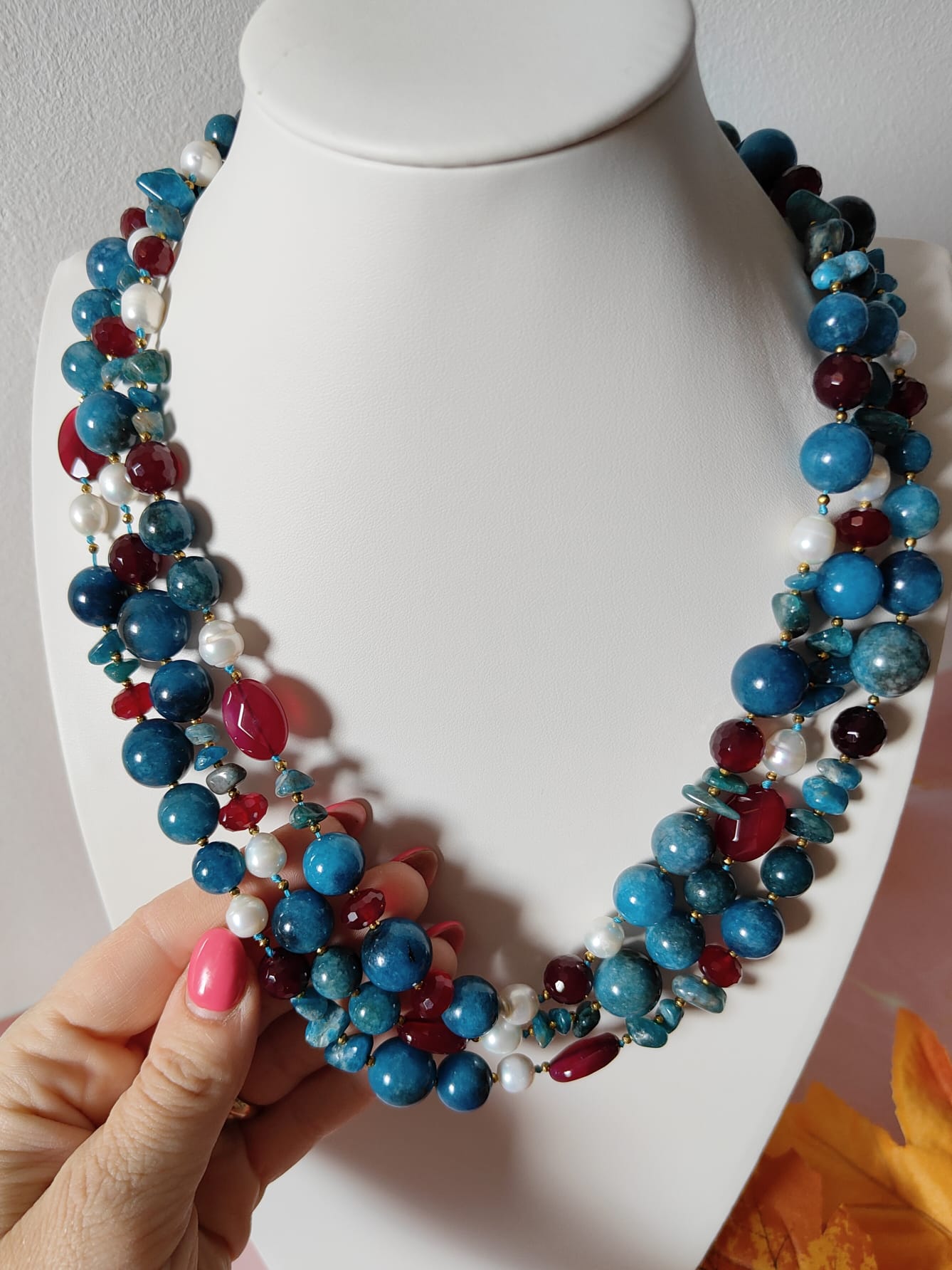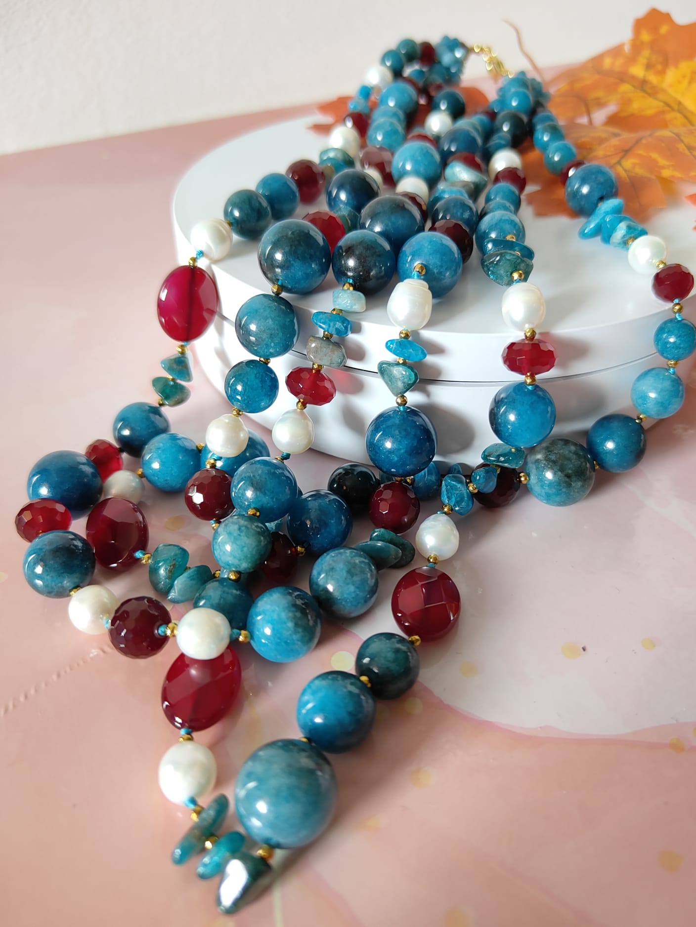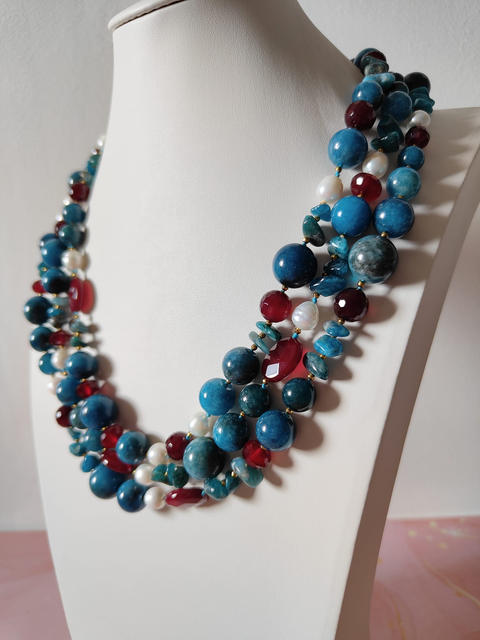 La collana apatite e agata è una creazione artigianale pensata per chi ama gioielli d’impatto, capaci di fondere la forza delle pietre naturali con la delicatezza delle perle. La sua struttura multifilo, arricchita da un’armonia di colori, avvolge il collo con eleganza e personalità, trasformando ogni outfit in un’espressione di stile unico.
