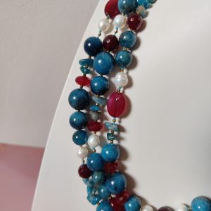 Le perle naturali, simbolo di purezza ed eleganza, completano la composizione con la loro luce soffusa. Si inseriscono tra le pietre colorate per donare armonia, rendendo questa collana versatile e perfetta anche per occasioni formali.