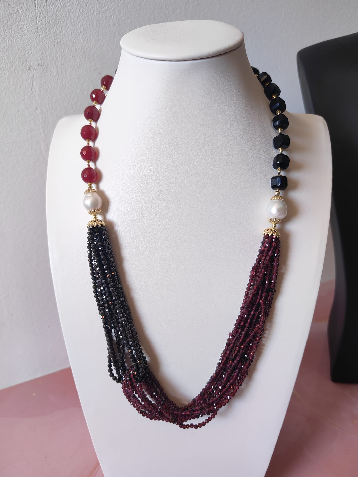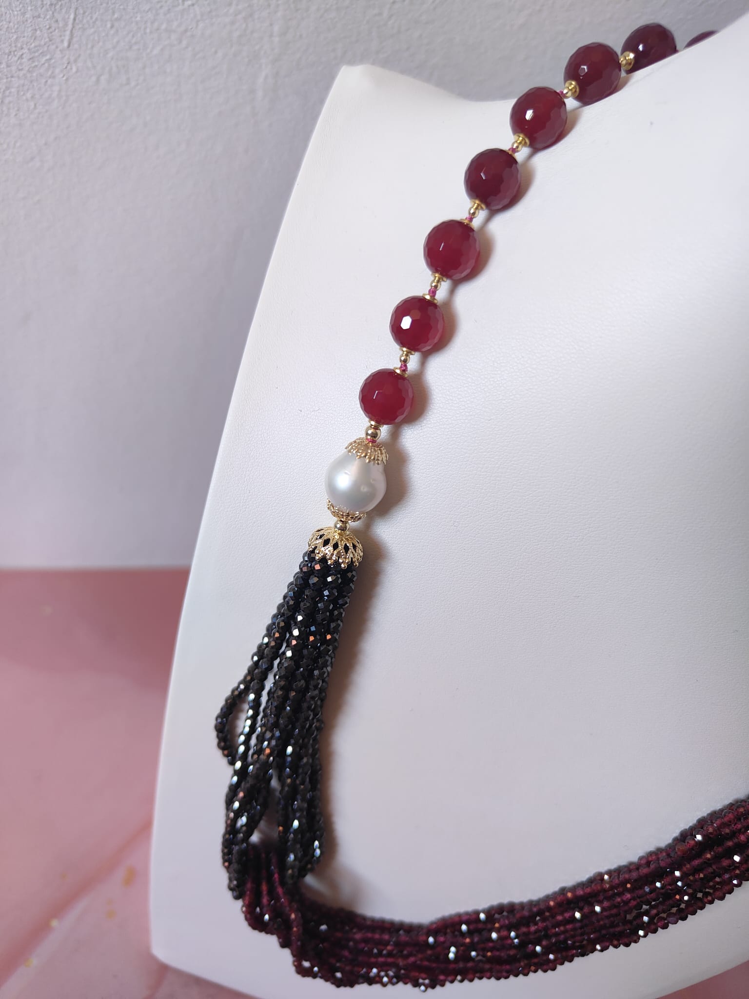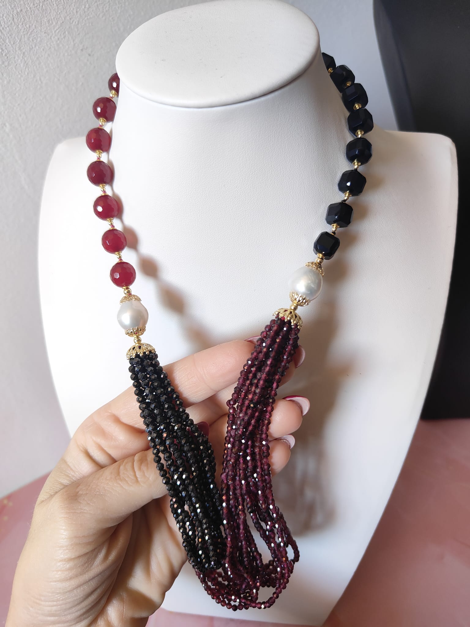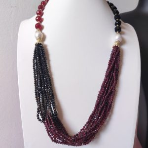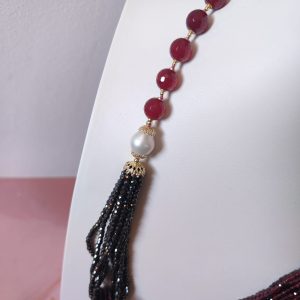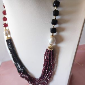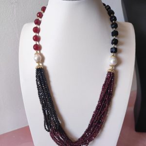 Materiali: agata borgogna, onice nero, zirconi neri, granato, perle naturali, argento 925 placcato oro.