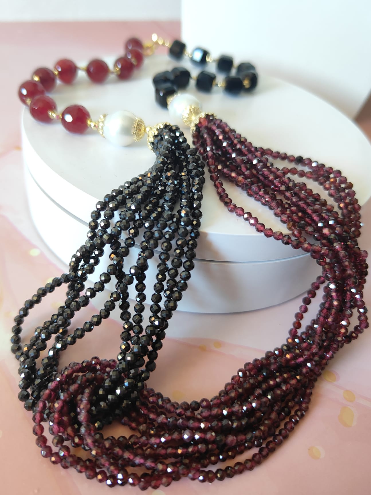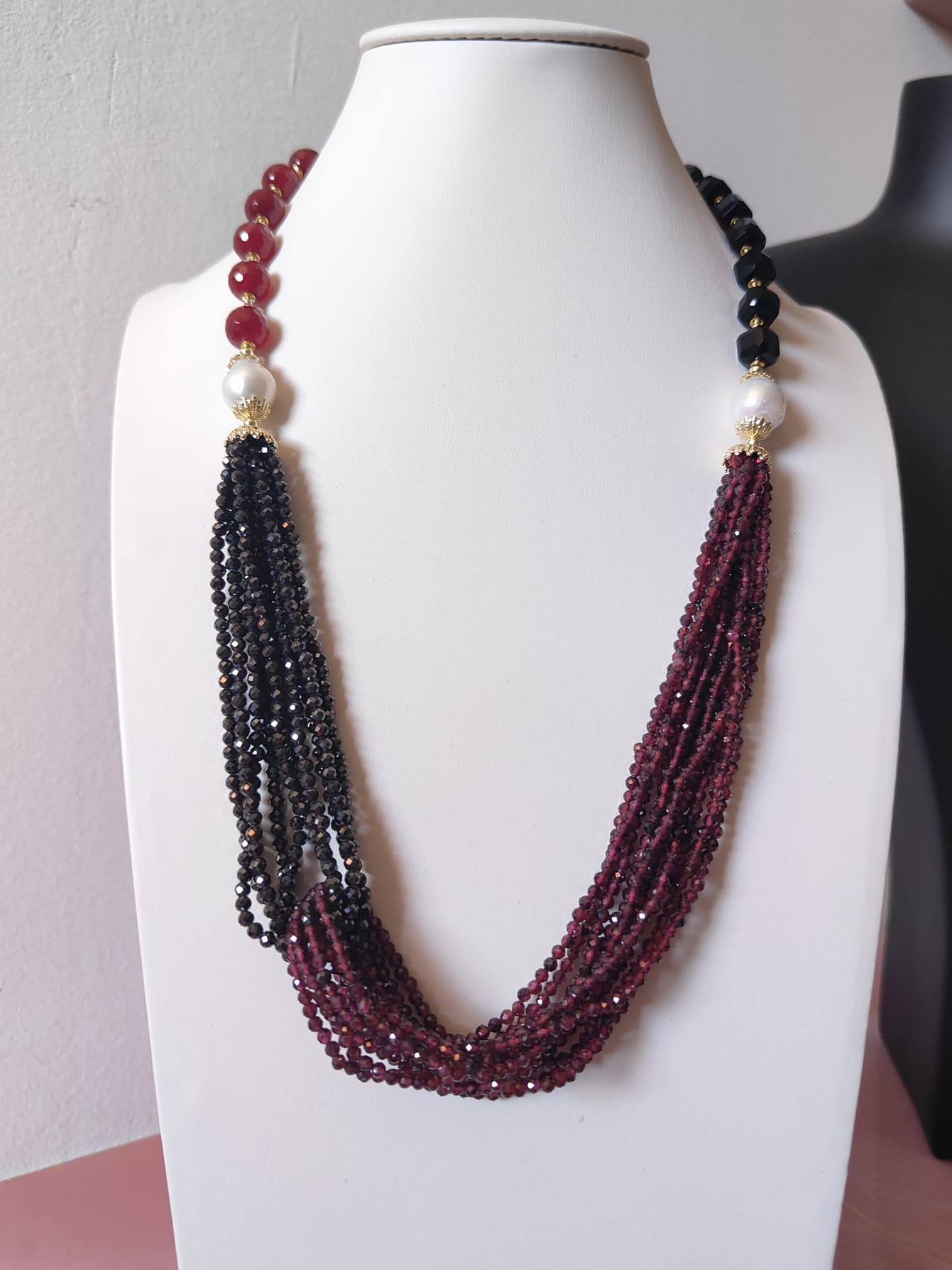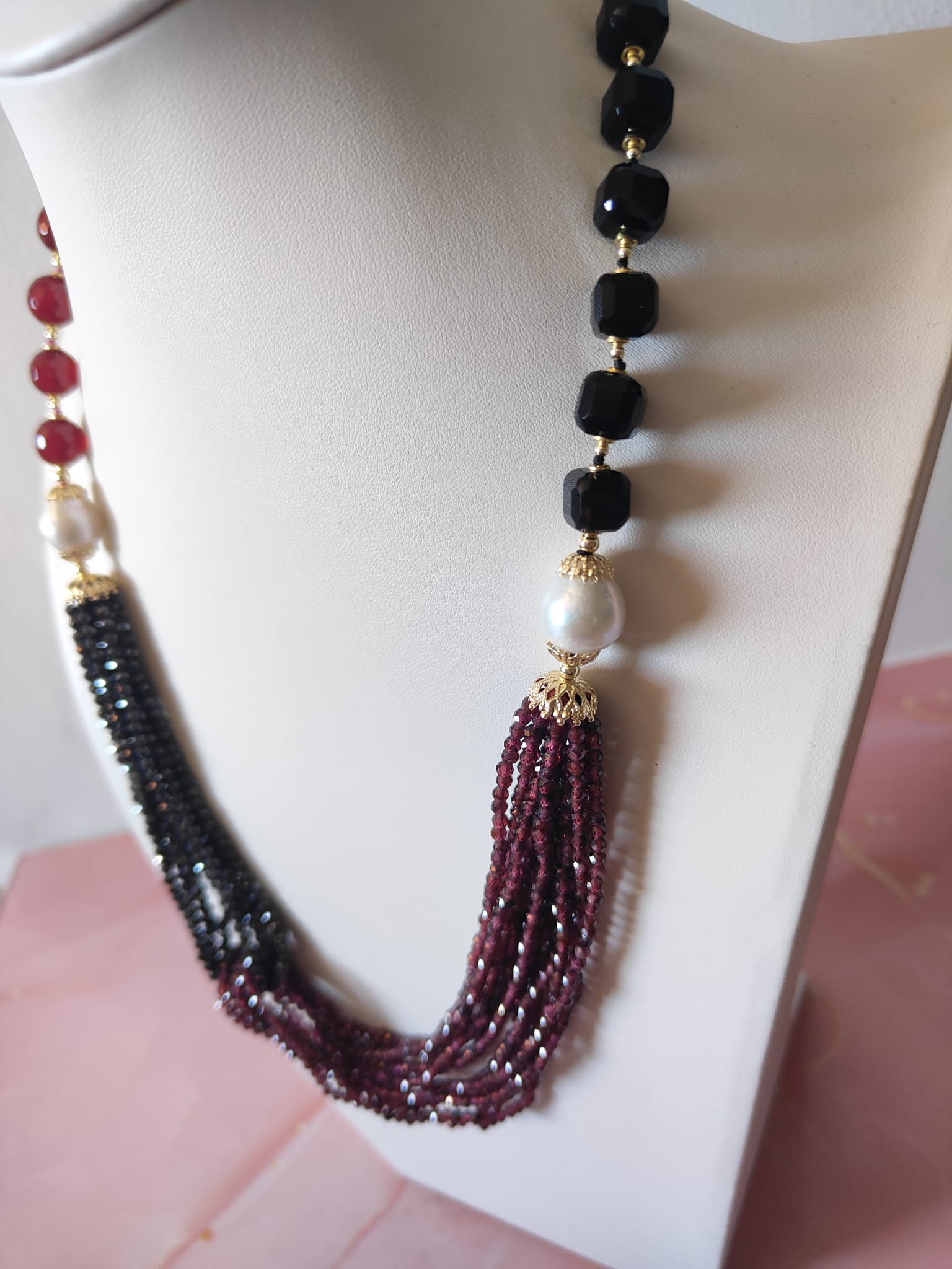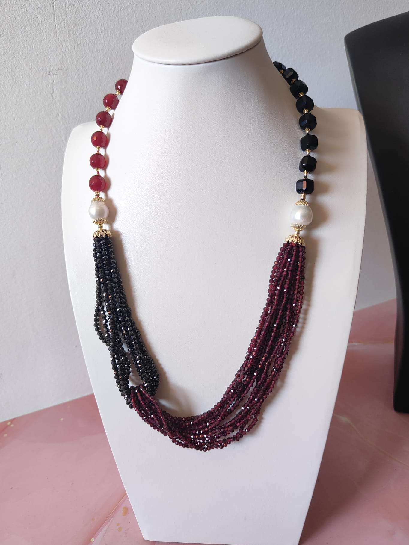 Materiali: agata borgogna, onice nero, zirconi neri, granato, perle naturali, argento 925 placcato oro.