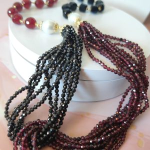 Le sfere di agata borgogna e onice nero, alternate da piccoli inserti dorati, si fondono in un disegno dinamico e raffinato. Nella parte centrale, fili multipli di zirconi e granato si intrecciano in un effetto luminoso e cangiante. Il risultato è un gioiello che cattura la luce a ogni movimento, perfetto per impreziosire un abito da sera ma anche per dare carattere a un look quotidiano.