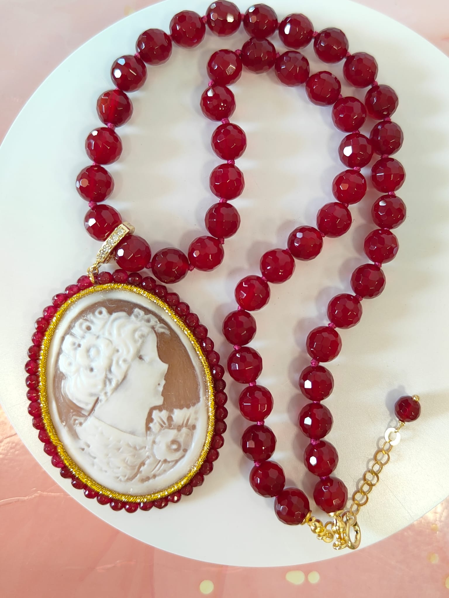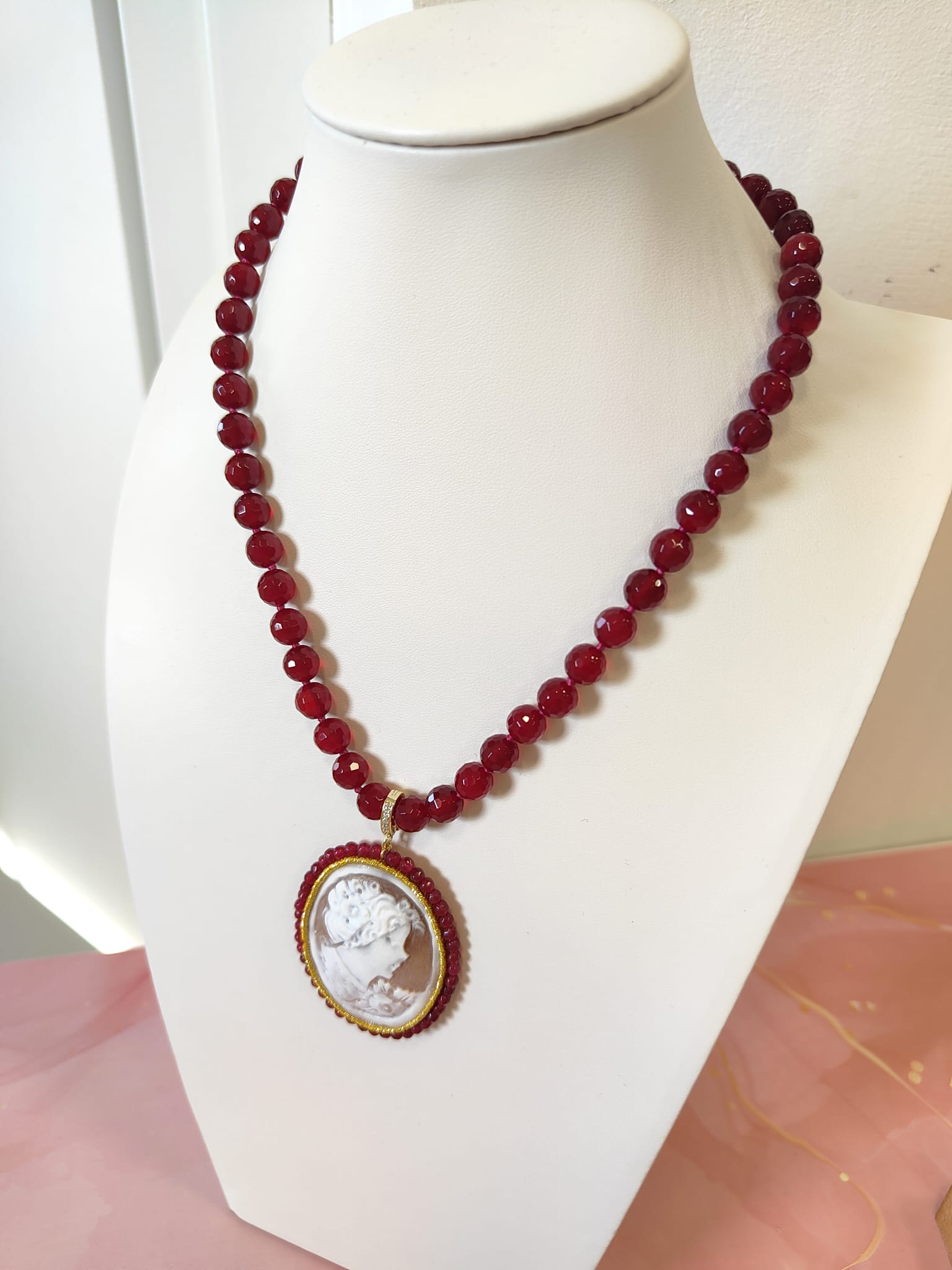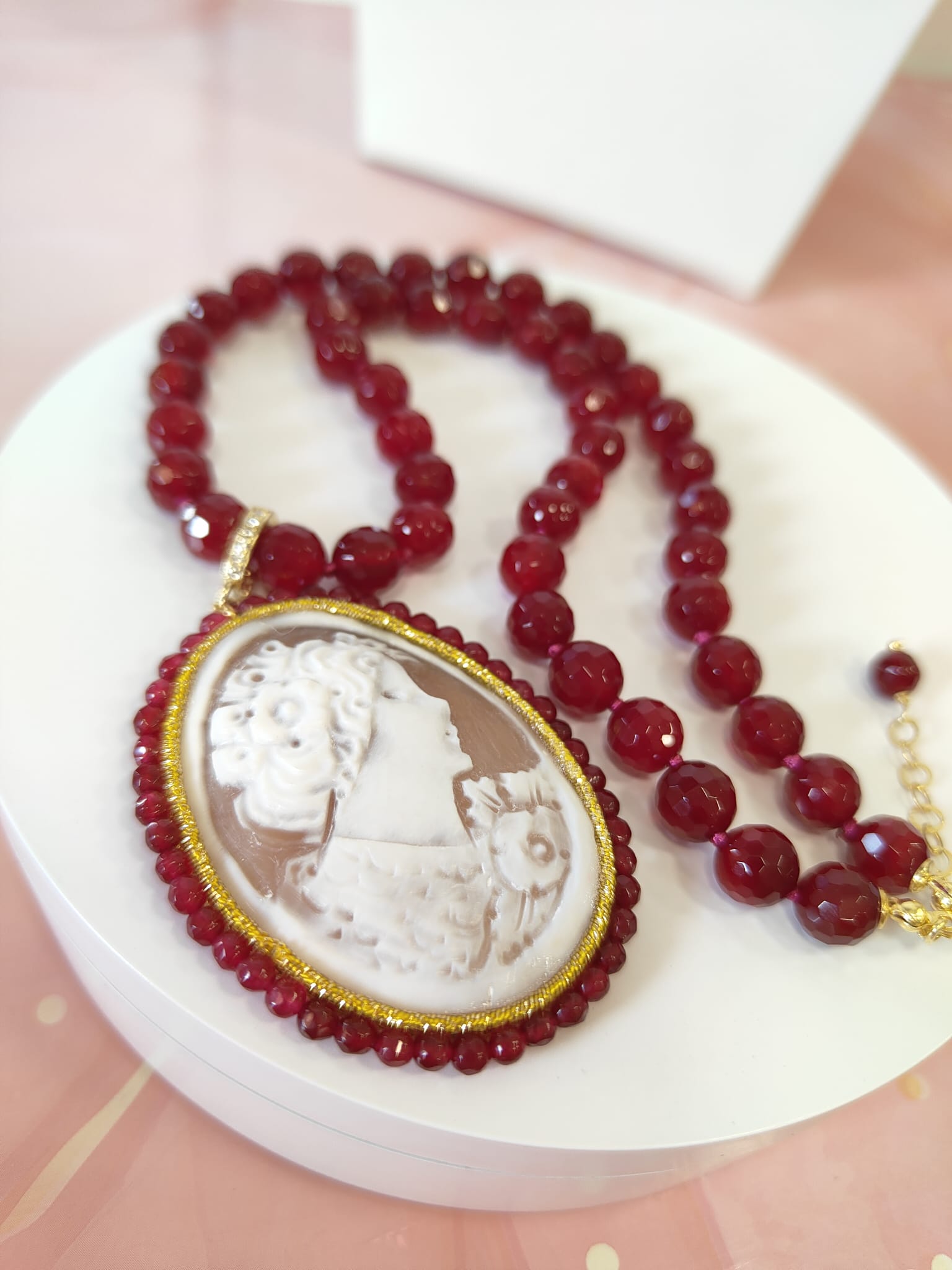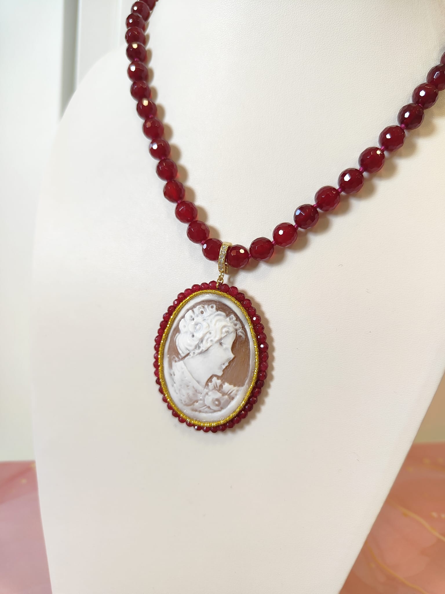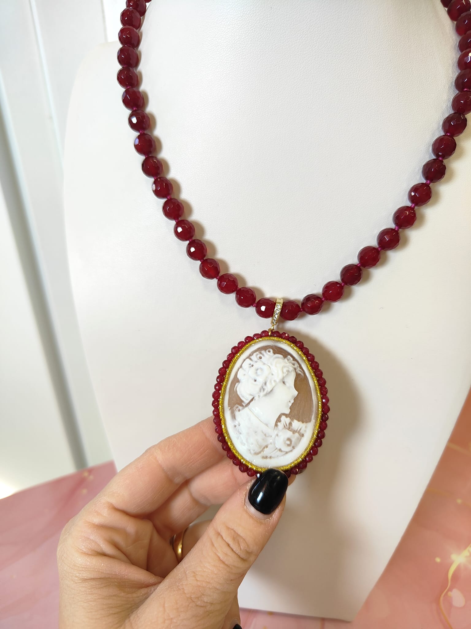 Elegante collana cammeo borgogna in agata annodata a mano, con pendente in cammeo sardonico inciso e chiusura in argento 925 placcato oro.